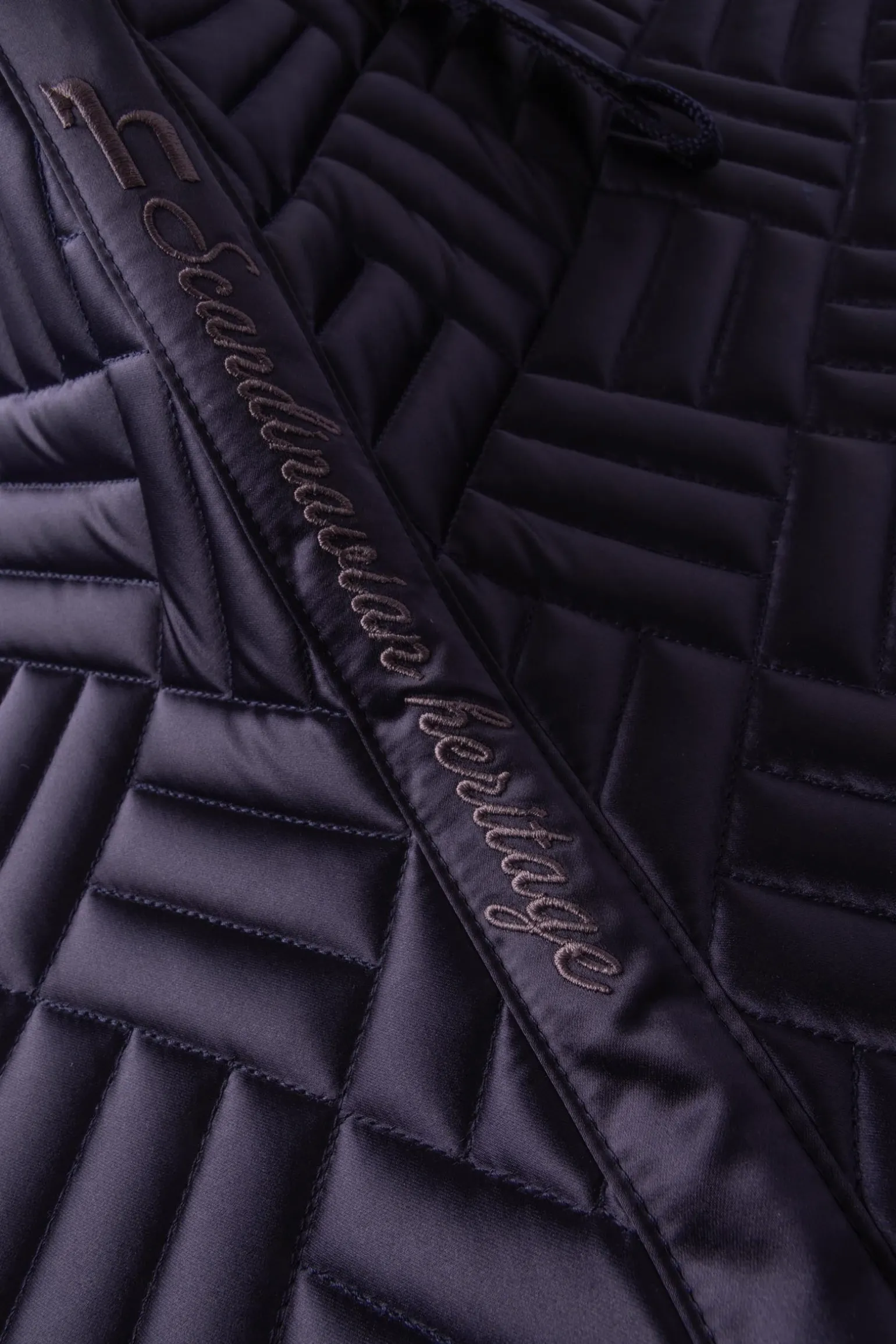 Diese elegante Dressurschabracke kombiniert modernes Design mit erstklassiger Funktionalität. Die neue quadratische Steppung verleiht einen stilvollen Look und sorgt für eine gleichmäßige Druckverteilung. Der abnehmbare lange Frontgurt und der verstellbare untere Gurtbandriemen gewährleisten einen sicheren und individuell anpassbaren Sitz. Die anatomische Rückenlinie entlastet die Wirbelsäule für optimalen Komfort, während die weiche Polsterung ein angenehmes Reitgefühl bietet. Eine dezente Horze-Logo-Stickerei entlang der Wirbelsäule setzt einen edlen Akzent. Die doppelte Kordelverzierung rundet das elegante Design ab und macht diese Schabracke zur perfekten Wahl für Training und Turnier.