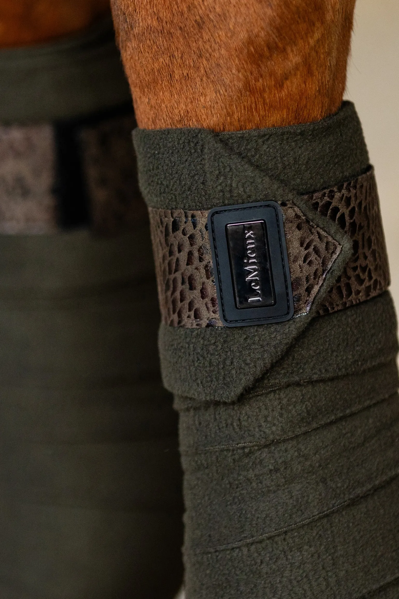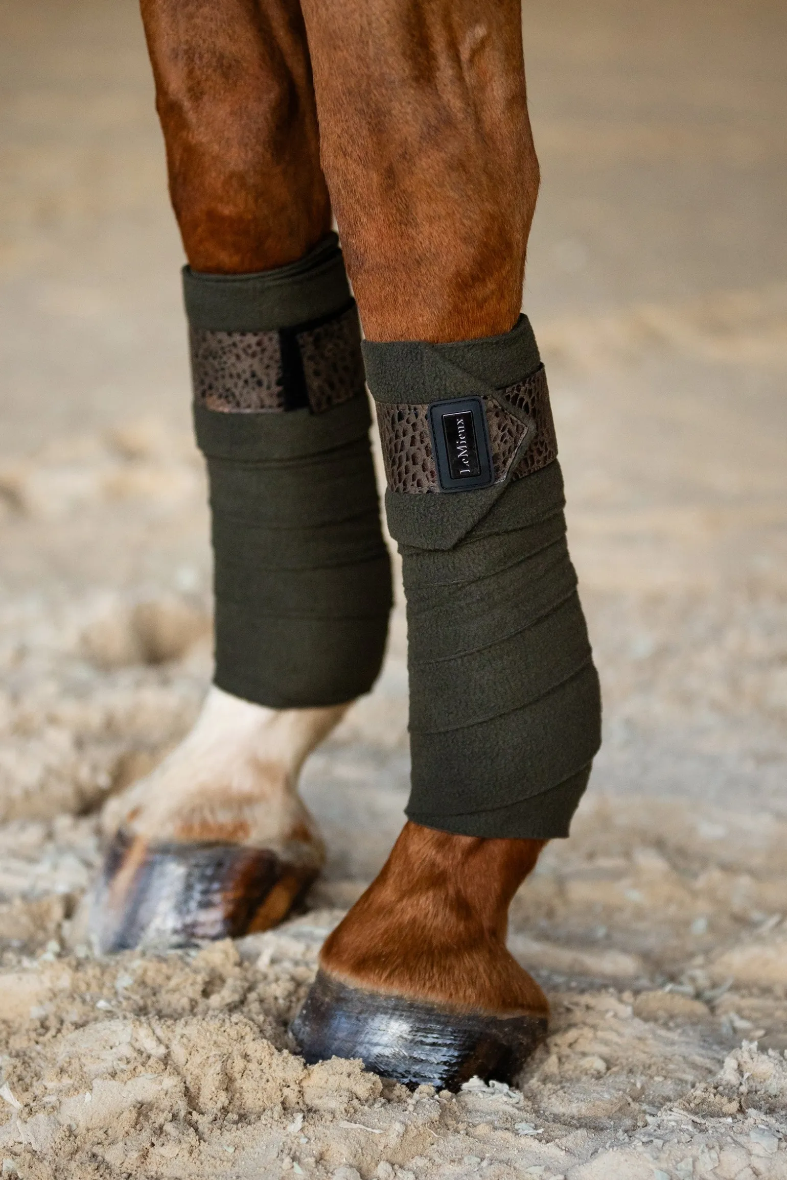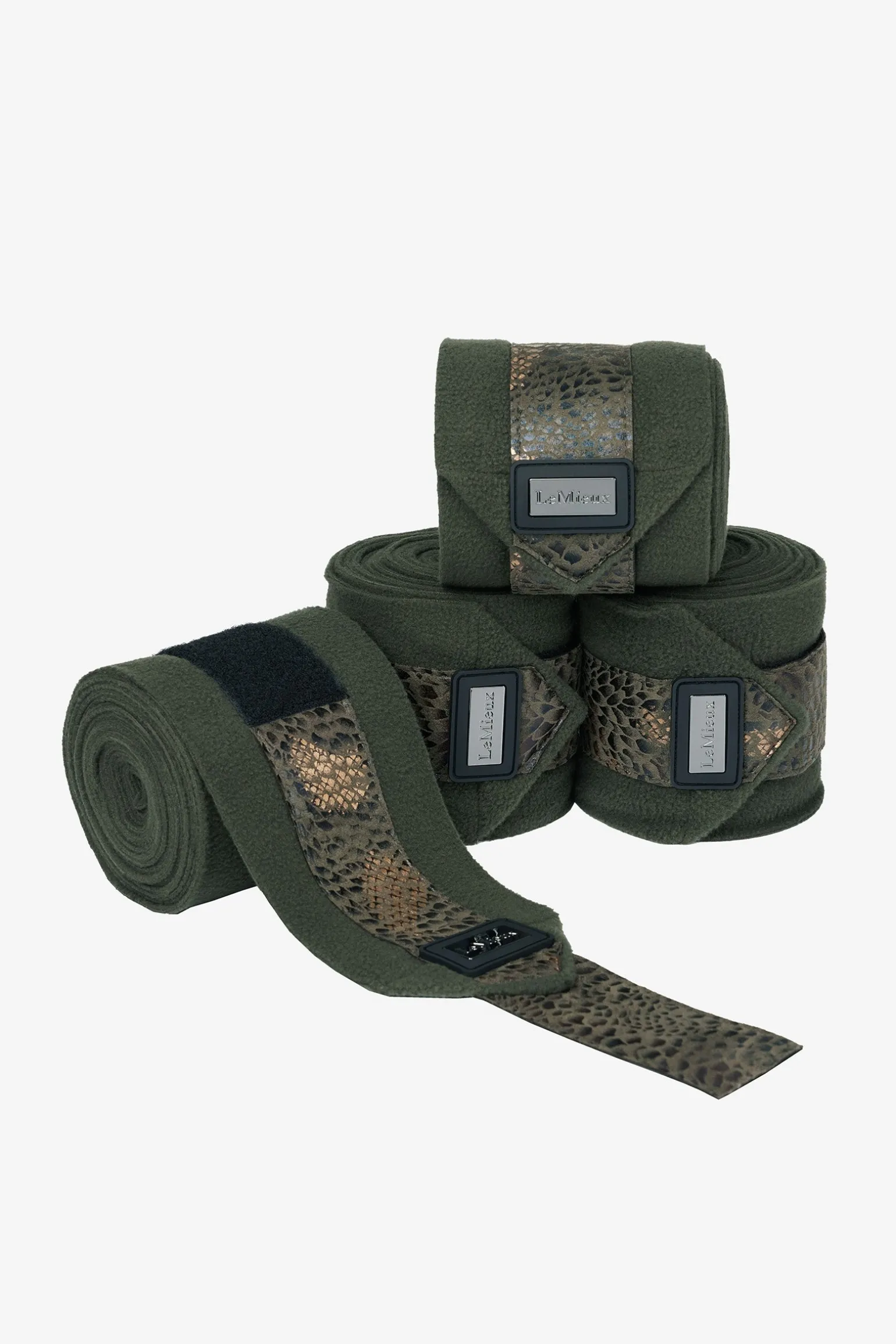 Sie verfügen über eine metallische Enddetaillasche mit passendem metallischem Aufdruck und Abzeichen. Sie werten Ihren Look auf und bieten Ihrem Pferd gleichzeitig lang anhaltenden Halt beim Reiten. Sie können diese Bandagen einzeln oder mit LeMieux-Unterbandeinlagen für zusätzlichen Schutz verwenden.