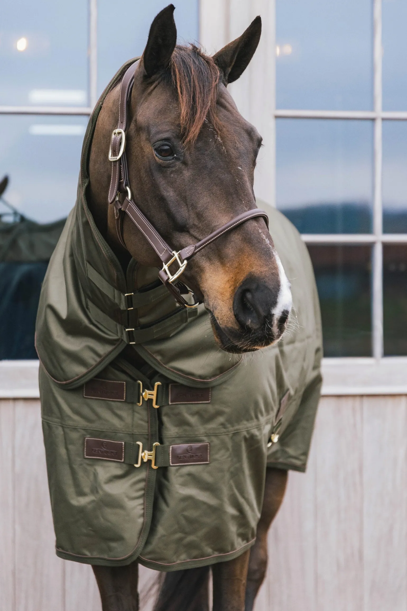 Die Turnout Rug All Weather hat zwei Frontverschlüsse an der Brust, eine Bauchkreuzbegurtung und einem Schweifriemen mit einem Hygieneüberzug.