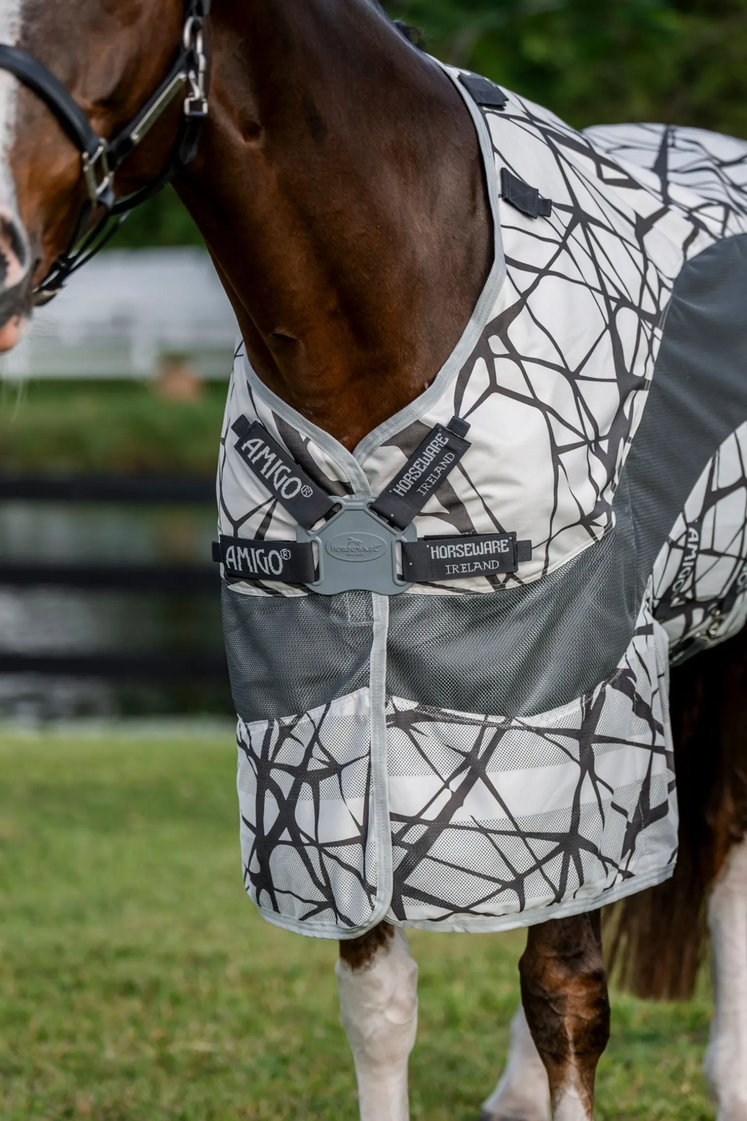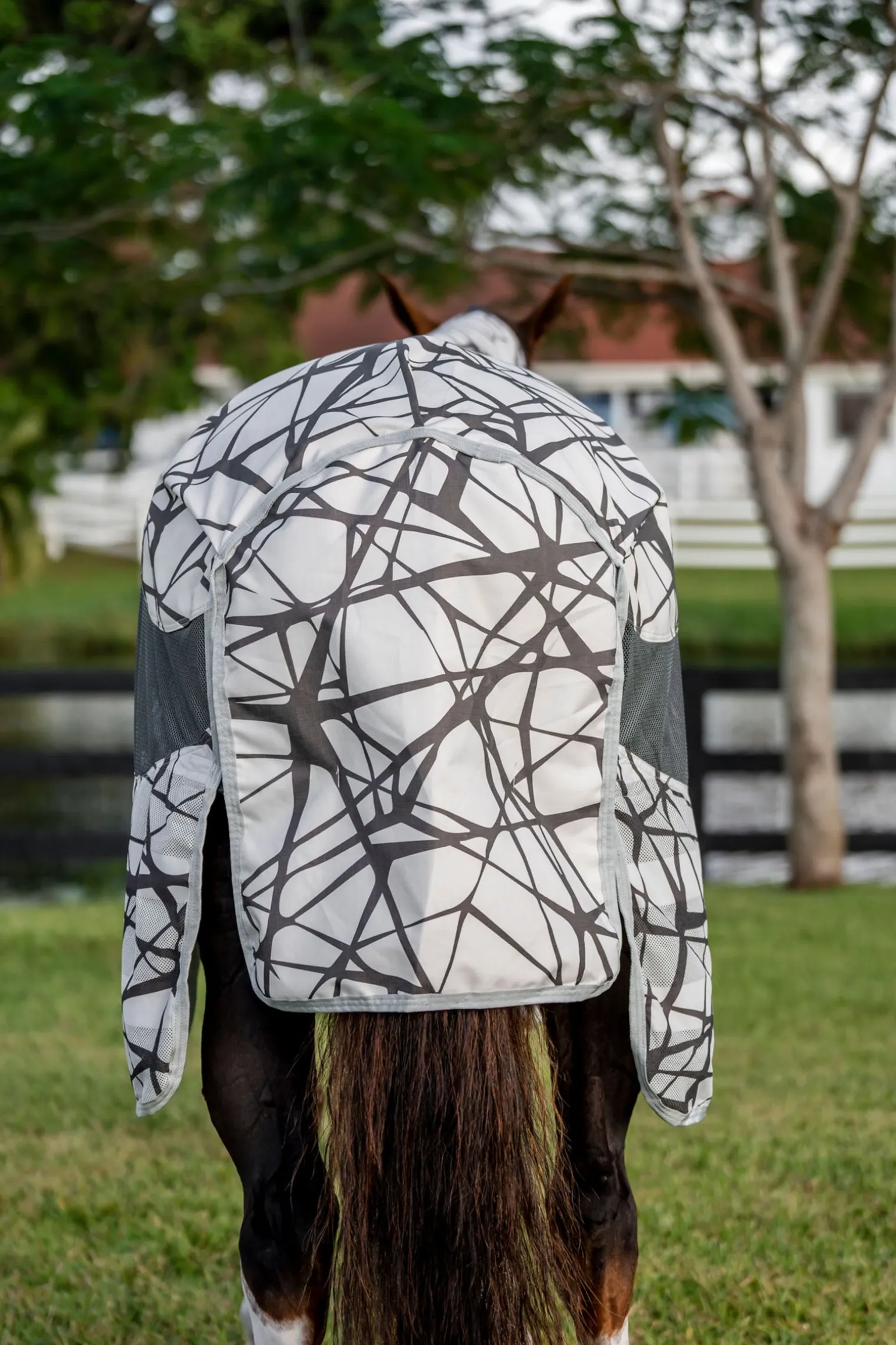 Das von der Natur inspirierte Muster der CamoFly Fliegendecke verfügt über ein einzigartiges Tarnmuster und ein leichtes Design, das vor UV-Strahlung schützt, und bringt den Fliegenschutz auf ein völlig neues Niveau! Das Muster der Decke, das an Zebrastriche erinnert, tarnt dein Pferd vor lästigen Insekten und Fliegen. Untersuchungen haben gezeigt, dass das Zebrastreifenmuster Fliegen verwirrt und als natürliche Abwehr dient, indem es eine optische Täuschung im Auge der Fliege erzeugt und die Silhouette des Pferdes verzerrt. Die Insekten haben nun Schwierigkeiten, dein Pferd als Ziel zu erkennen und wissen nicht, wo sie landen sollen. Der leichte obere Bereich ist wasserdicht und die atmungsaktiven Seitenteile bestehen aus Mesh. Diese Decke ist die perfekte Wahl für das feuchte Frühlings- und Herbstwetter, wenn die Temperaturen kühler sind, die Fliegen aber immer noch eine Plage darstellen. Ein abnehmbares Halsteil bietet durchgehenden Schutz, während der Disc-Verschluss, der tiefe Schnitt und das für Glanz sorgende Futter im Schulter-, Mähnen- und Schweifbereich den Komfort deines Pferdes erhöhen. Der abwaschbare Schweifriemen ist außerdem besonders pflegeleicht. Diese stilvolle Fliegendecke ist eine fantastische Ergänzung zur Pferdegarderobe im Kampf gegen Fliegen und stechende Insekten.