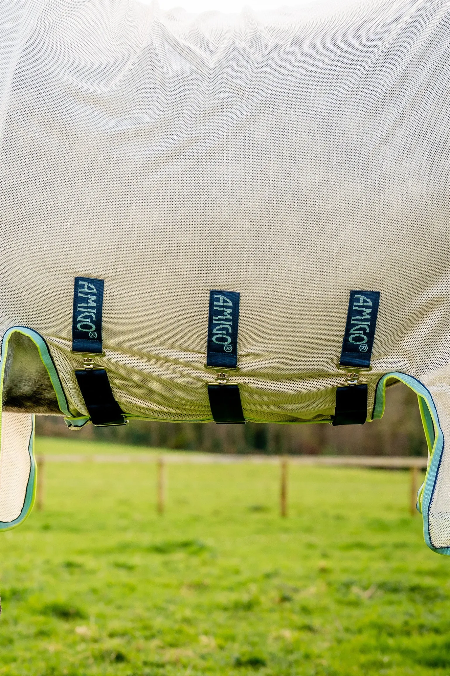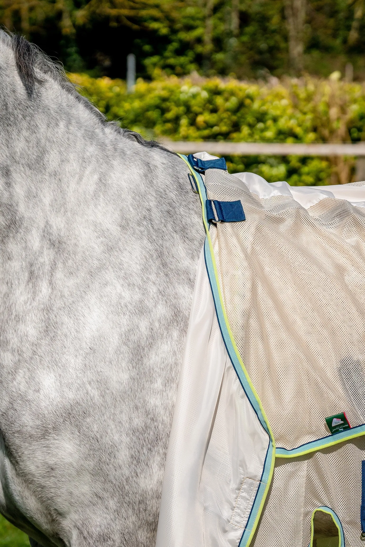 Das abnehmbare Halsteil mit verbesserter Passform stellt sicher, dass dein Pferd auch beim Grasen sicher abgedeckt ist. Dank der integrierten Liner-Laschen kann diese Decke mit dem wasserdichten Fly Rug Liner kombiniert werden. Auf diese Weise kannst du dein Pferd im Sommer, aber auch in anderen Jahreszeiten schützen, in denen Insektenstiche ein Problem sein können. Eine Fliegenmaske ist separat erhältlich.