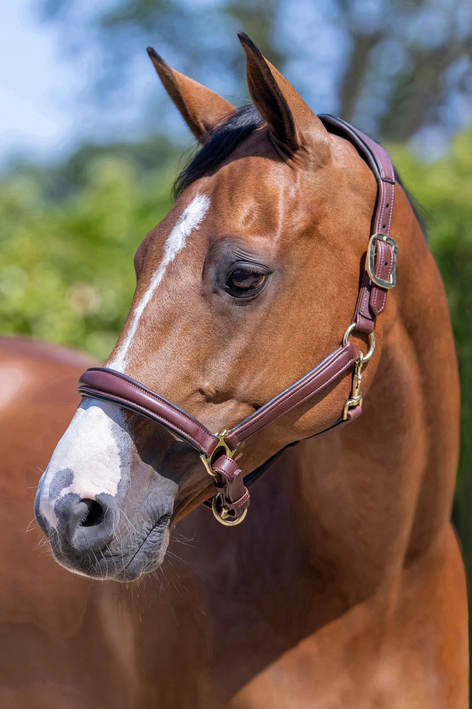 Die soliden Metallbeschläge, der unterlegte Kehlriemen und die gepolsterten Backenstücke verleihen dem klassischen Halfter einen Hauch von Luxus.