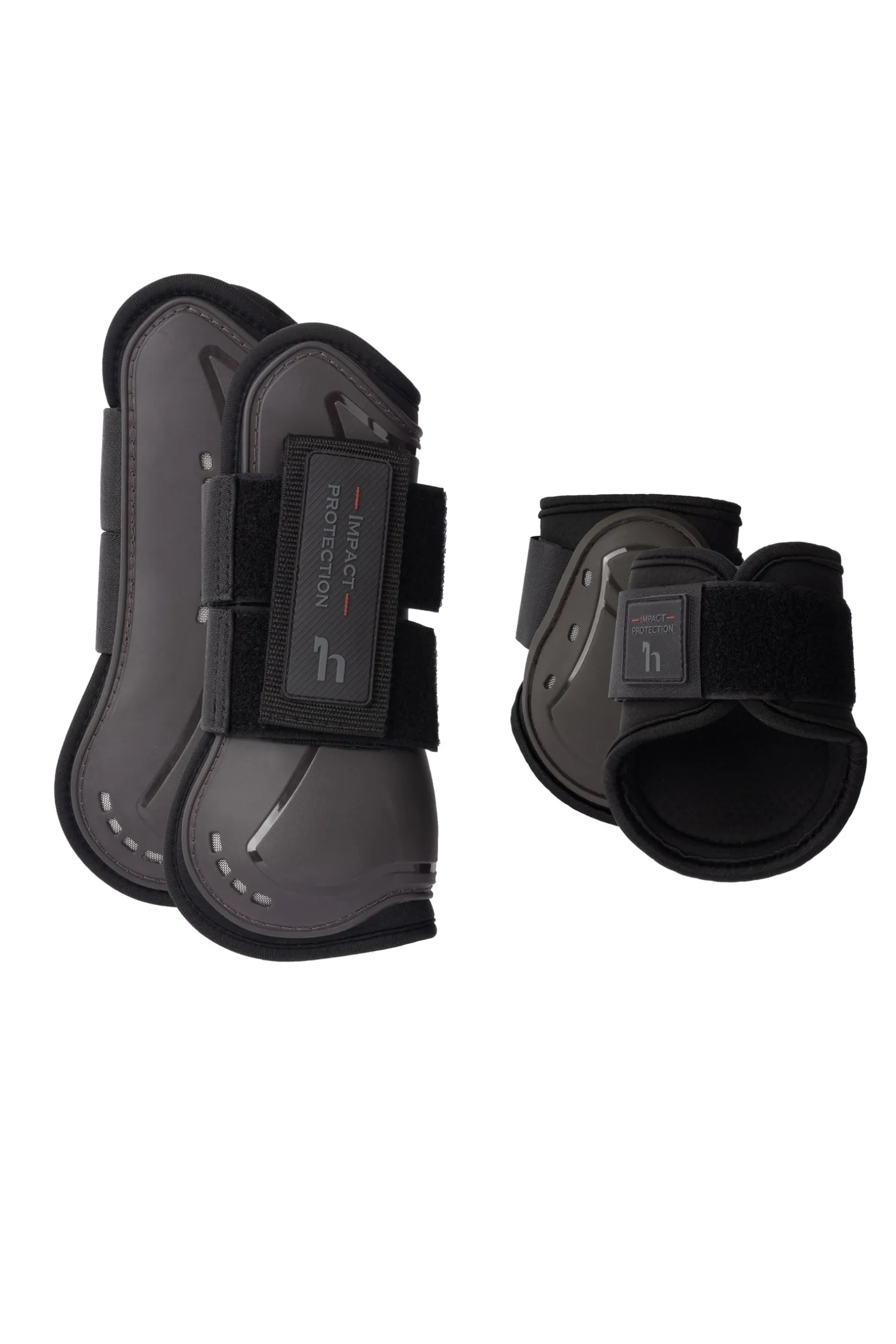 Hochwertiges Gamaschen-Set, bestehend aus Gamaschen und Streichkappen, mit Horze Logo.