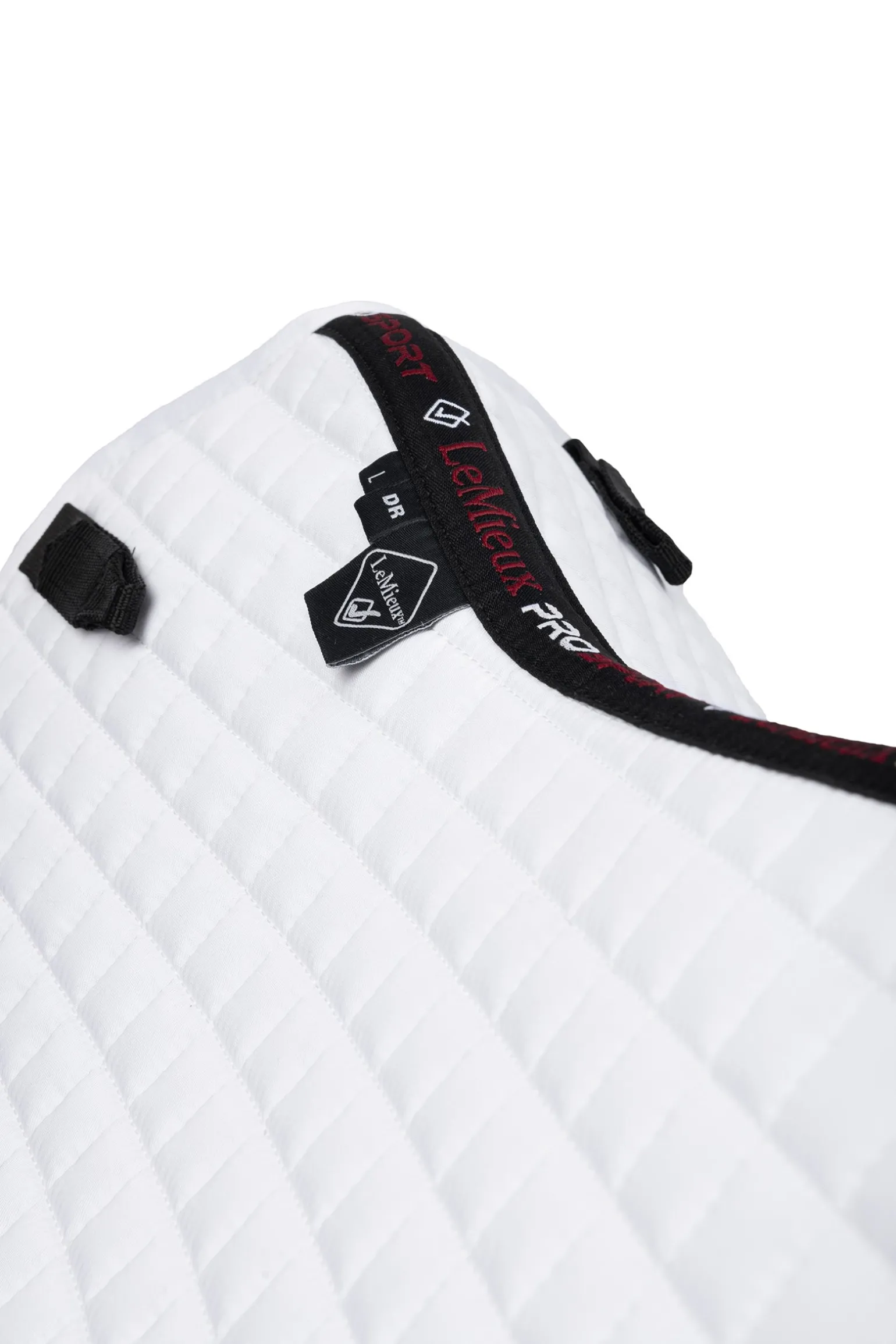 Modisches und strapazierfähiges Pad für maximale Leistung des Materials, für das tägliche Training oder Turniereinsätze geeignet. Premium Baumwolle außen und Fütterung für Temperaturregelung und Atmungsaktivität. Klassischer Dressur-Schnitt mit hohem Widerrist, elastischen D-Ringen & Gurt-Schutz mit innen versteckten Schlaufen um ein Rutschen zu verhindern. Gut in der Maschine zu waschen.