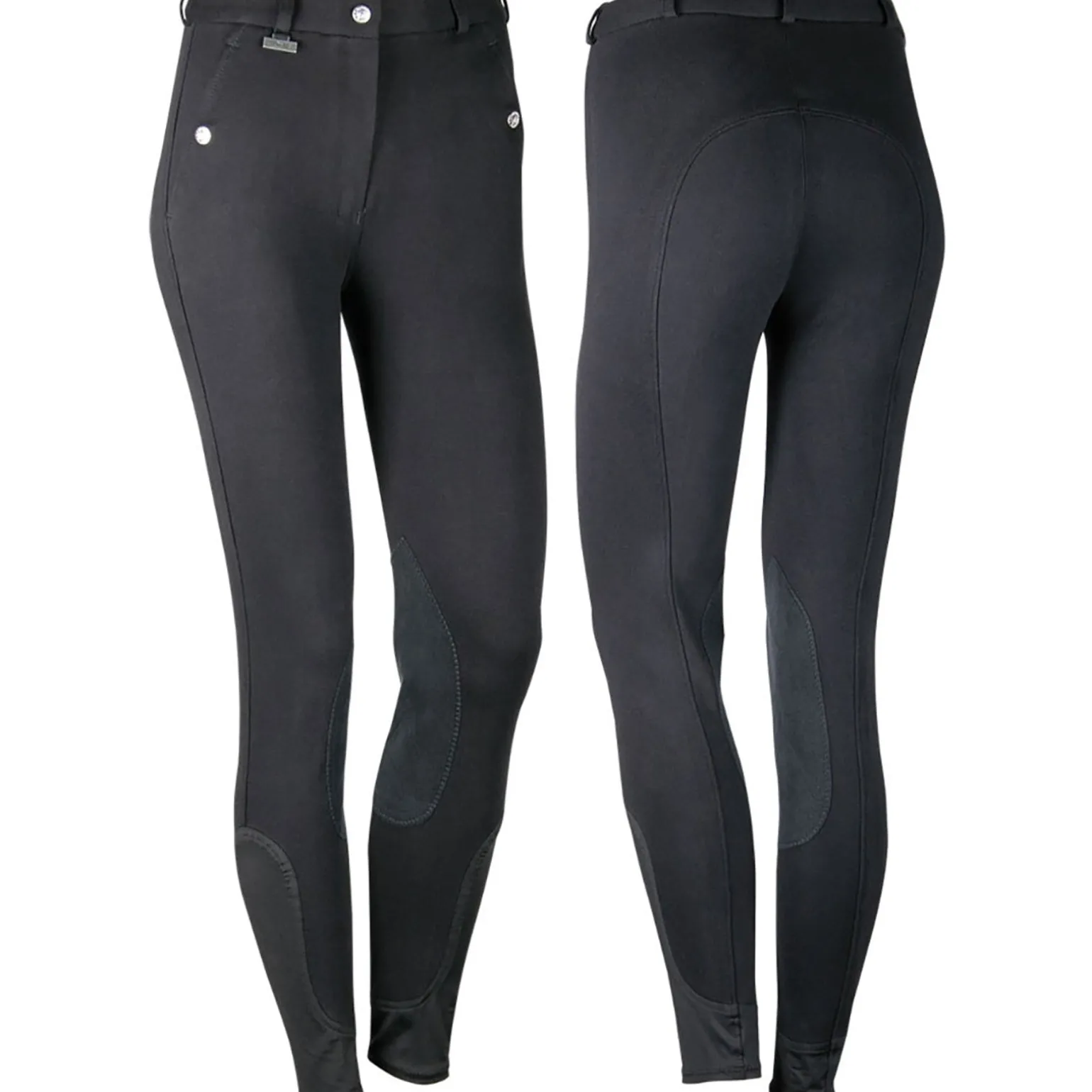 Reithose mit Schiebeverschluss, Reißverschluss, Druckknopftaschen, Gürtelschlaufen und elastischen Beinen.