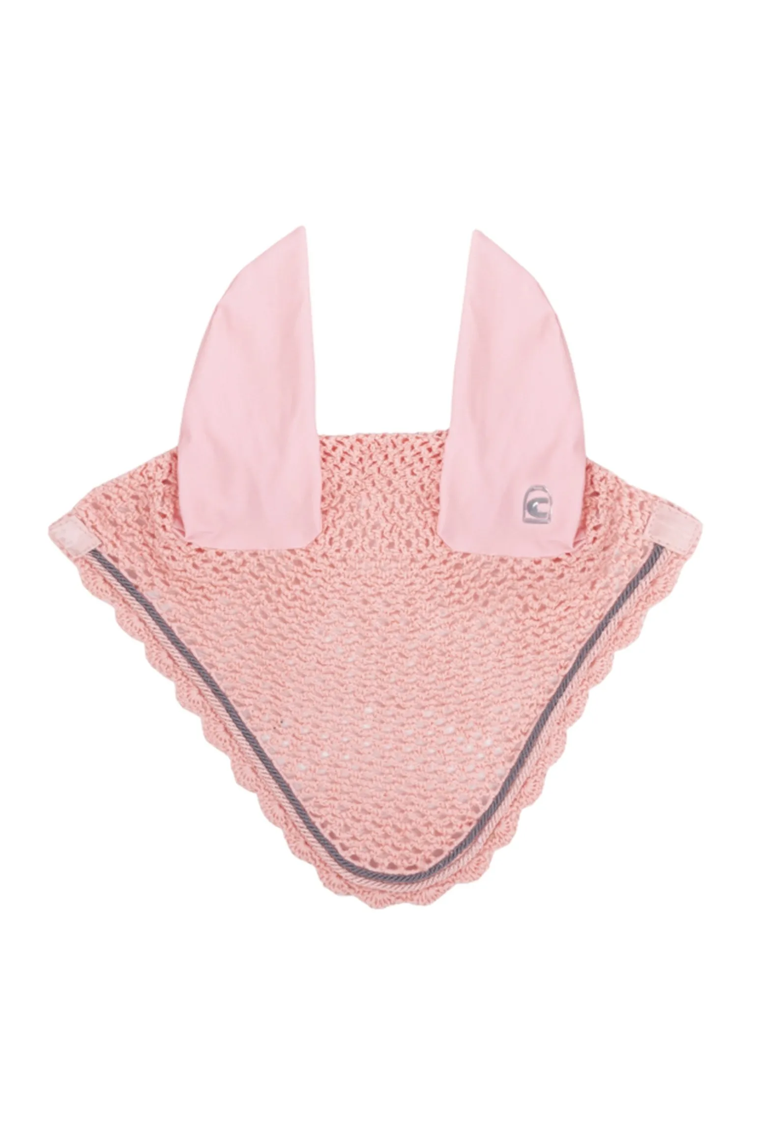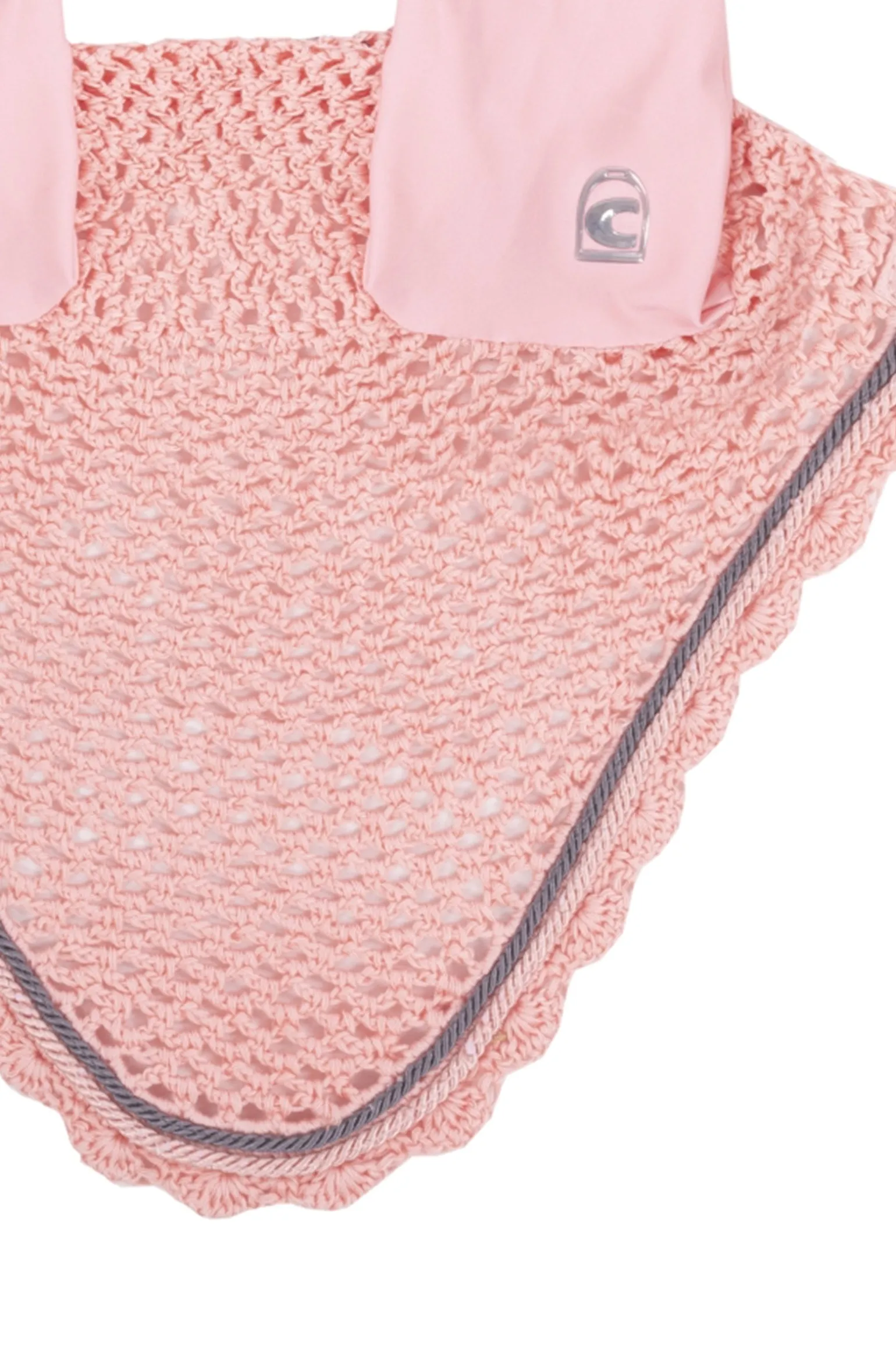 Das linke Ohr ist mit dem Cavallo Steigbügellogo bedruckt. Kopfbereich in Häkeloptik. Zwei kleine, kontrastfarbige Kordeln rahmen die Fliegenohren ein.