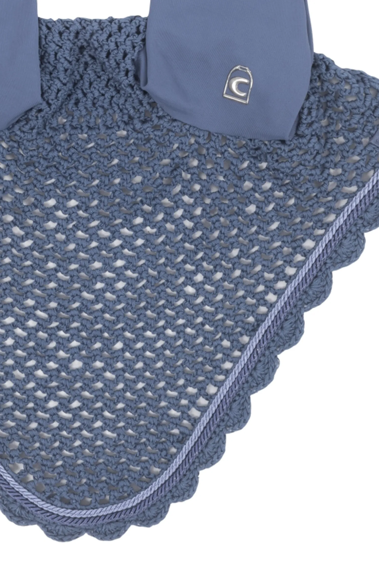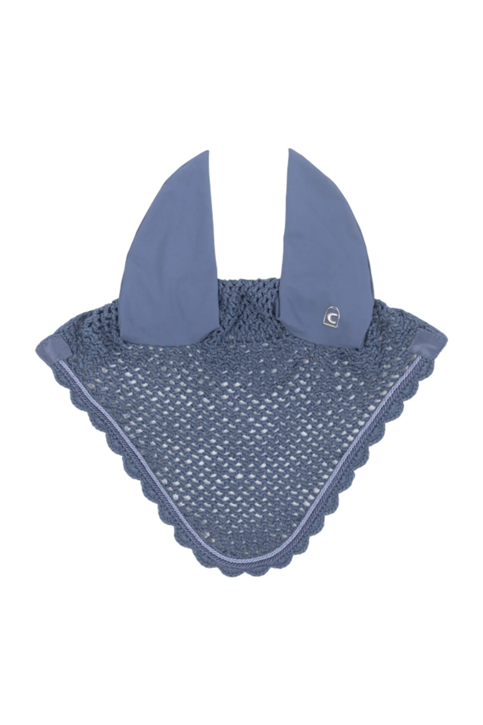 Das linke Ohr ist mit dem Cavallo Steigbügellogo bedruckt. Kopfbereich in Häkeloptik. Zwei kleine, kontrastfarbige Kordeln rahmen die Fliegenohren ein.