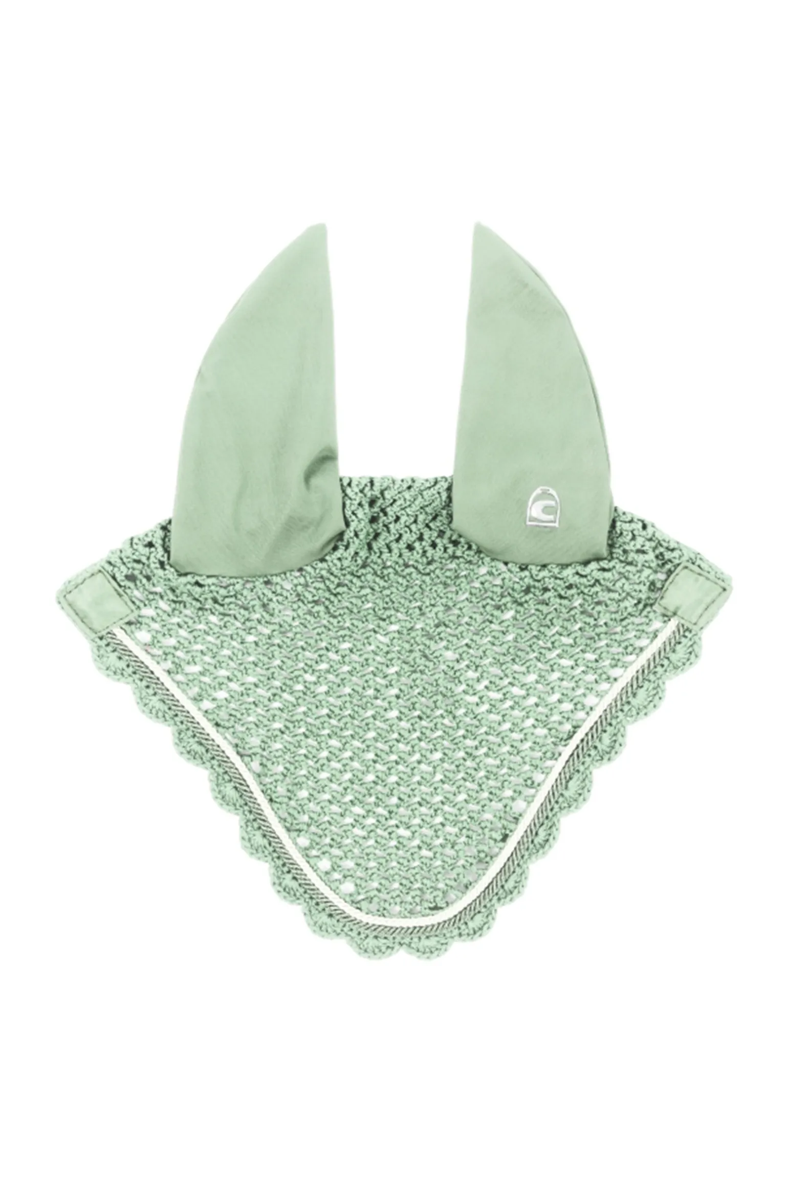 Das linke Ohr ist mit dem Cavallo Steigbügellogo bedruckt. Kopfbereich in Häkeloptik. Zwei kleine, kontrastfarbige Kordeln rahmen die Fliegenohren ein.