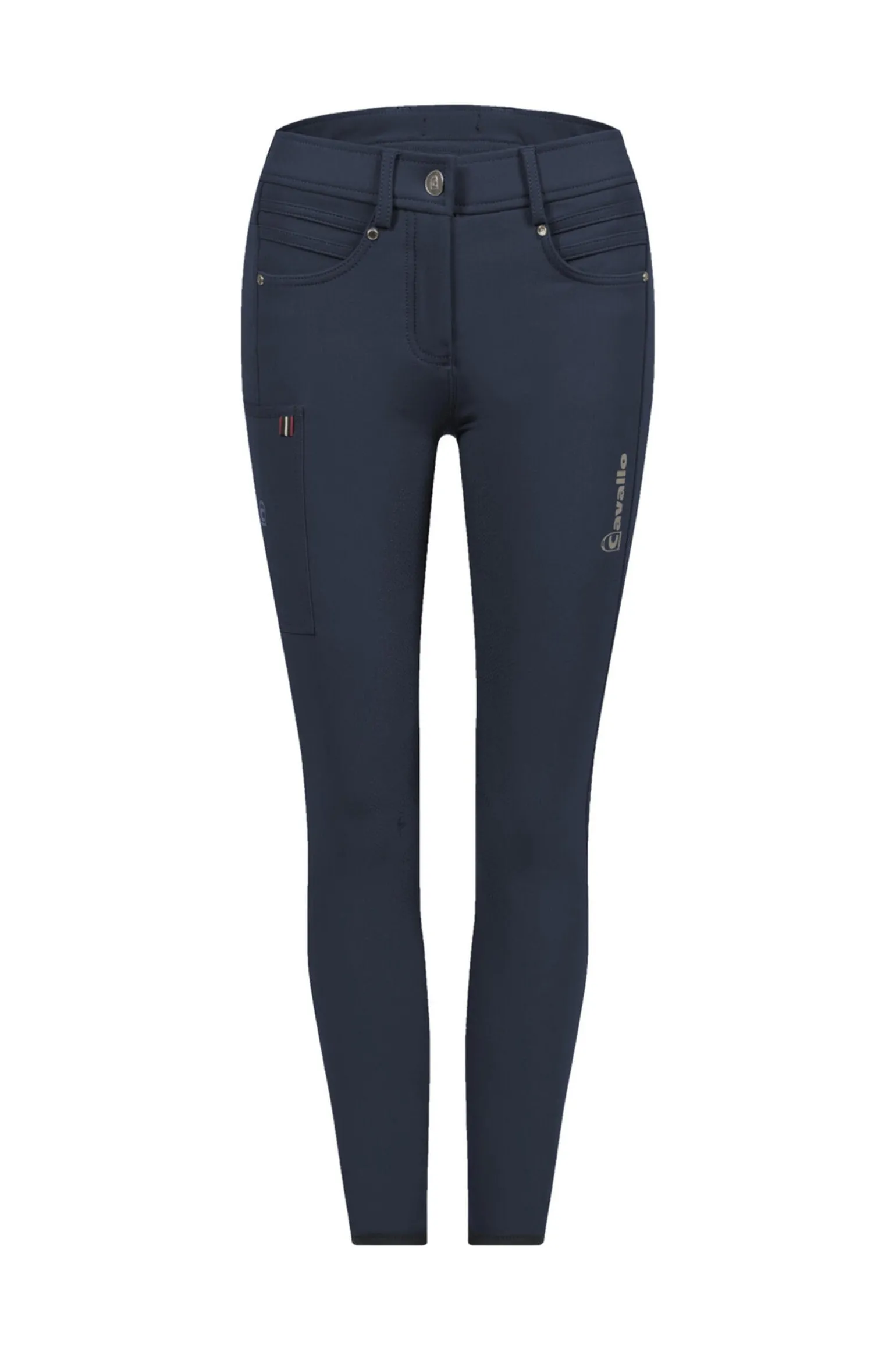 Sportliche Reithose im 5-Taschen-Design. Zwei bequeme Fronttaschen sind mit funkelnden Kristallnieten verziert. Die Handytasche hat das typische Cavallo-Streifenband und Steigbügelprint. Eine zusätzliche Reißverschlusstasche hinten bietet Platz zum Verstauen von Wertsachen. Die Hose bietet höchsten Tragekomfort durch den Verzicht auf eine Teilungsnaht am Kniebesatz. Die raffinierte Nahtgestaltung auf der Rückseite der Reithose zaubert eine perfekte, sportliche Figur.