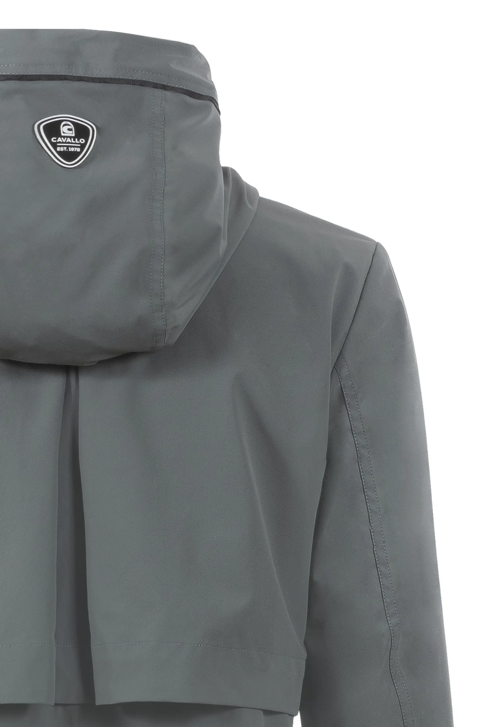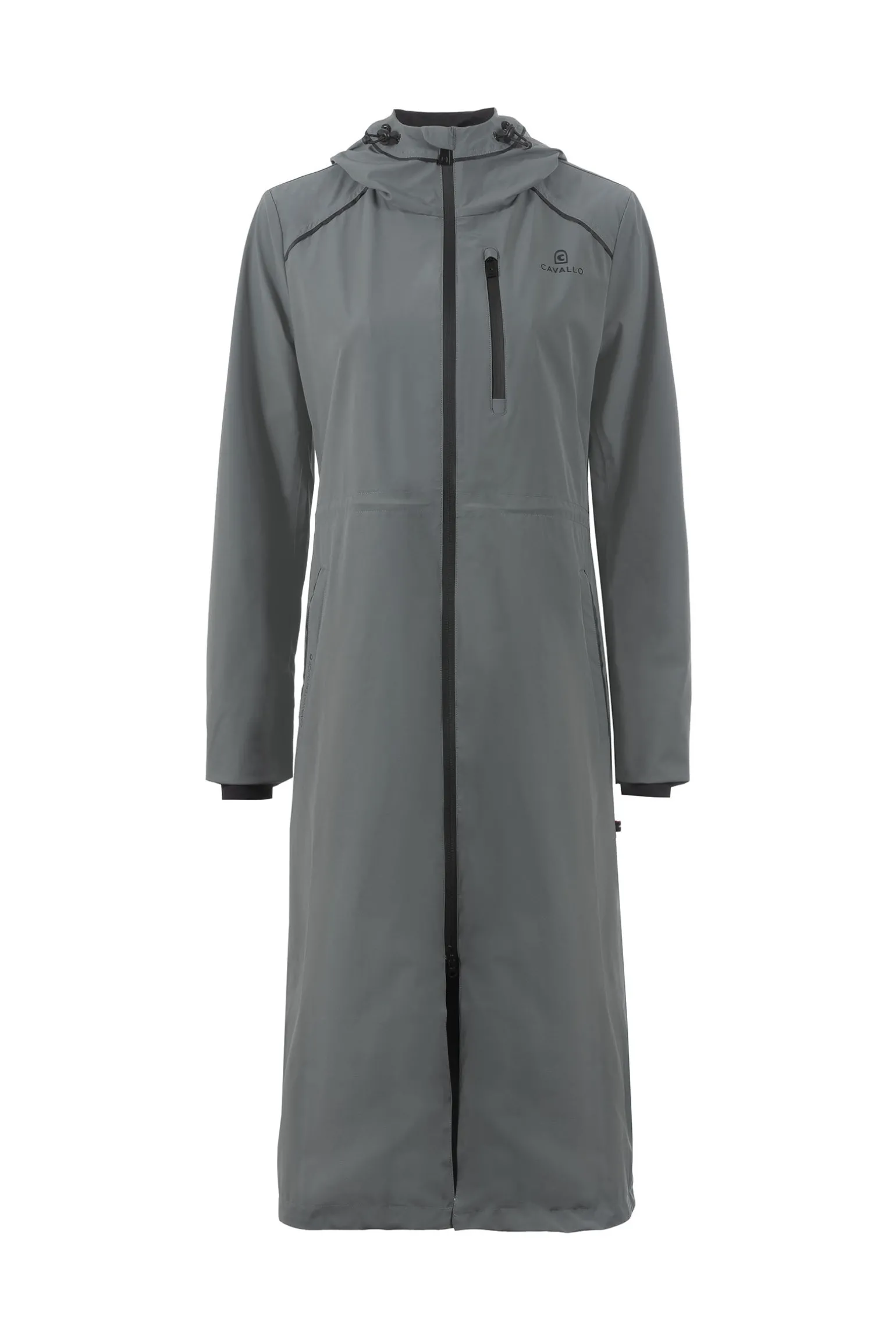 Der Cavallo Cavalnafisa Funktions-Regenmantel ist eine stilvolle und praktische Wahl für nasse Wetterbedingungen. Dieser lange Funktions-Regenmantel verfügt über eine angesetzte Kapuze mit hohem Kragen und einen individuell verstellbaren Kordelzug sowohl in der Kapuze als auch in der Taille für eine optimale Passform. Die Kapuze kann hinten mit einem Cavallo-Druckknopf fixiert werden, während ein hochwertiger Cavallo-Logo-Patch die Rückseite der Kapuze ziert. Für Leistung und Komfort entwickelt, bietet der Mantel einen schwarzen, wasserdichten 2-Wege-Frontreißverschluss, Schlitz-Taschen mit Reißverschluss und eine schmale, schwarze Rippblende für einen eleganten Look. Eine Frontpasse mit passendem Piping verleiht zusätzliche Raffinesse, während der schwarze 3D-Cavallo-Print auf der linken Brust und im Rückenschlitz das charakteristische Design betont. Im Inneren sorgt eine praktische Handytasche für zusätzlichen Komfort, während die Rückenpasse mit großer Kellerfalte und Mesh-Futter eine optimale Luftzirkulation und Bewegungsfreiheit gewährleistet. Der aufwendige Cavallo-Print in Off-White in der Mesh-Fütterung verleiht dem Design eine stilvolle Note. Ein Reißverschluss in der Rückenmitte vom Saum bis zu den Hüften ermöglicht bequemes Tragen beim Reiten, während der Rückenschlitz mit Einsatz und schwarzem Reflexstreifen das Sattelzeug vor Kratzern schützt. Ein schwarzer, reflektierender Cavallo-Print auf der rechten Tasche und eine wasserdichte Brusttasche mit Reißverschluss auf der linken Seite runden diesen hochfunktionalen und eleganten Regenmantel ab.