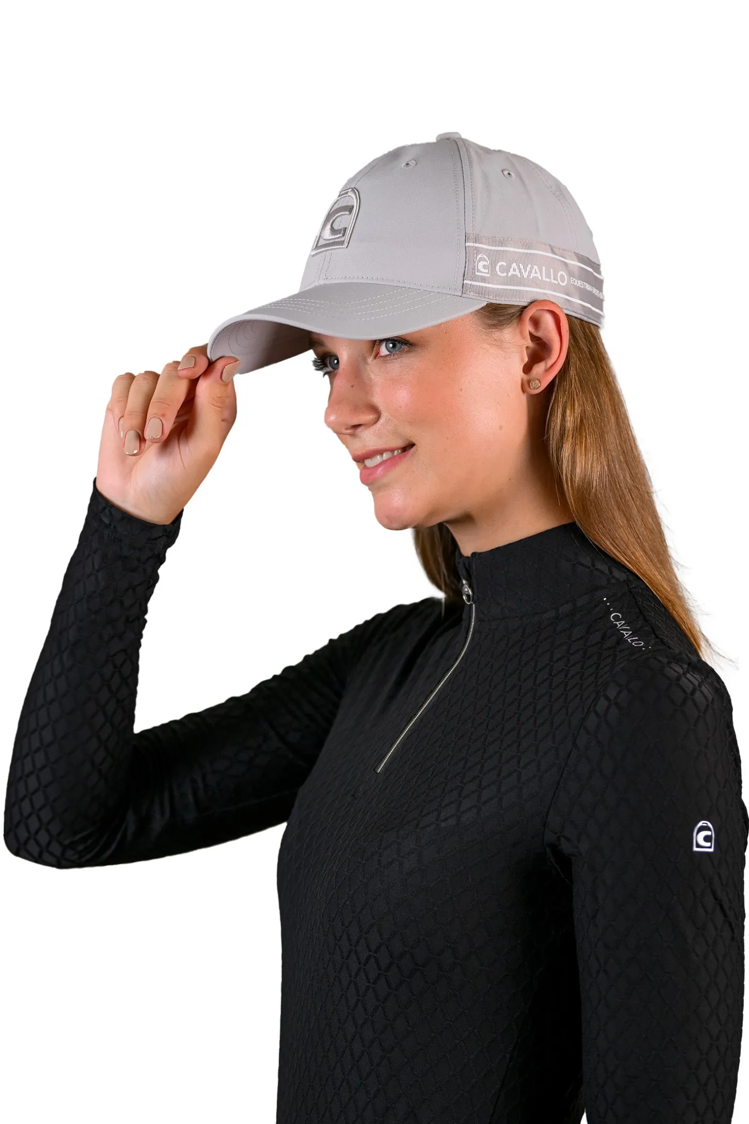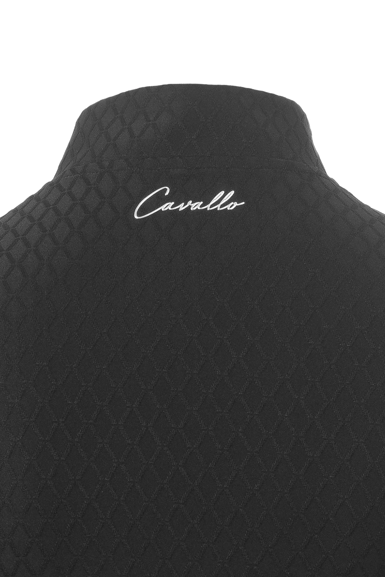 Der Cavalninette Baselayer von Cavallo überzeugt mit einem eleganten Jacquard-Design und Stehkragen. Das weiche Funktionsmaterial sorgt für optimalen Tragekomfort und Atmungsaktivität. Ein kurzer Reißverschluss mit funkelndem Schmuckstein setzt einen stilvollen Akzent. Der Cavallo-Print mit glänzenden Kristallsteinen auf der Schulter verleiht dem Shirt eine exklusive Note, während der Steigbügel-Print mit Metallic-Effekt auf dem Oberarm das Design abrundet. Perfekt für stilbewusste Reiterinnen!