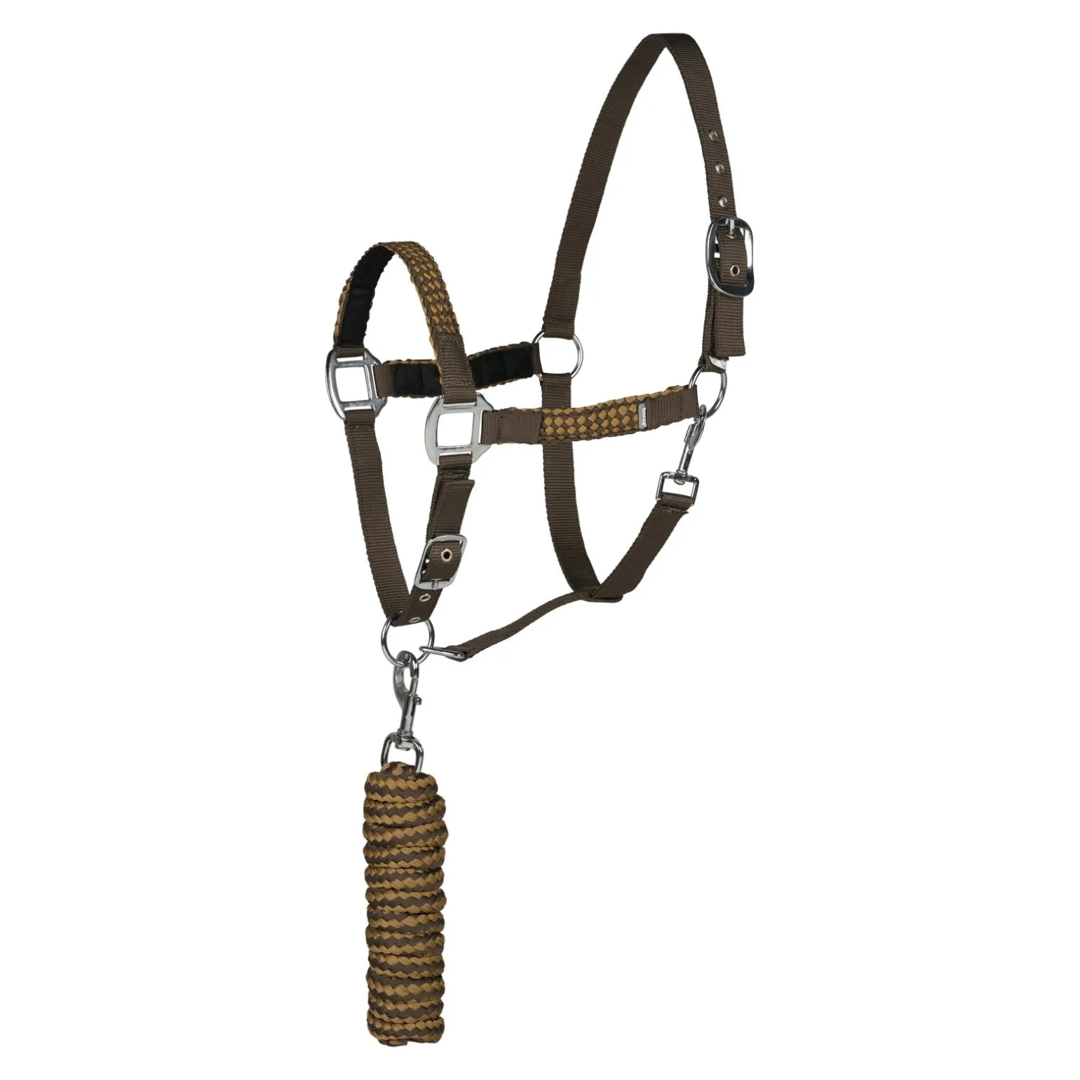 Geflochtene Backen- und Nasenriemen sorgen bei diesem Halfter und Führstrick Set für einen schönen Touch. Das geflochtene Muster wiederholt sich im Führstrick. Verstellbarer Genick- und Nasenriemen bieten eine perfekte Passform.