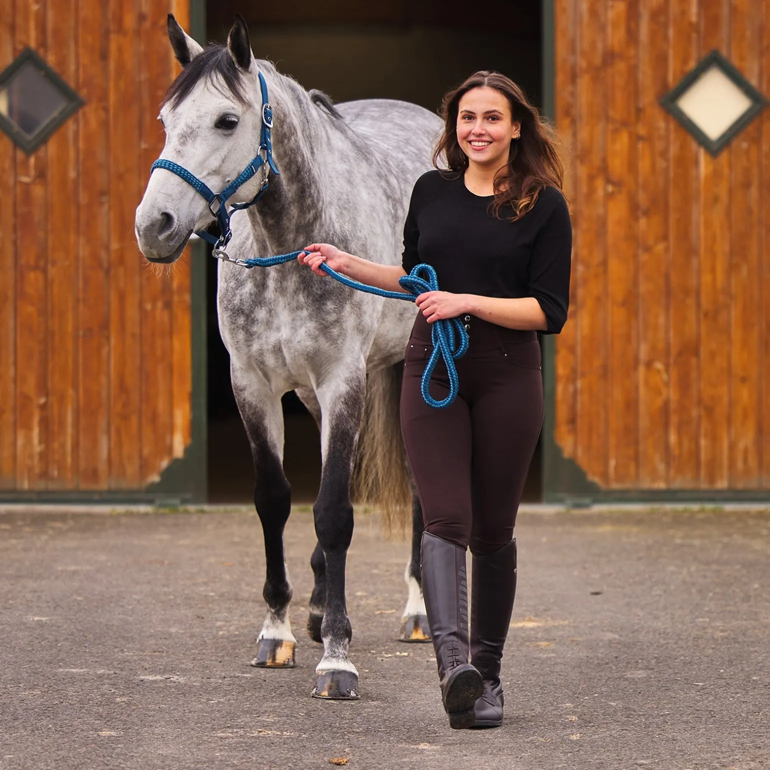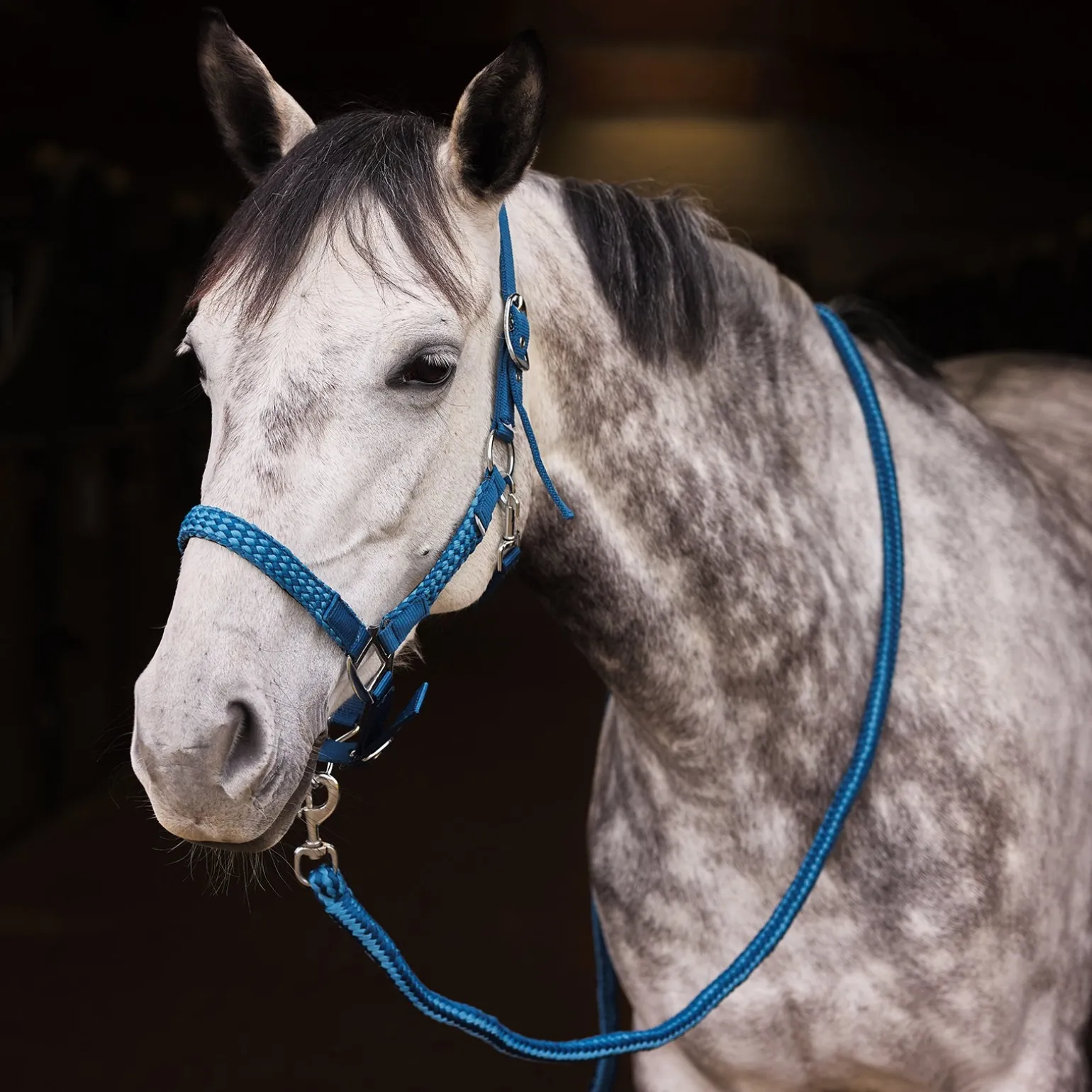 Geflochtene Backen- und Nasenriemen sorgen bei diesem Halfter und Führstrick Set für einen schönen Touch. Das geflochtene Muster wiederholt sich im Führstrick. Verstellbarer Genick- und Nasenriemen bieten eine perfekte Passform.