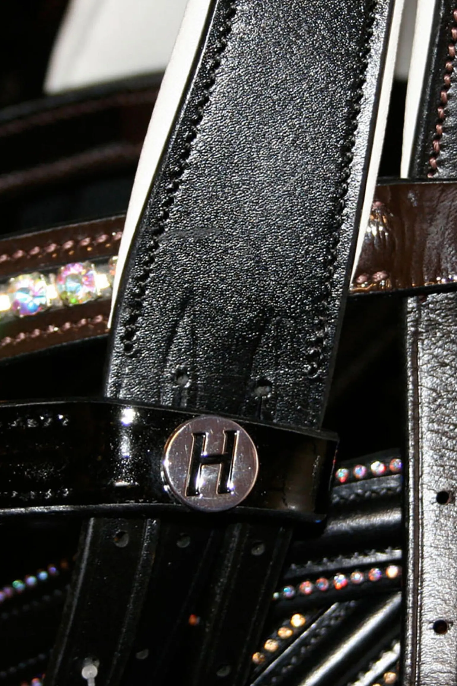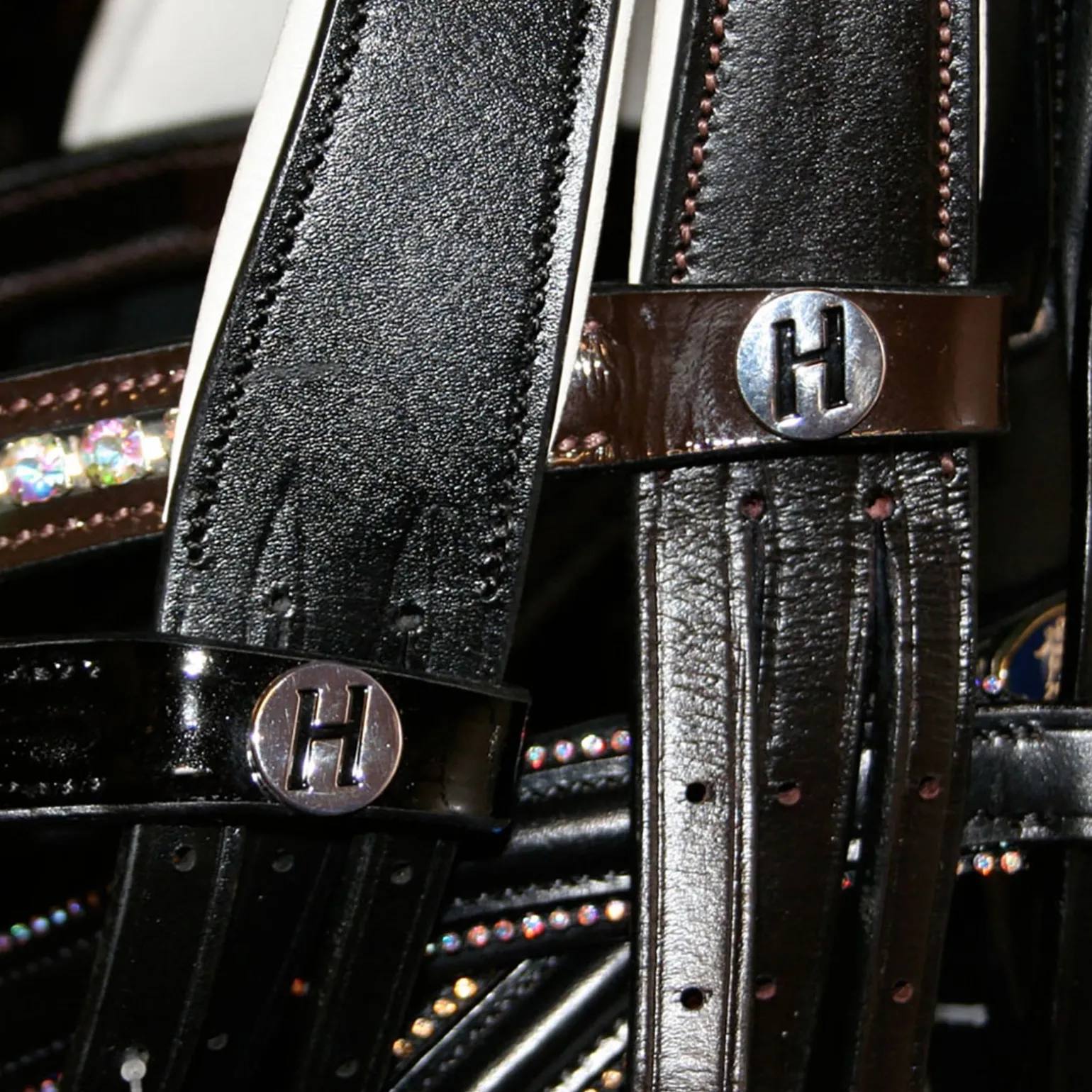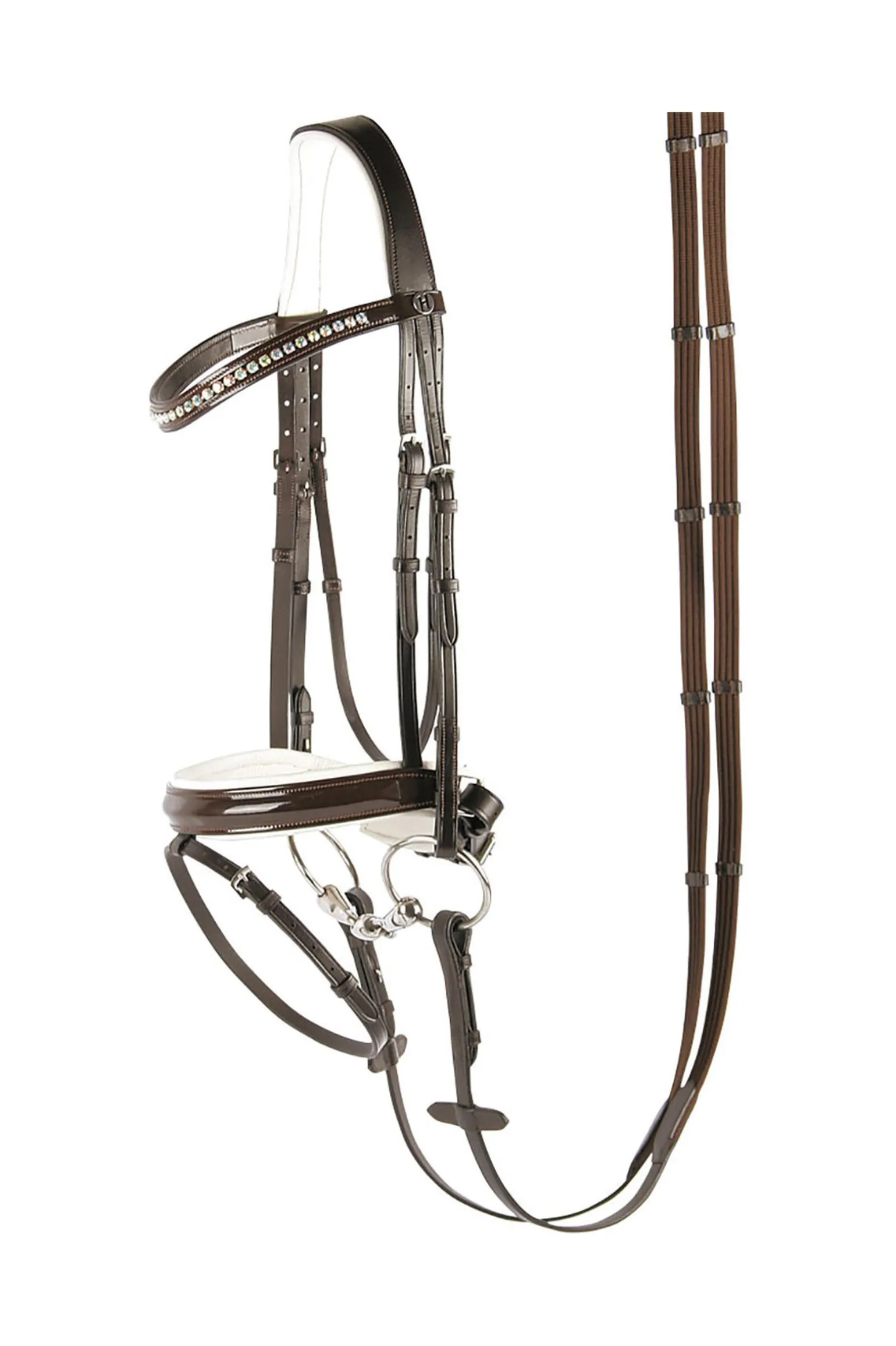 Luxuriöse Trense aus hochwertigem Leder mit weiß unterlegtem Nasenriemen (4 cm) und wellenförmigem Stirnriemen mit AB-Kristallen. Verdeckte Schließen. Inklusive Gurtzügel.