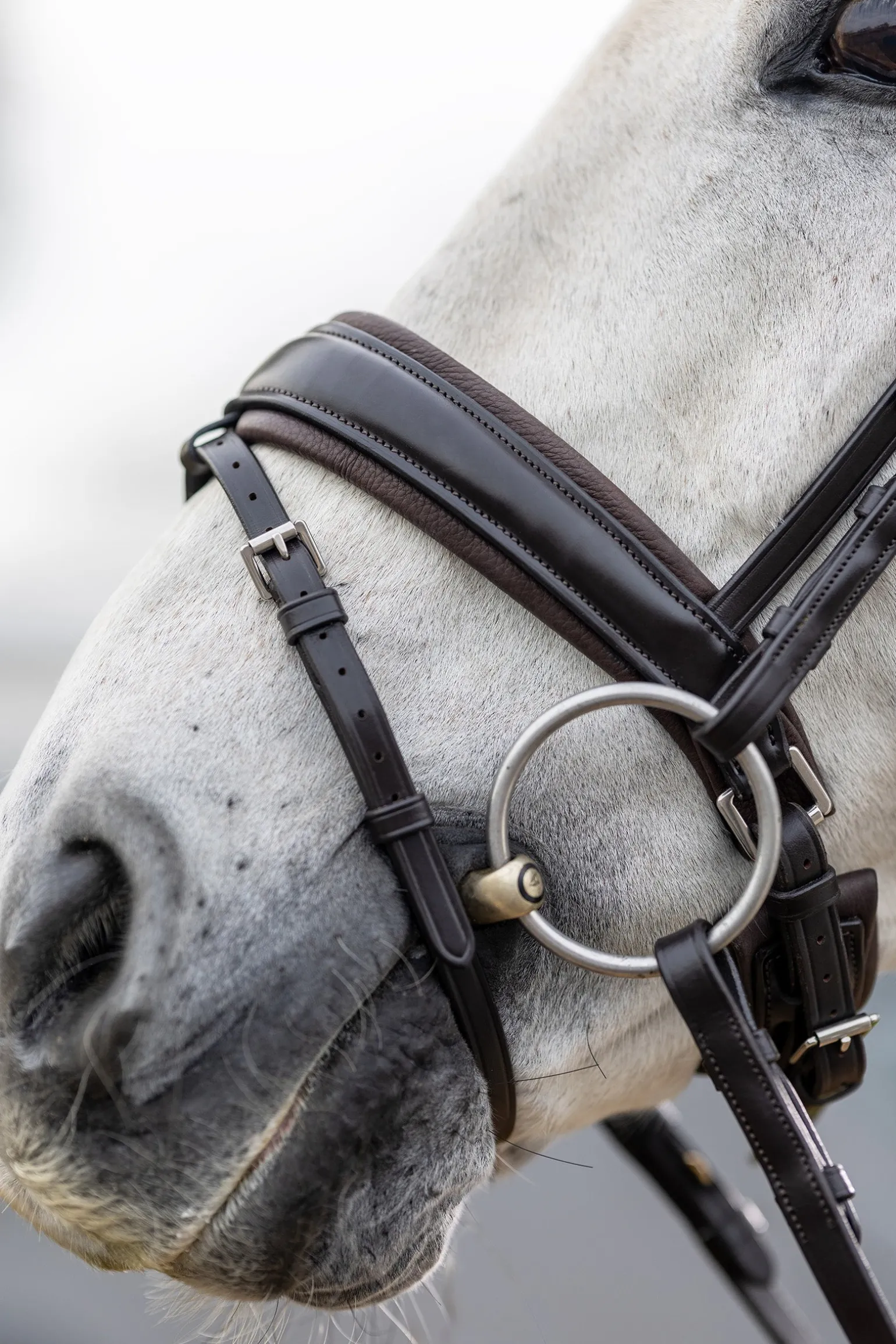 Für zusätzlichen Komfort sorgt das Reithalfter mit hervorragender Polsterung und Rollschnallen an Umlenkschnalle und Sperriemen. Der Kehlriemen wird diskret unter den Ganaschen befestigt und sorgt für einen schlanken Look. Dieser Zaum ist in Braun mit silbernen Beschlägen erhältlich und passt zu den braunen geraden Gummizügeln mit silberner Schnalle.