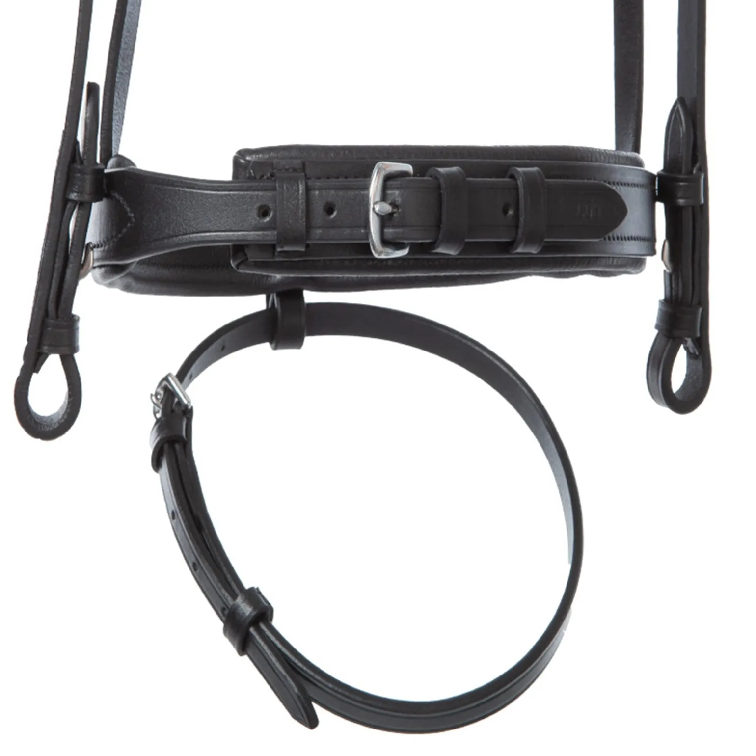 Um Druckstellen zu vermeiden, verläuft die Öse zwischen dem Nasenriemen und der Unterpolsterung entlang. Die Trense hat ein schmales, gebogenes Stirnband mit Clinchern. Für einen optimalen Sitz kann die Trense beidseitig verstellt werden. Geliefert wird die Trense inklusive Gurtzügeln mit Stegen.