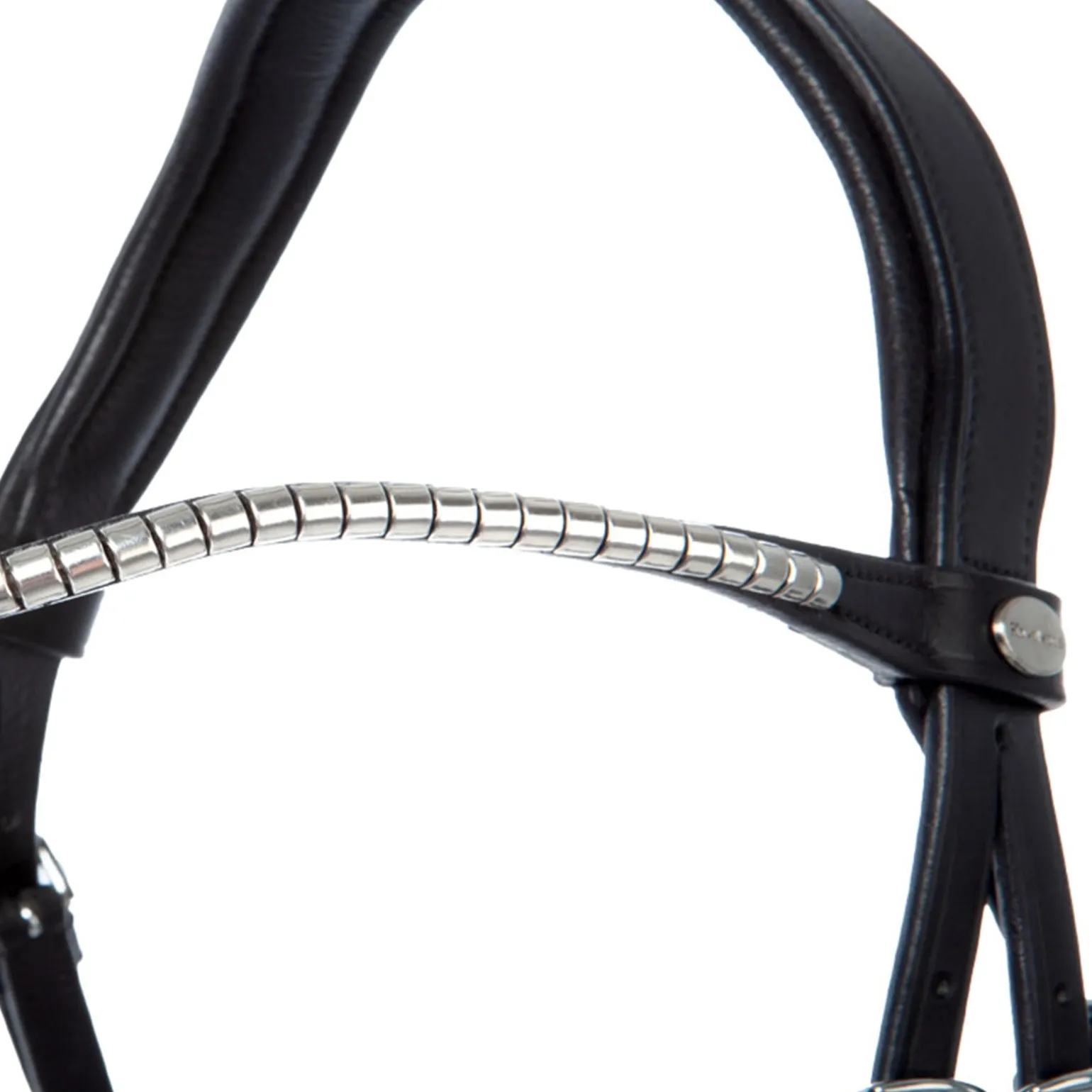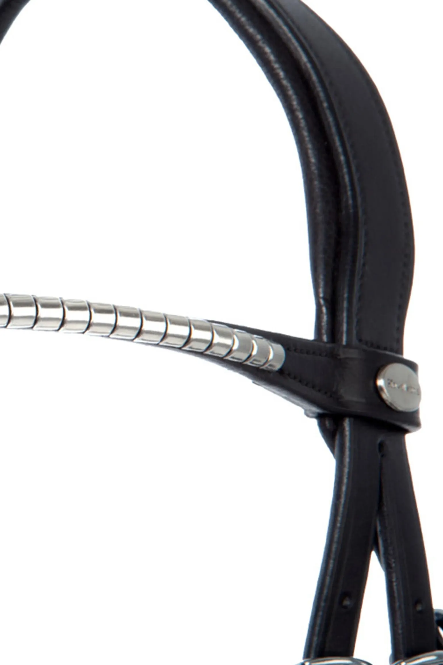 Um Druckstellen zu vermeiden, verläuft die Öse zwischen dem Nasenriemen und der Unterpolsterung entlang. Die Trense hat ein schmales, gebogenes Stirnband mit Clinchern. Für einen optimalen Sitz kann die Trense beidseitig verstellt werden. Geliefert wird die Trense inklusive Gurtzügeln mit Stegen.