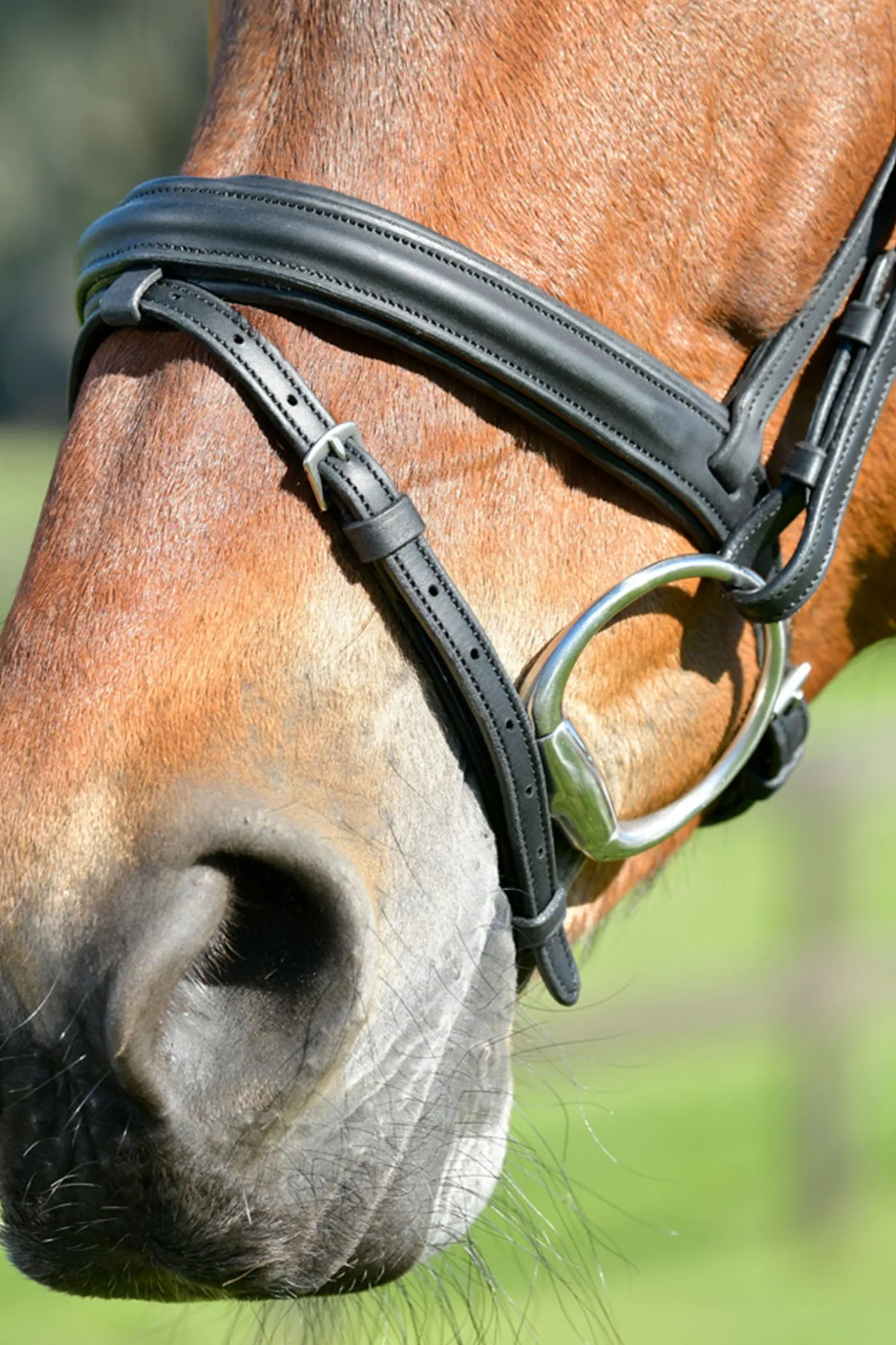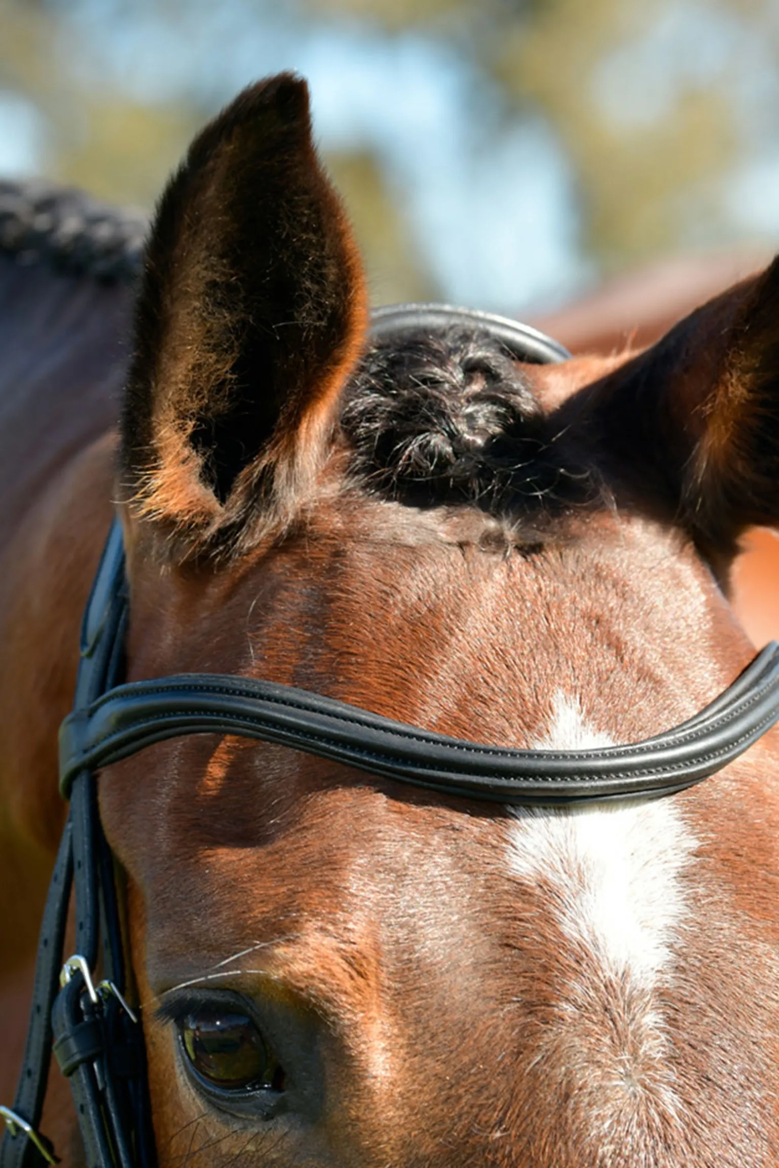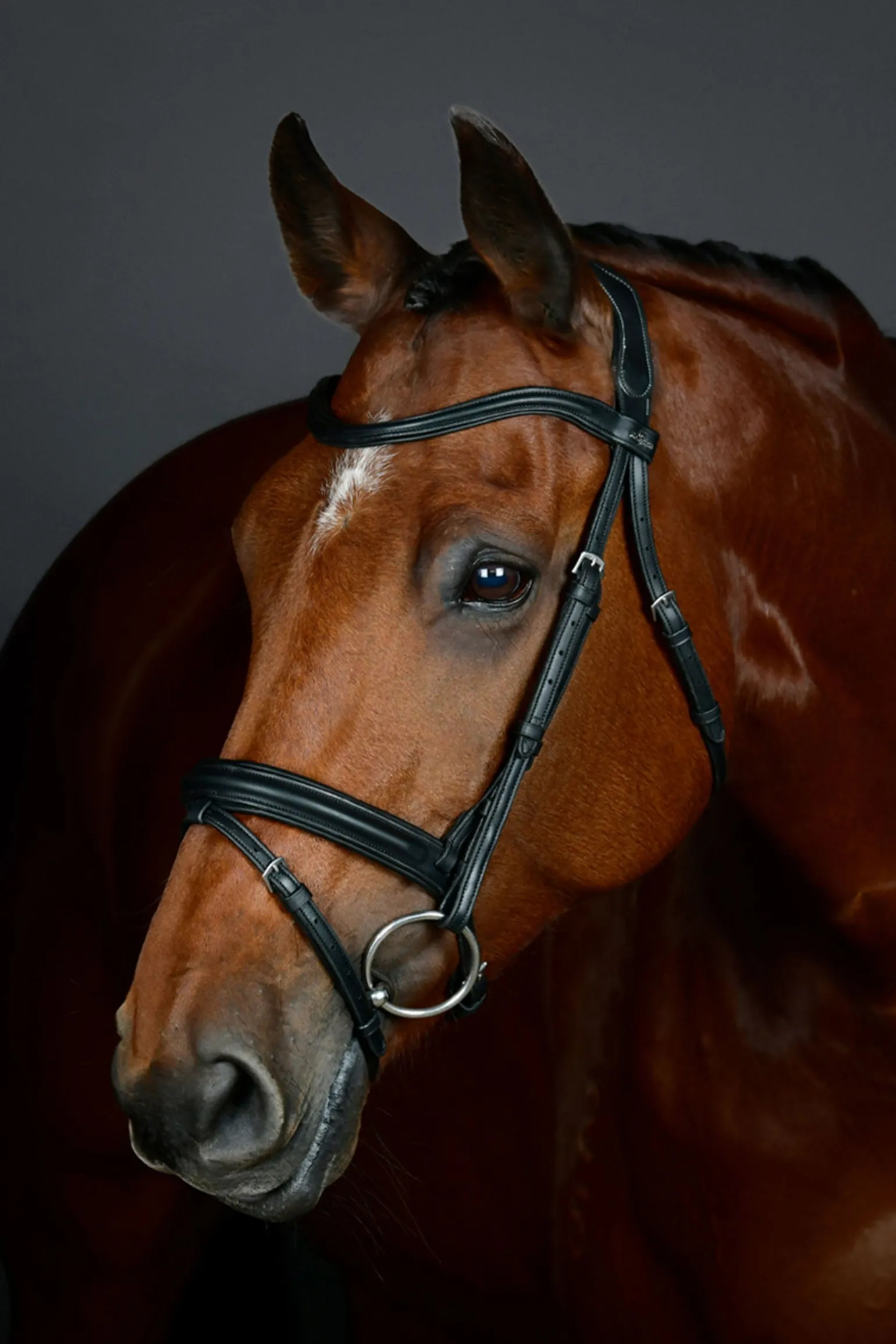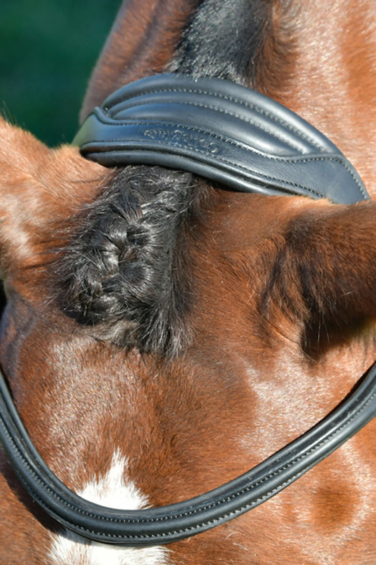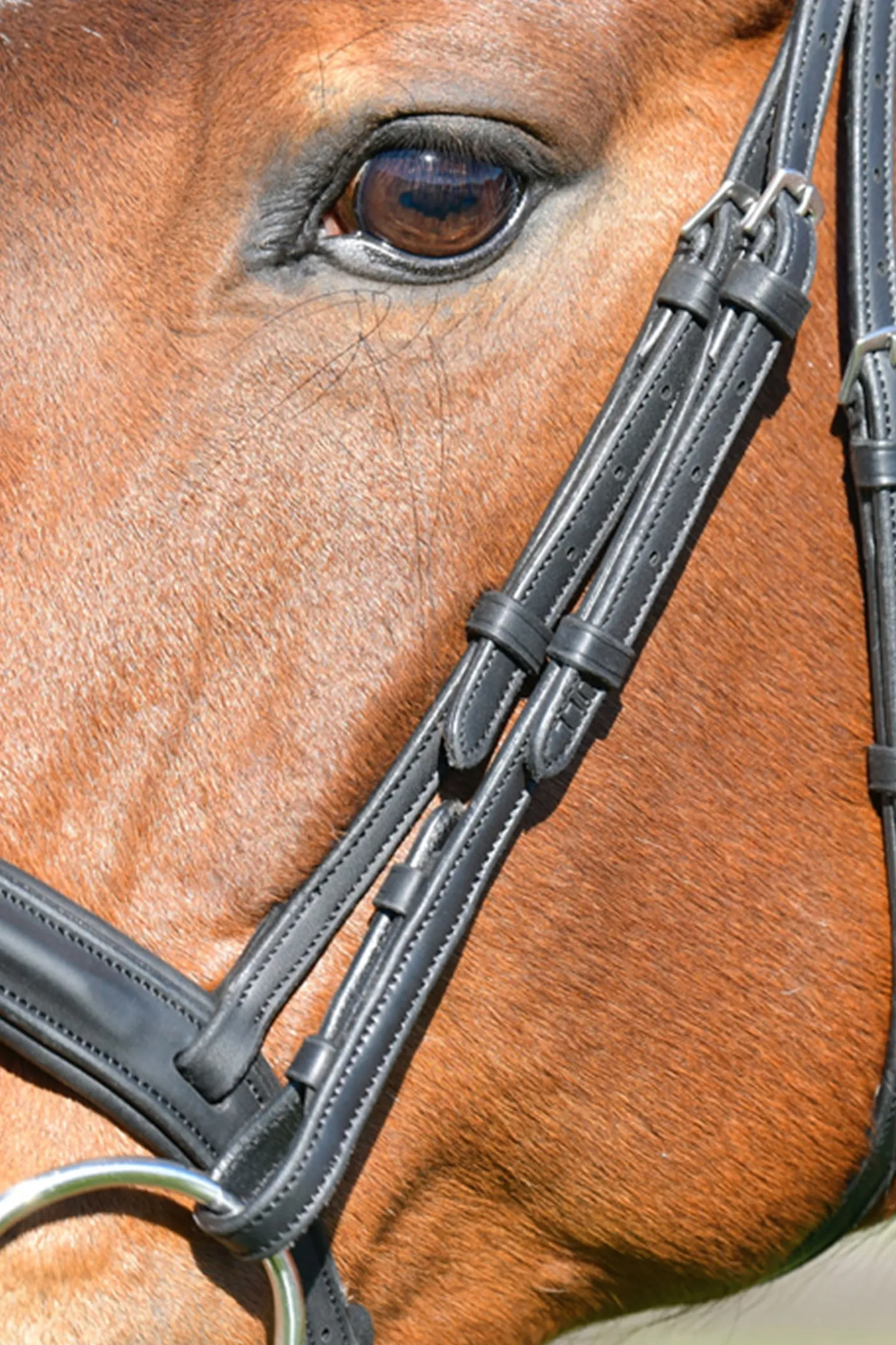 Diese Trense wird aus feinstem europäisch und indisch gegerbtem Leder gefertigt und fühlt sich besonders weich und geschmeidig an – für besten Komfort deines Pferdes. Das edle, erhabene Lederdesign mit tonalen Nähten macht sie zum Hingucker im Alltag und auf dem Turnier. Das anatomische Kopfstück ist weich gepolstert und im Genick breiter geformt, um den Druck gleichmäßig zu verteilen. Der Blitzriemen lässt sich abnehmen und in ein klassisches Kappzaum-Nasenband verwandeln. Robuste Beschläge aus rostfreiem Stahl und doppelseitige Verstellmöglichkeiten sorgen für eine perfekte Passform. Die passenden Zügel bekommst du separat.