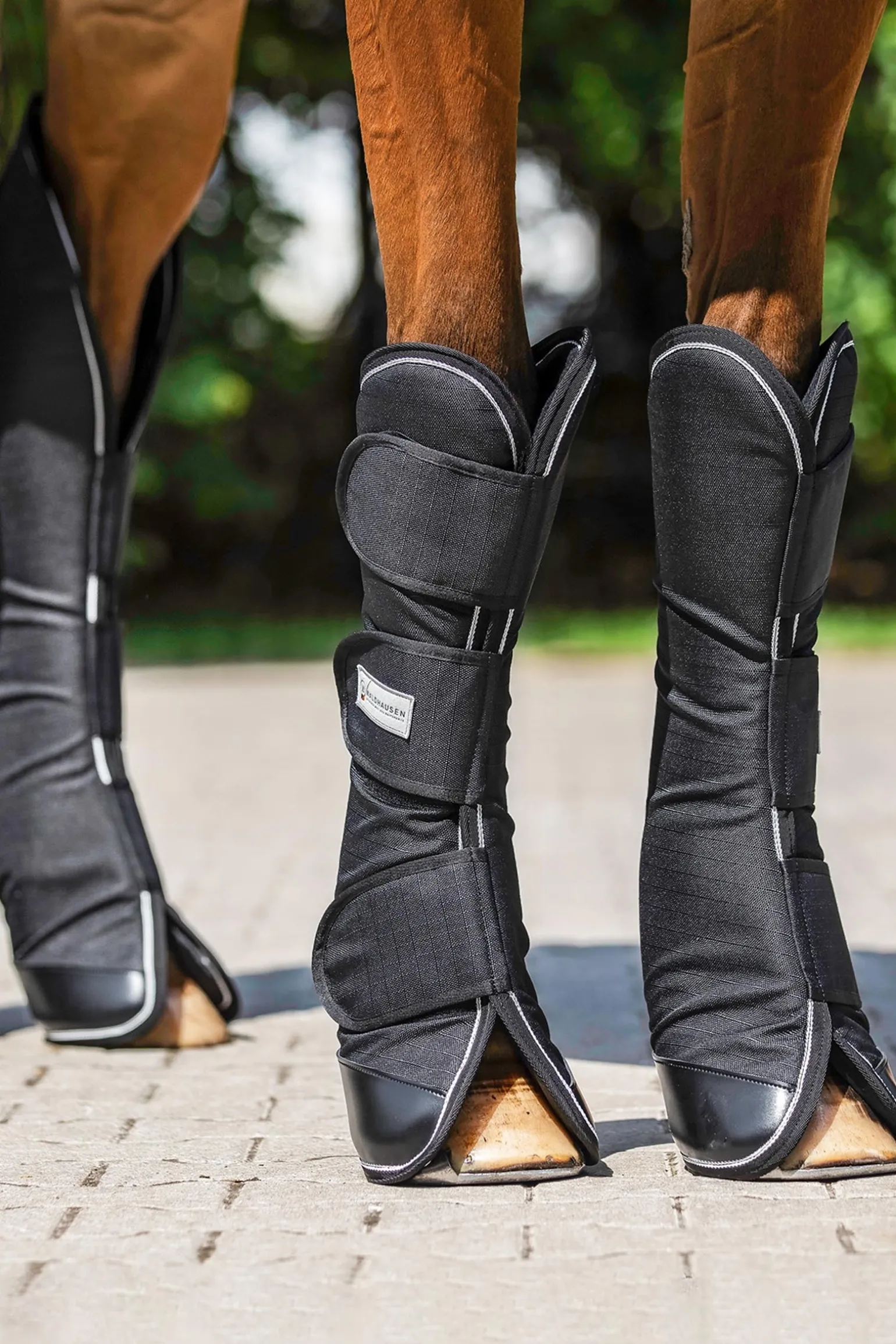 Anatomisch geformte Transportgamaschen mit drei starken Klettverschlüssen für optimalen Halt am Pferdebein. Hoher Schutz dank stoßdämpfender Schaumstoffpolsterung (1,5 cm dick) im Inneren und hohem Schnitt. Weiches Fleecefutter für maximalen Komfort. Besonders strapazierfähiges Außenmaterial mit Verstärkung im Fersenbereich.