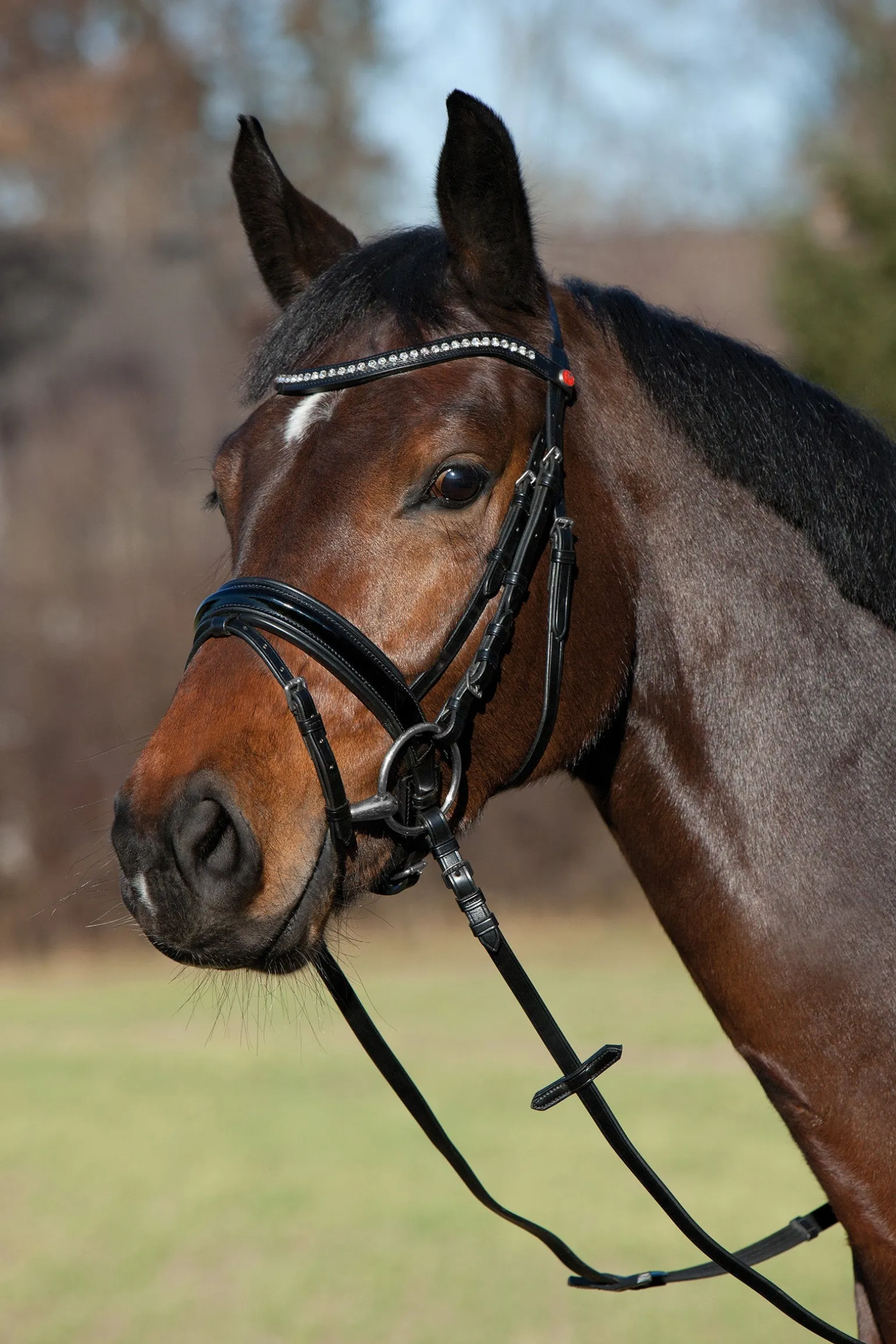 Diese edle, en-gblisch kombinierte Trense aus bestem Qualitätsleder ist ideal für Turnier oder Training und ist rundum weich gepolstert. Das Comfort-Kopfstück mit Ohrenausschnitt sorgt für Druckentlastung und mehr Bewegungsfreiheit für die Ohren. Das schicke Lack-Reithalfter und das hübsche geschwungene Stirnband mit Kieffer-Ultrashine-Kristallen sorgt für den Hingucker-Effekt.