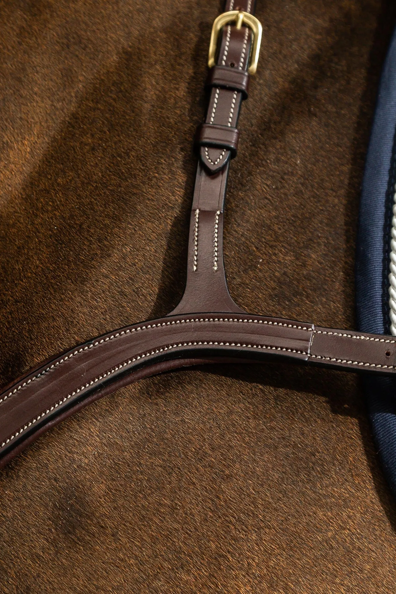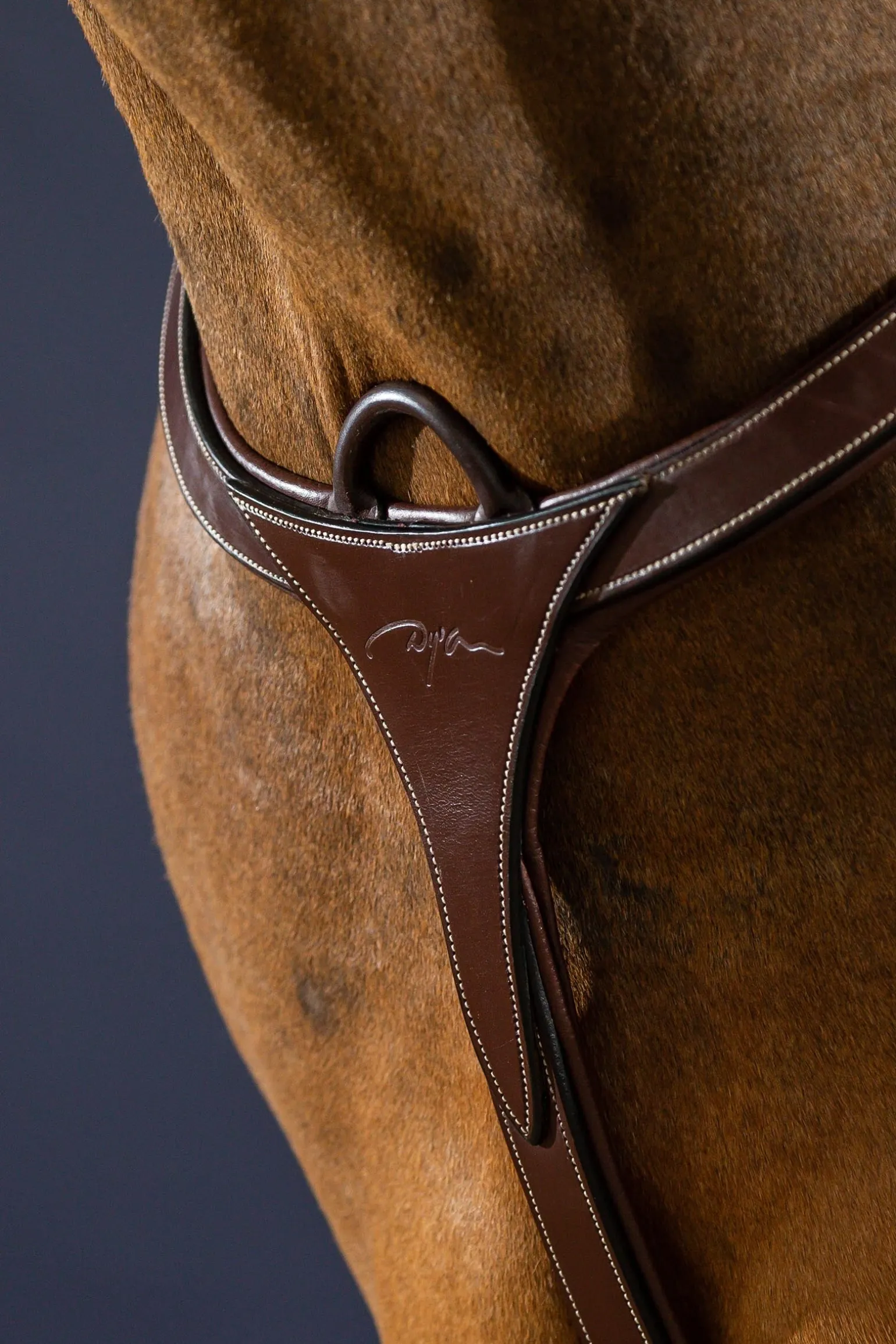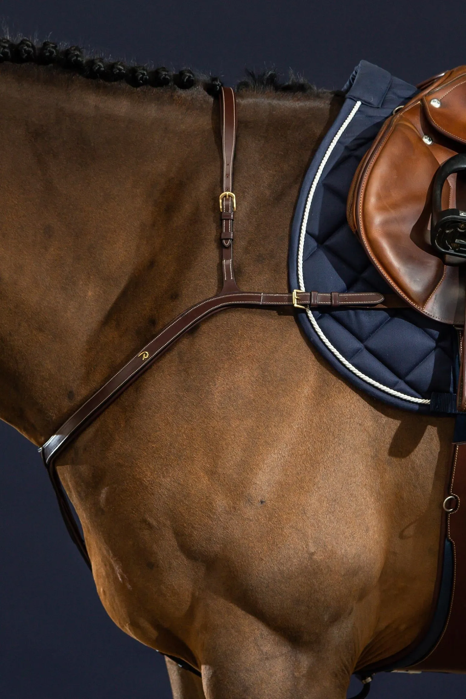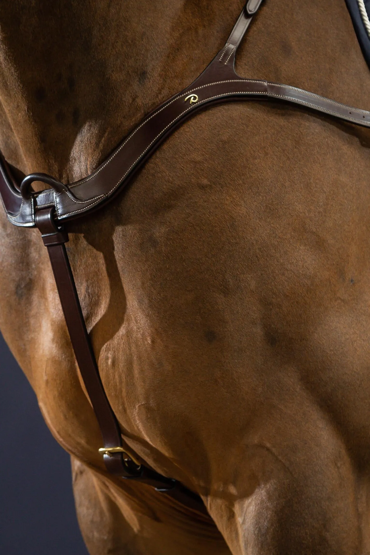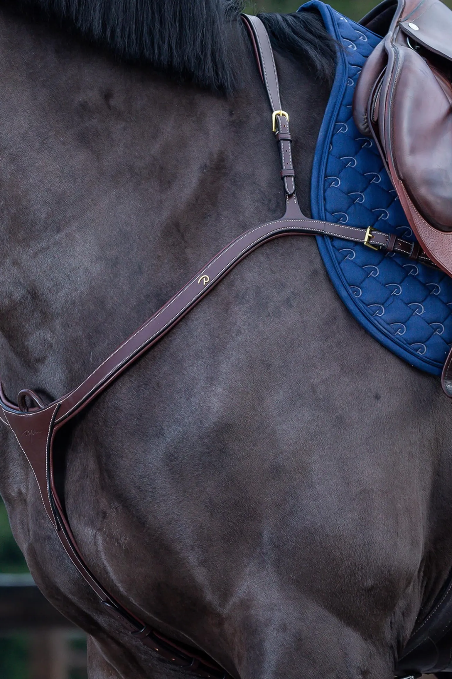Dieses Vorderzeug verfügt über eine verlängerte, verstellbare Brücke mit drei Befestigungspunkten, eine geschwungene Form und elastische Einsätze für uneingeschränkte Schulterfreiheit und hohen Tragekomfort.