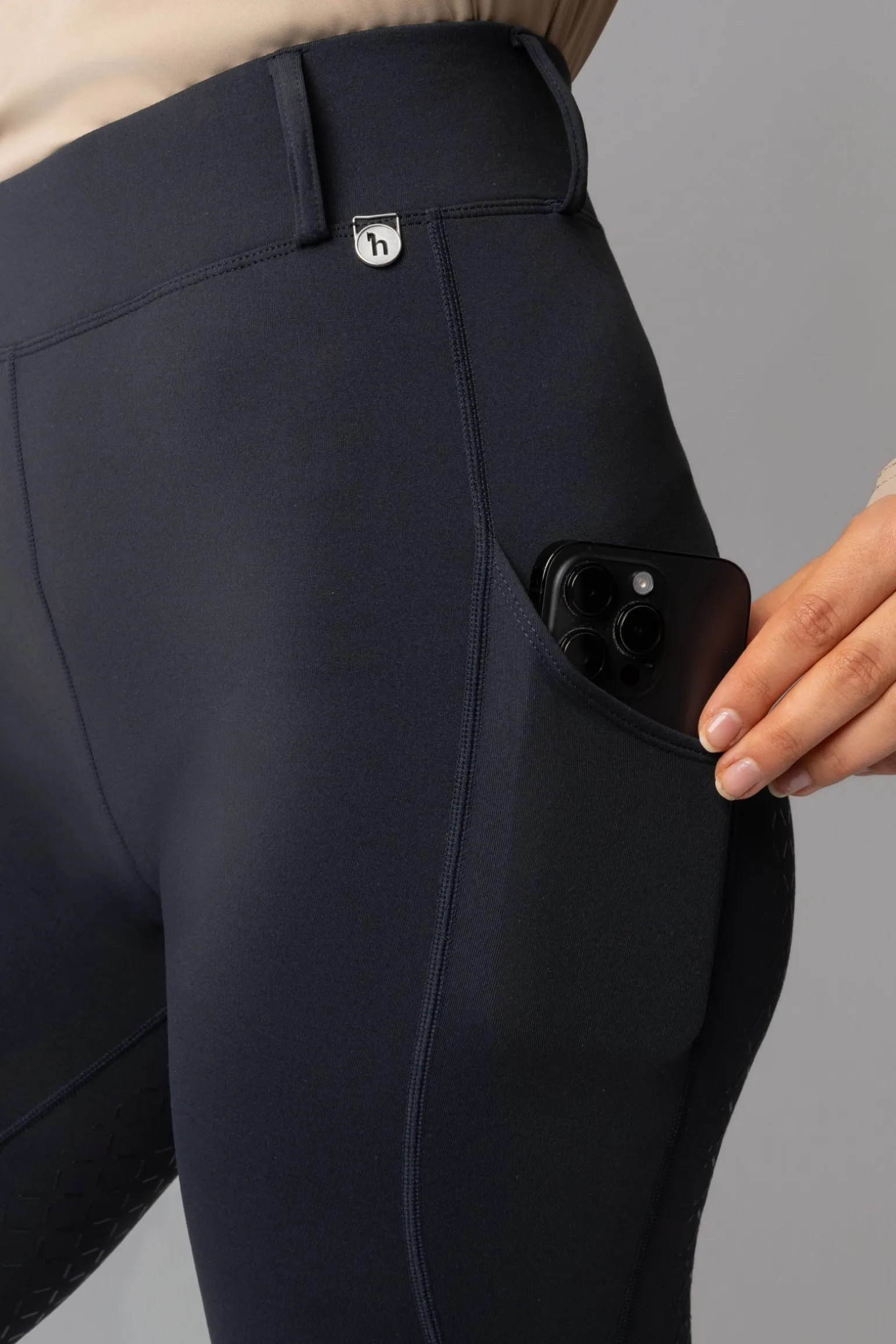 The Horze Dea Winter Fullgrip Tights are the perfect choice for cold-weather training. Made from breathable, insulating fabric with a soft brushed lining, they keep you warm without sacrificing comfort. The shell waistband with belt loops ensures a secure fit, while the silicon full seat grip gives you stability in the saddle. A handy phone pocket on the thigh keeps your essentials close at hand. With excellent stretch and a flattering cut, these tights are both practical and stylish for winter riding.