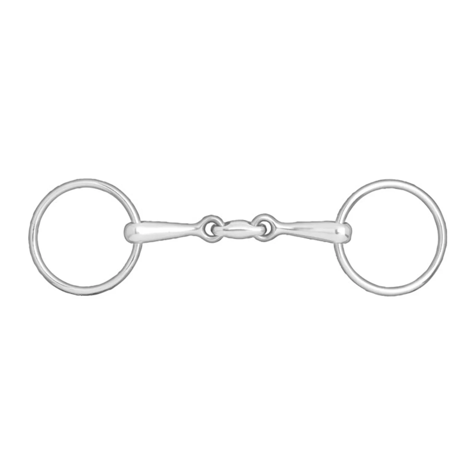 Eine sanfte, doppelt gebrochene Wassertrense ist ein gewöhnliches Gebiss, das das Pferd stimuliert ohne einen Nussknackereffekt zu haben, wie es bei einfach gebrochenen Gebissen der Fall ist. Das doppelt gebrochene Mundstück ermöglicht Kontrolle ohne Schmerz. Aus angenehmem, poliertem, rostfreiem Edelstahl gefertigt.