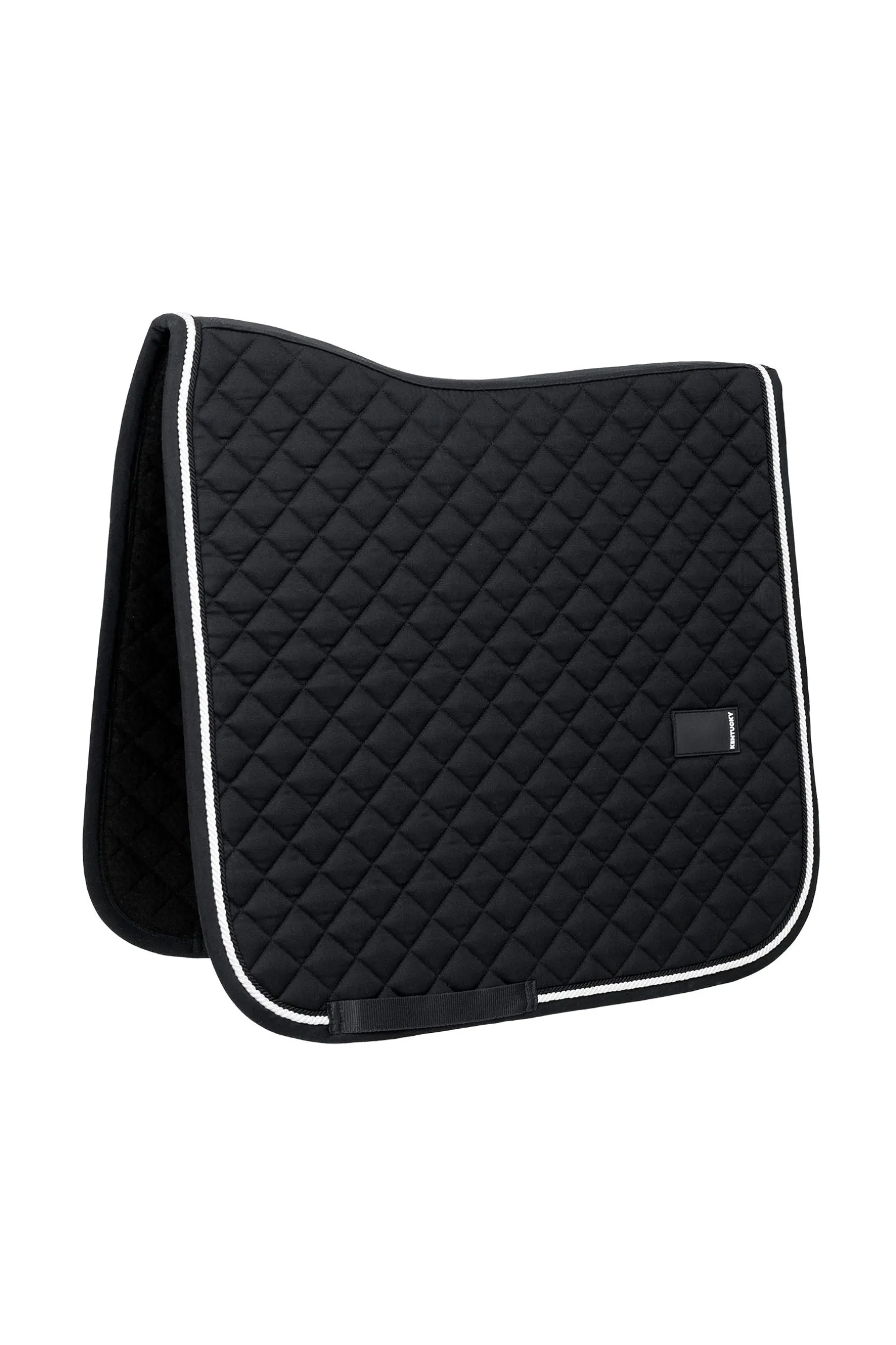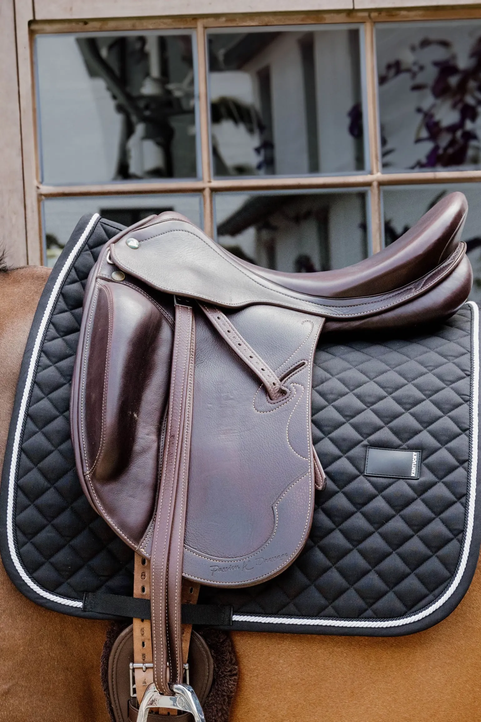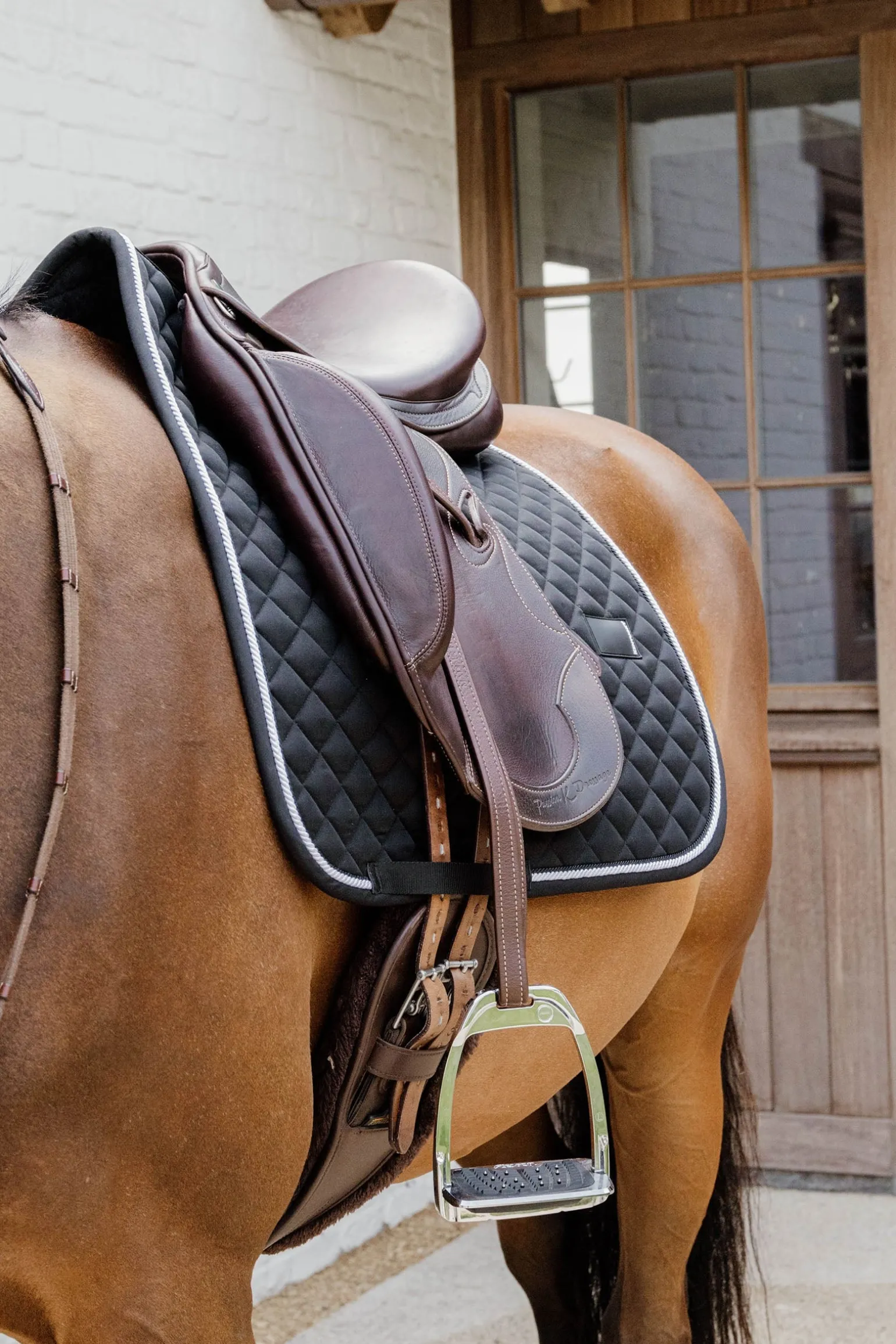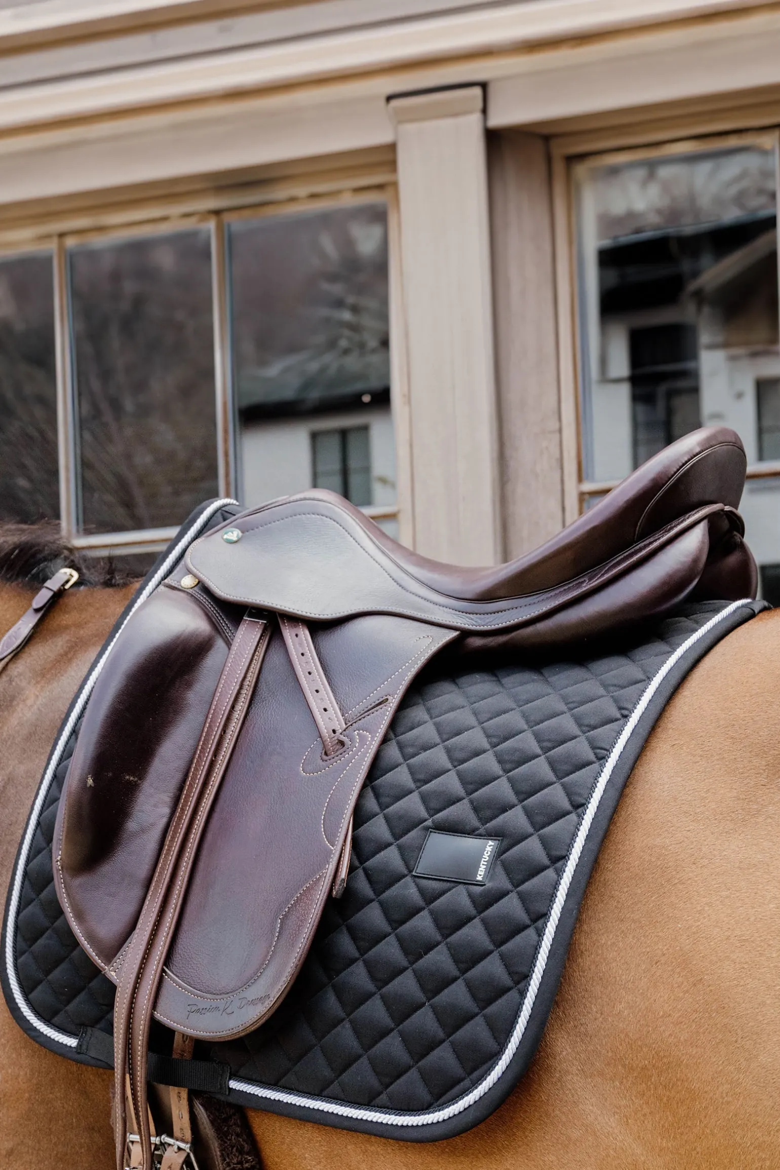 Sorge mit dieser Schabracke Diamant für einen eleganten Look und bewundernde Blicke. Diese Schabracke kombiniert elegantes Design mit höchstem Tragekomfort, den du sehen und spüren kannst. Die im klassischen Stil gehaltene Schabracke Diamant mit auffälliger Bordüre verleiht deinem Pferd einen Hauch von Exklusivität. Das edle Design sorgt für bewundernde Blicke – ob im Training oder auf dem Turnier. Die Schabracke besteht aus einem feuchtigkeitsabsorbierenden und schnelltrocknenden Baumwoll-Polyester-Gemisch. Mit ihr fühlt sich dein Pferd auch bei intensiven Trainingseinheiten wohl und kommt nicht unnötig ins Schwitzen. Innenliegend verfügt die Schabracke über eine atmungsaktive Polsterung, die einen effektiven Dämpfungseffekt zwischen Sattel und Rücken bietet. Das aufgenähte Kentucky-Logo, aus hochwertigem Gummi, verkörpert die Kentucky-Qualität bereits von Weitem. Dank der anatomischen Form passt sich die Schabracke perfekt an den Rücken deines Pferdes an und entlastet den Widerrist optimal. Kein Verrutschen, kein Drücken, kein Reiben – einfach ein sicherer Sitz, damit du selbstbewusst und kontrolliert reiten kannst, ohne dass dein Pferd beeinträchtigt wird.