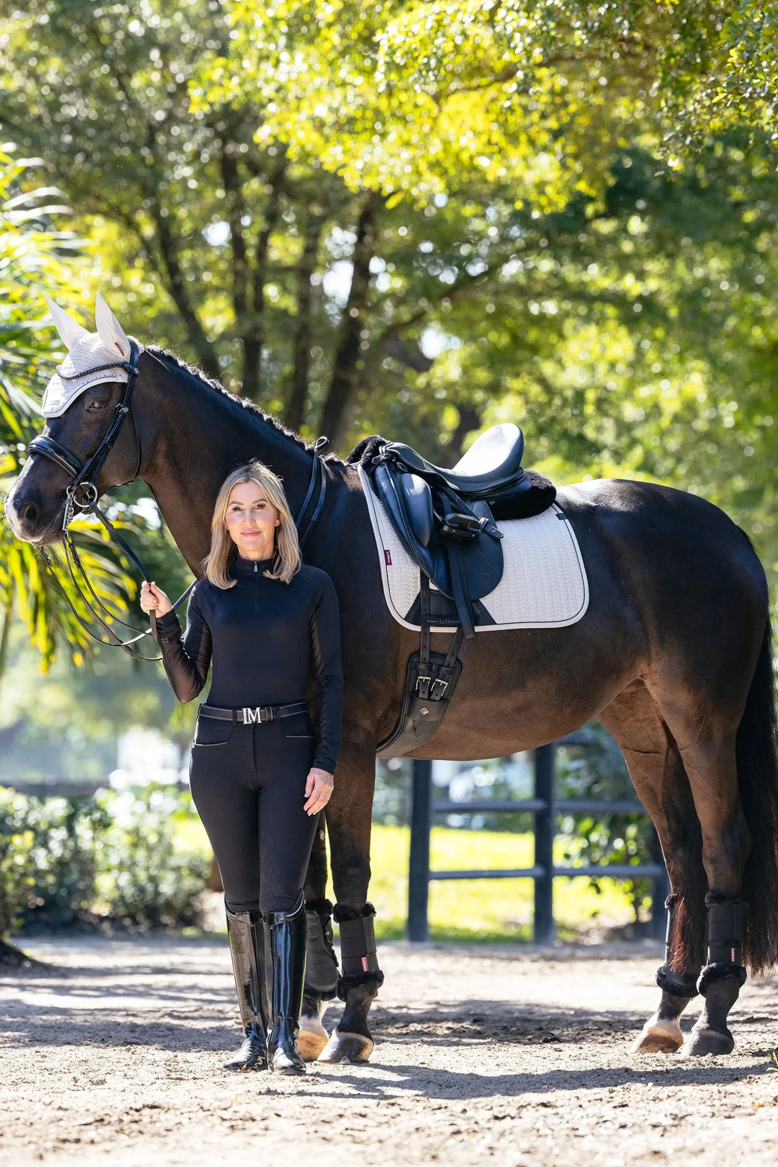 Entwickelt für anspruchsvolle Reiter mit technischer Performance, die jeder genießen kann. Das weiche Softshell-Material der Essence-Kollektion strahlt Eleganz aus. Die konturierte, gesteppte Softshell-Oberseite wurde präzise geformt, um sich perfekt an die Körperlinien deines Pferdes anzupassen, ohne zu Falten. Das weiche, atmungsaktive Innenfutter enthält kühlende Fasern. Je wärmer dein Pferd wird, desto intensiver arbeitet das feuchtigkeitsaktivierte Kühlsystem unter dem Sattel. In Kombination mit einem durchgehenden 3D-Carbon-Mesh-Rücken für maximale Luftzirkulation ist dies eine Schabracke, die speziell für leistungsstarke Pferde entwickelt wurde. Die hohe Widerristform reduziert den Druck und verbessert die Passform des Sattels. Der sportliche, matt strukturierte Kunstleder-Bereich zum Schutz des Gurtes wird durch ein geprägtes Logo ergänzt.
