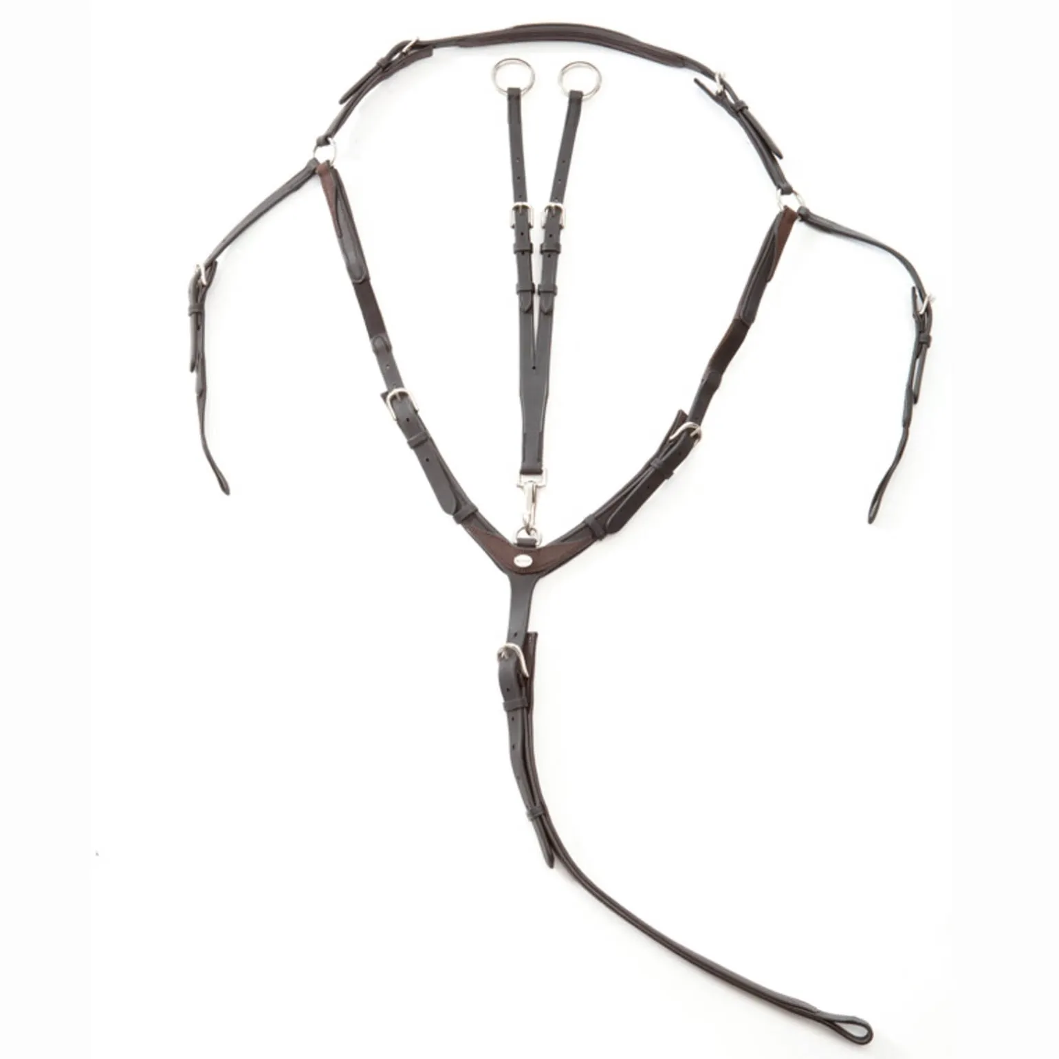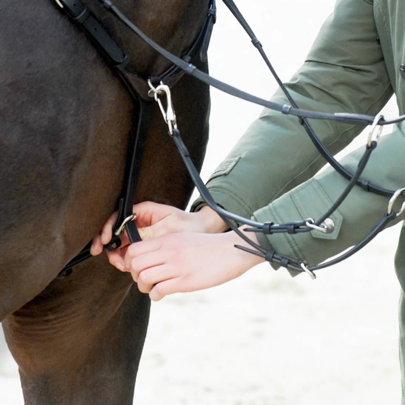 Das Vorderzeug „Everyday“ aus geöltem Leder ist ein tiefes Drei-Punkt Vorderzeug mit seitlicher Befestigung am Sattel. Ein weiches Widerristpolster beugt Scheuern an der Mähne vor. Doppelte Elast-Einsätze entlang der Schulter sorgen für genügend Bewegungsfreiheit des Pferdes, ohne den Sattel nach hinten rutschen zu lassen. Besonders ist, dass der Brust-Gurt-Riemen vorne an der Brust verstellt wird, sodass man nicht mehr unter dem Pferdebauch herum hantieren muss. Die untere Gurtbefestigung wird mittels kleiner Lederschlaufe oder abnehmbarem Karabiner erreicht. So hat man weniger Schlaufen und Schnallen, was das Risiko des Einfädelns deutlich verringert. Die Schnallen haben weiche Lederpolster.