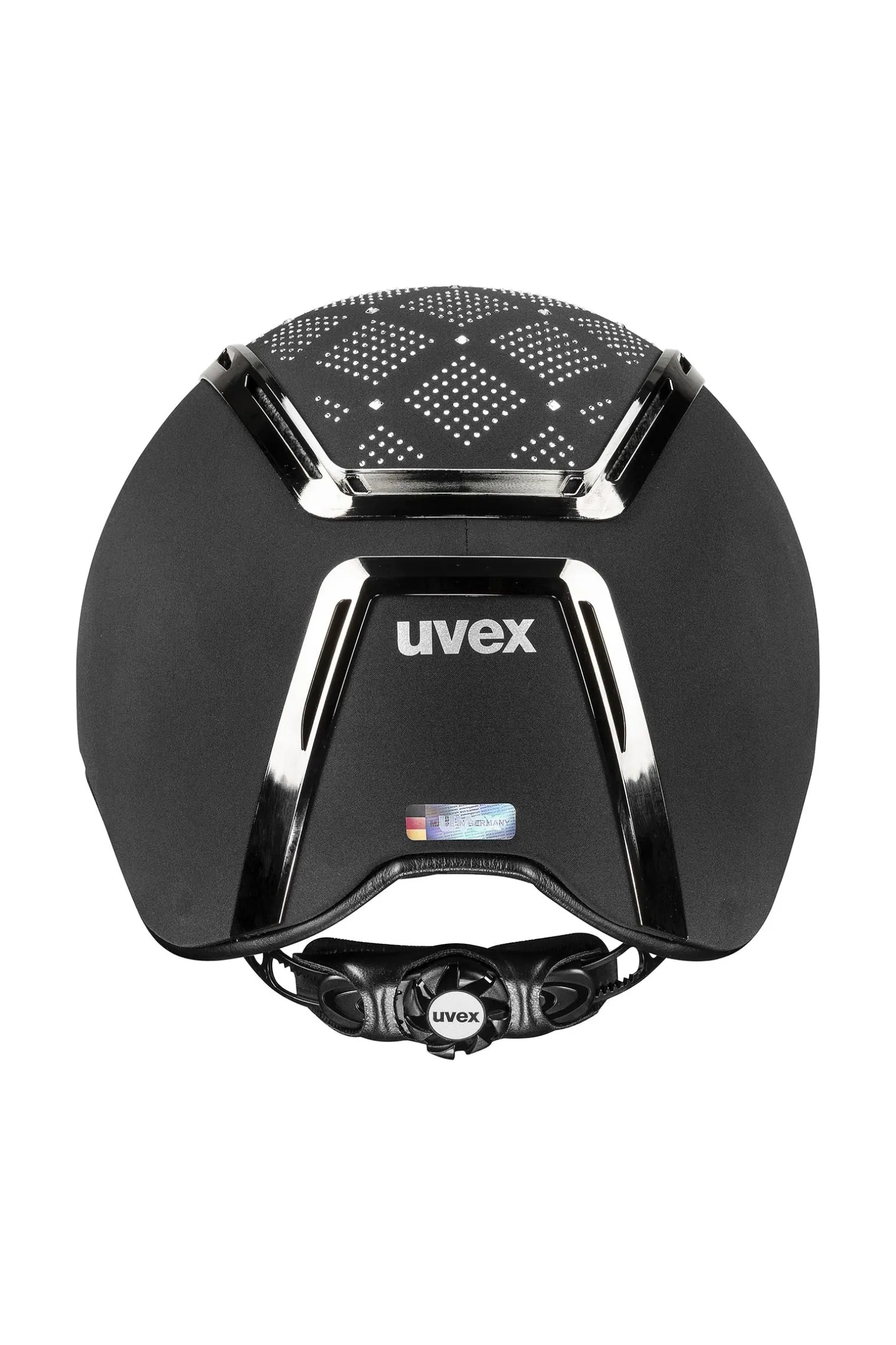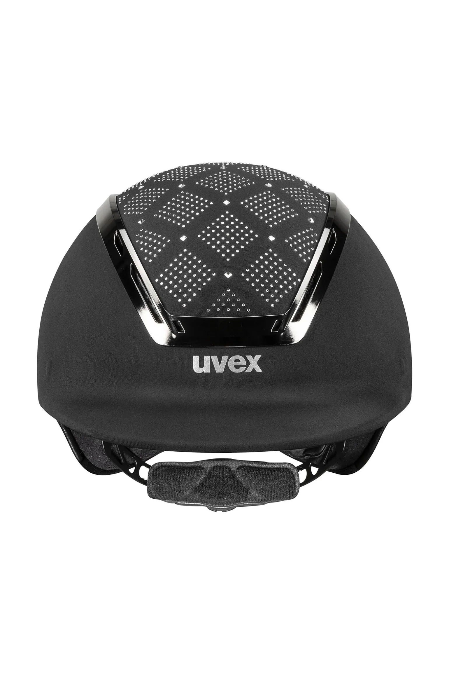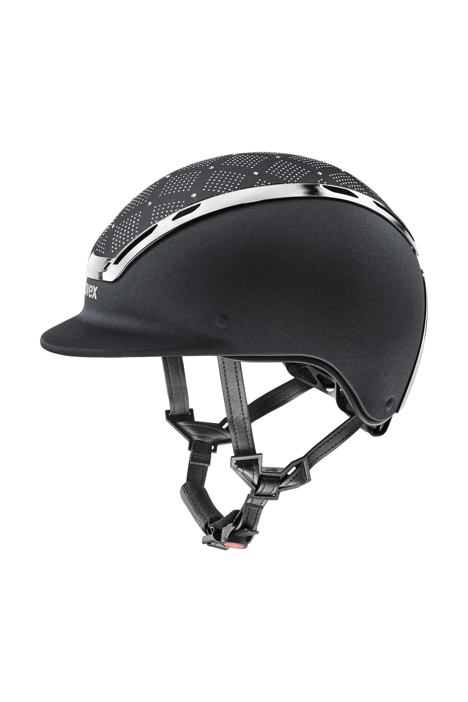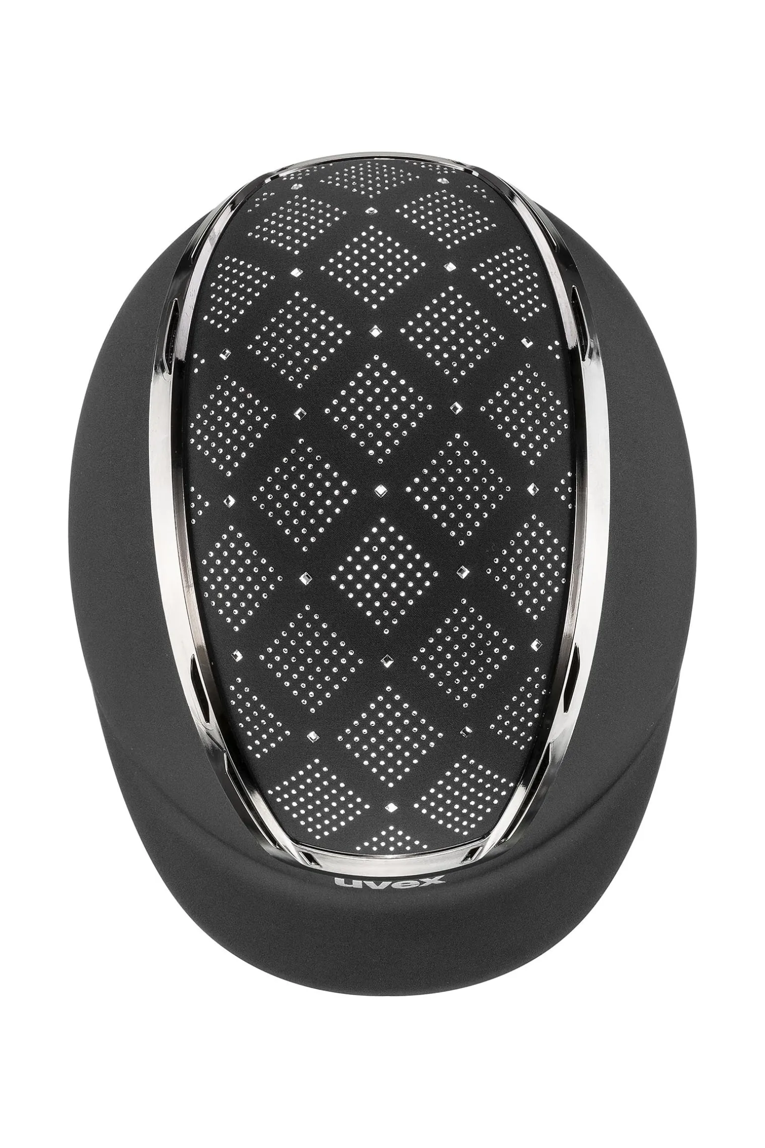 Matter Satin und dezenter Swarovski®-Glamour kennzeichnen diesen exklusiven Reithelm. Mehr als 1.000 Swarovski®-Kristalle in der Farbe crystal clear, umgeben von einem Chromrahmen in metal-black, sind hier der Hingucker. Der Reithelm schützt nach neuesten Standards, ist ausgezeichnet belüftet und sitzt perfekt. Dafür sorgt die integrierte 3D IAS Größenanpassung in Kombination mit dem neuen verstellbaren Y-Verteiler mit veganen Ledergurtbändern. Eine gute Wahl für Reiterinnen mit höchsten Ansprüchen und einem Sinn für hochwertige Details.