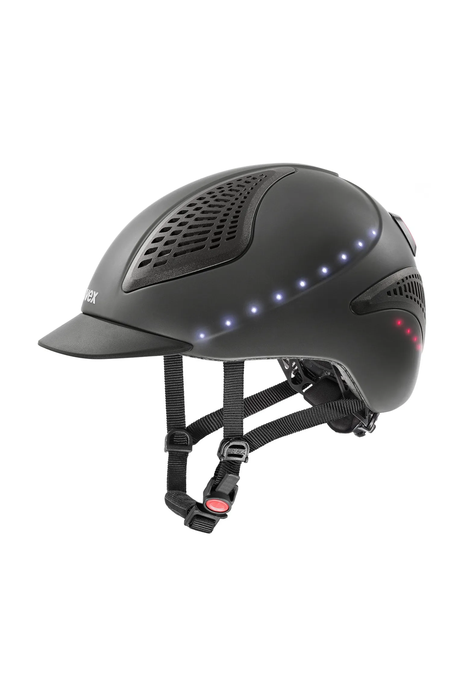 Sichtbar und sicher! Der uvex exxential II LED ist der erste uvex Reithelm mit innovativer Helmbeleuchtung. Die integrierten LED-Spots (seitlich weiß, hinten rot) sind im Ruhezustand nicht zu sehen und werden mit einem Knopfdruck aktiviert. Besonders praktisch: Der sportliche Allrounder erfüllt die Reit- und Radhelmnorm, so dass Reiter:innen, die mit dem Rad zum Stall fahren, stets perfekt geschützt sind.