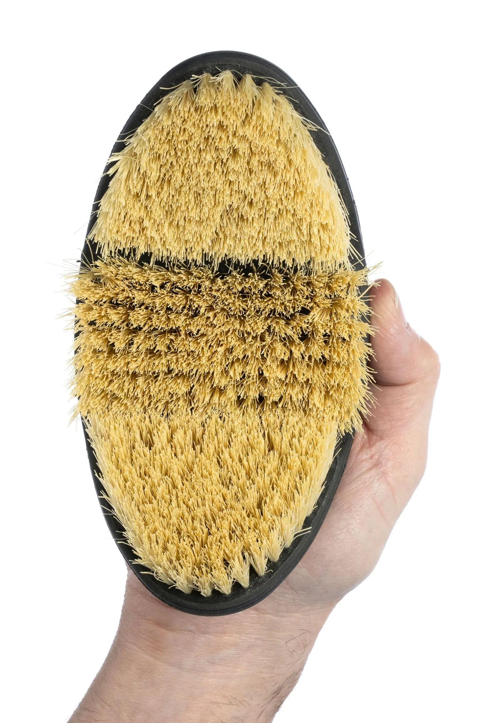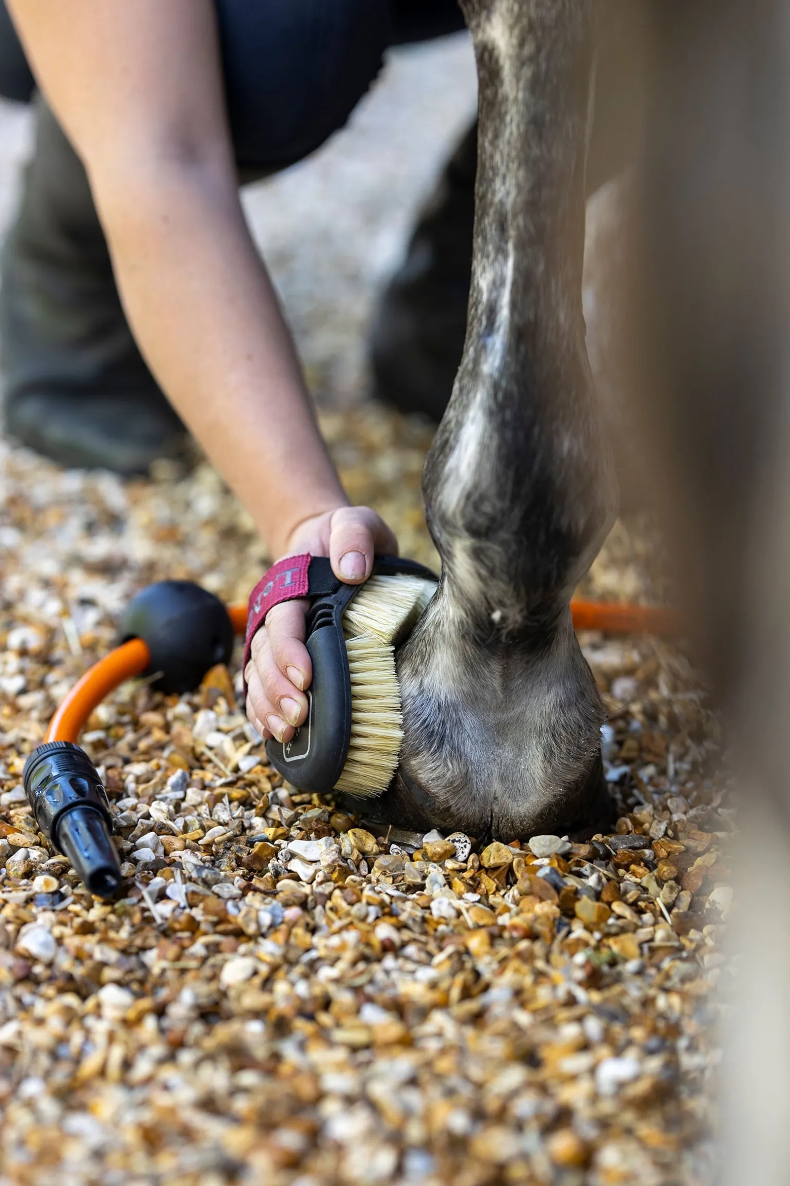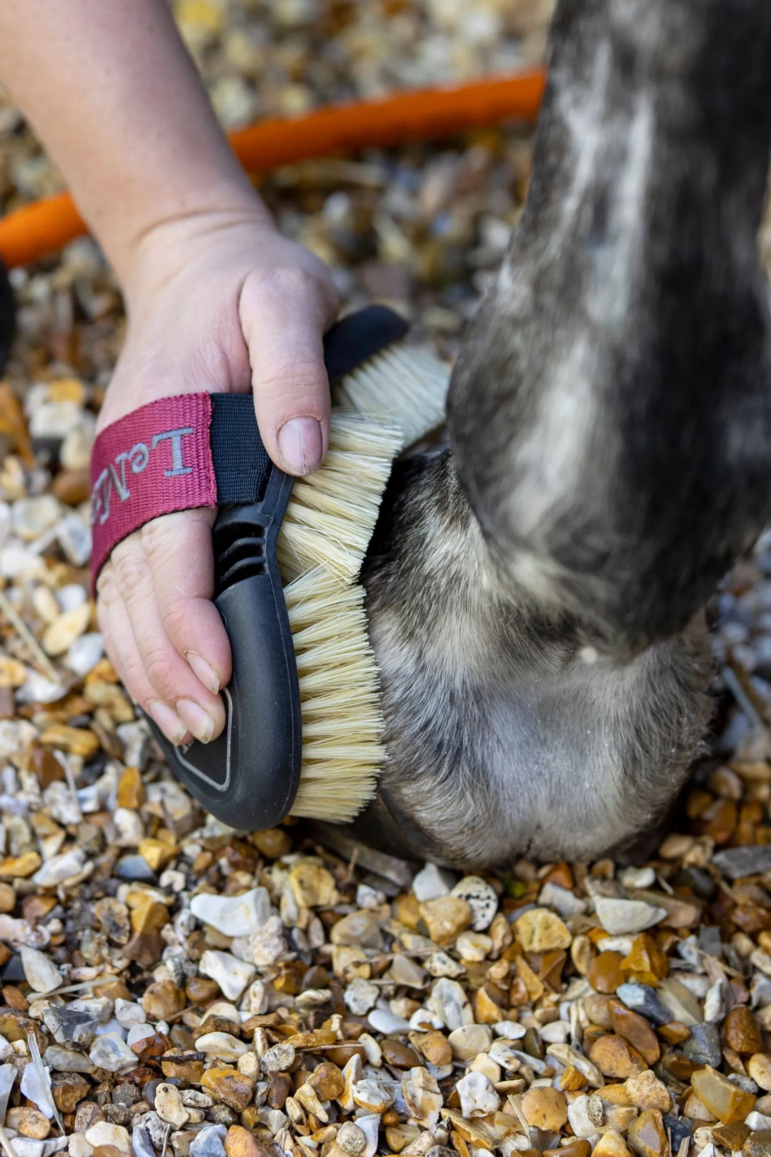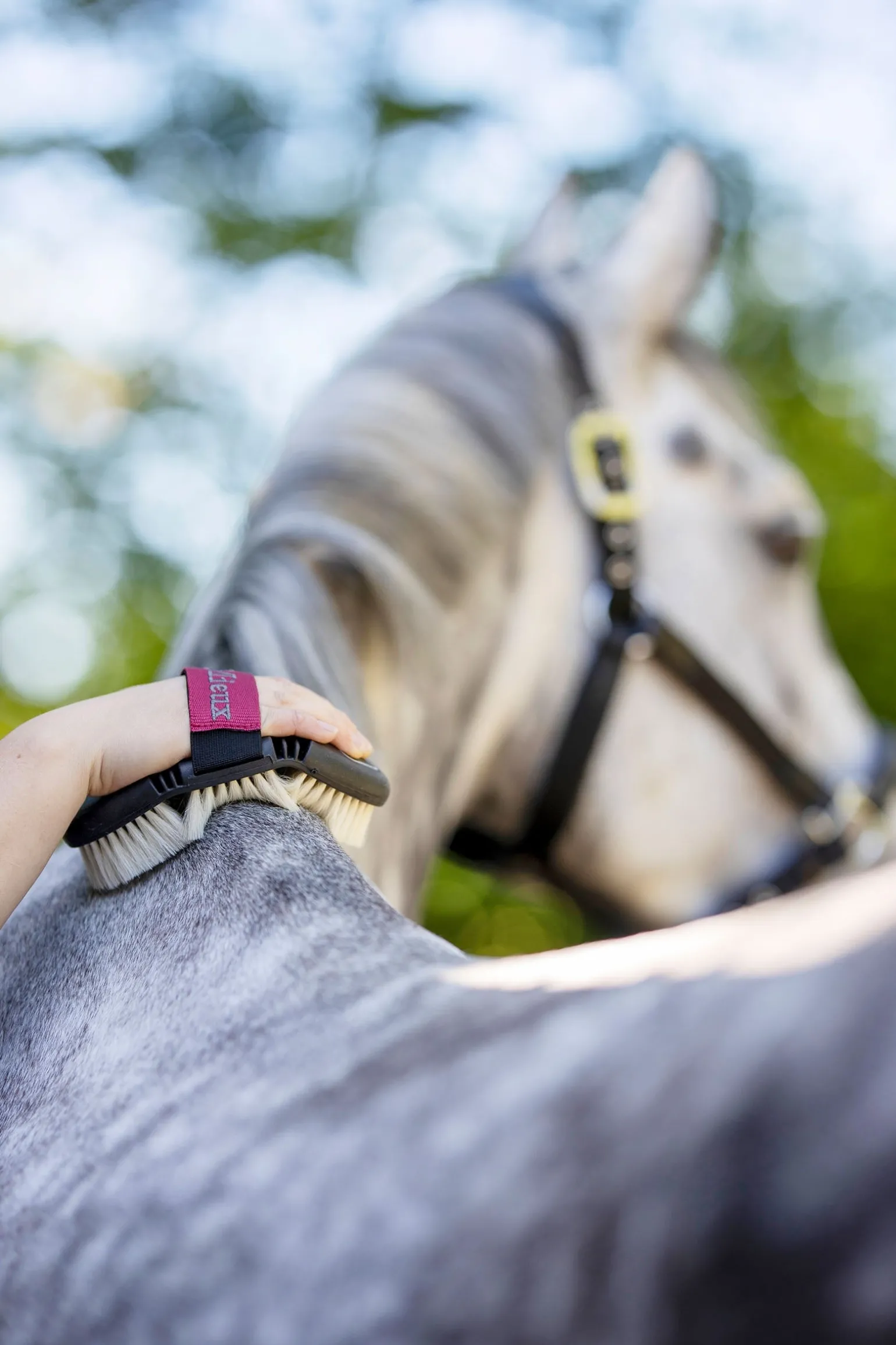 Die gröberen Borsten der LeMieux Flexi Reinigungsbürste machen selbst hartnäckigen Schmutz und Flecken im Fell deines Pferdes mühelos sauber. Durch die flexible Form erreichst du nahezu jede Körperstelle – auch schwer zugängliche Bereiche lassen sich problemlos reinigen. Die ergonomische Form liegt optimal in der Hand und entlastet das Handgelenk, während du dank des sicheren Griffs mehr Kontrolle beim Putzen hast. Ein elastisches Band sorgt für perfekten Halt.