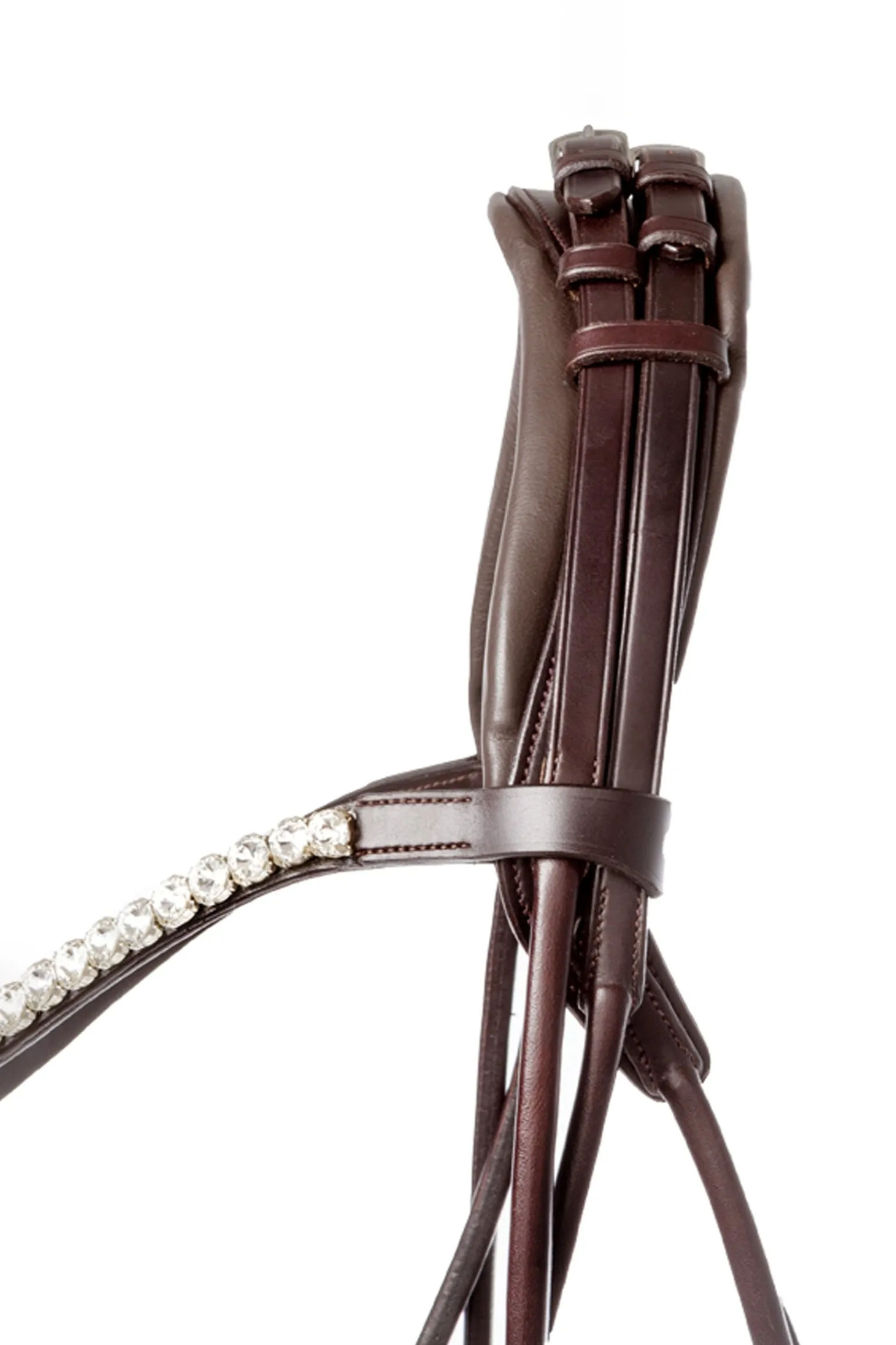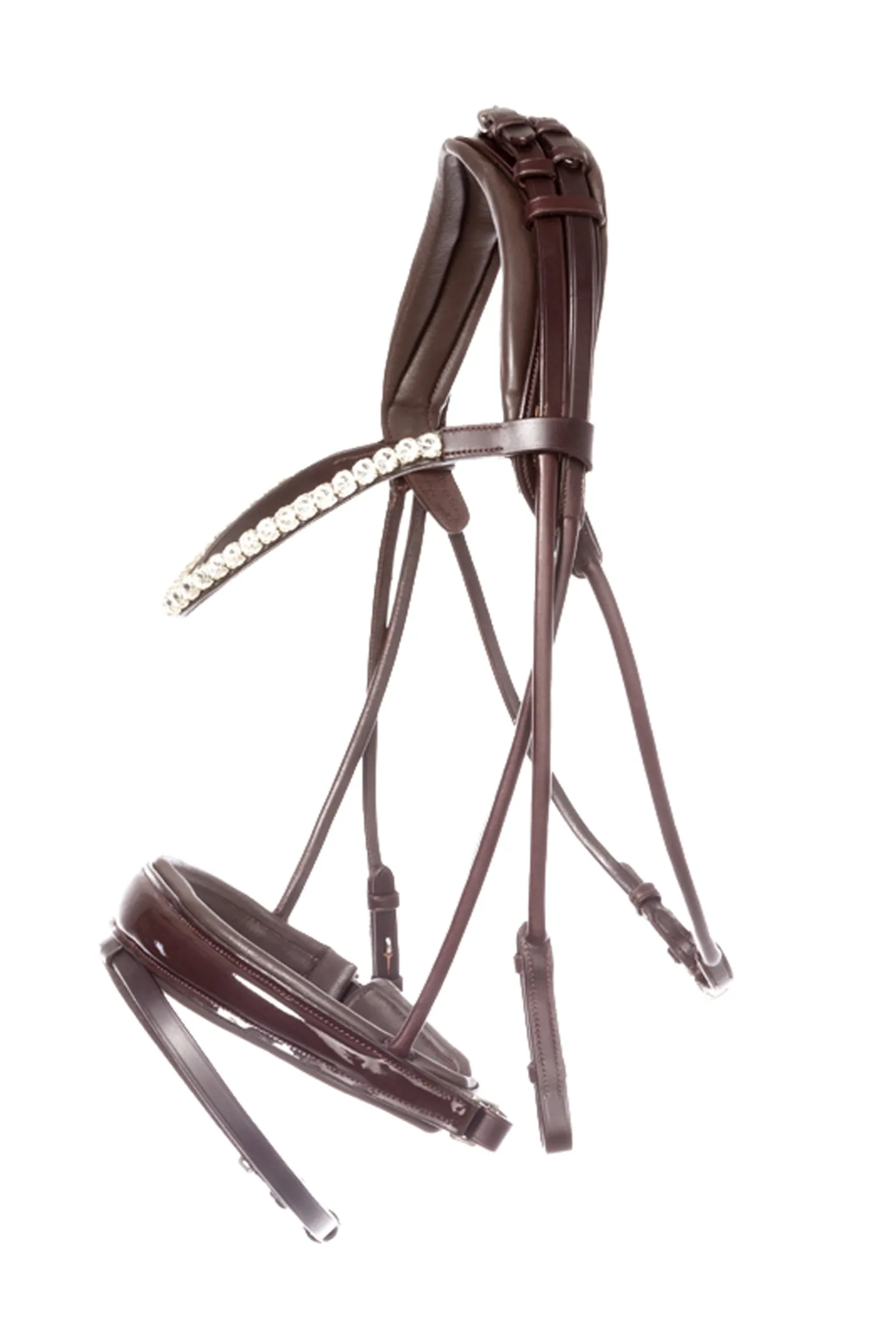Aus hochwertigem deutschen Qualitätsleder besticht der Trensenzaum „Florina KavalSH4“ durch seine Eleganz: Die rundgenähten Seitenriemen, das geschwungende Stirnband mit großen weißen Strasssteinen und der breite Nasenriemen mit Lack lassen die Trense an jedem Pferdekopf einzigartig aussehen. Das besonders anatomische und gepolsterte Genickstück sorgt gleichzeitig für einen hohen Tragekomfort. Der Trensenzaum „Florina KavalSH4“ wird ohne Zügel geliefert.