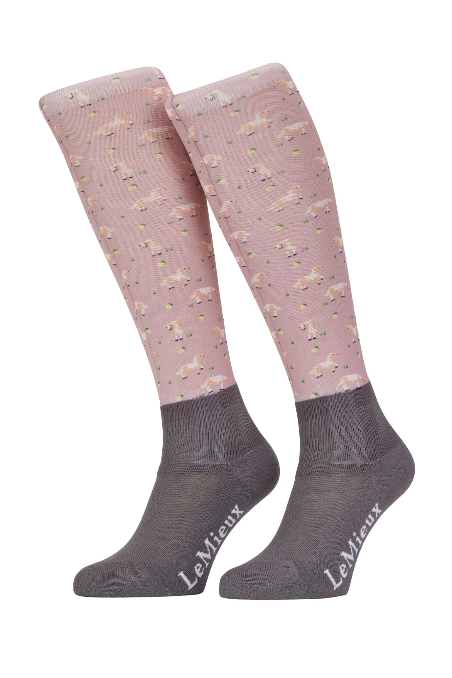 LeMieux Footsie Socken bieten ultimativen Komfort und Funktionalität für Reiter. Die gepolsterte Sohle mit elastischen Bereichen um den Fuß sorgt für optimalen Halt und Dämpfung. Zusätzliche Polsterung im Knöchelbereich schützt vor Druckstellen, während das feuchtigkeitsableitende Garn die Füße angenehm trocken hält. Der farbenfrohe, ultradünne Wadenbereich sorgt für eine perfekte Passform in engen Stiefeln und verleiht den Socken einen stilvollen Look. Ideal für den täglichen Gebrauch im Stall und beim Reiten.