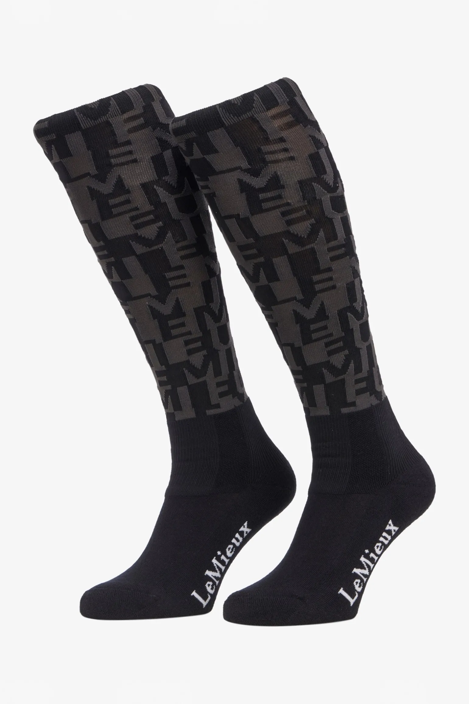 Die LeMieux Footsie Socken bieten ultimativen Komfort und ausgefallenen Stil. Der dicke Sohlenbereich sorgt für ein weiches Polster, während die elastischen Abschnitte um den Fuß den Reiter*innen Stabilität und Halt geben. Extra gepolsterter Knöchelbereich verhindert Druckstellen unter dem Stiefel. Der Footsie aus feuchtigkeitsableitendem Garn sorgt das ganze Jahr über für Komfort. Der ultradünne Wadenbereich sorgt für ein eng anliegendes Tragegefühl, ohne im Stiefel aufzutragen, und bietet gleichzeitig rutschfesten Halt. Diese originellen Socken sind in Farben erhältlich, die sich mit unseren Base Layers kombinieren lassen, und bringen deinen Reitstil perfekt zum Ausdruck.