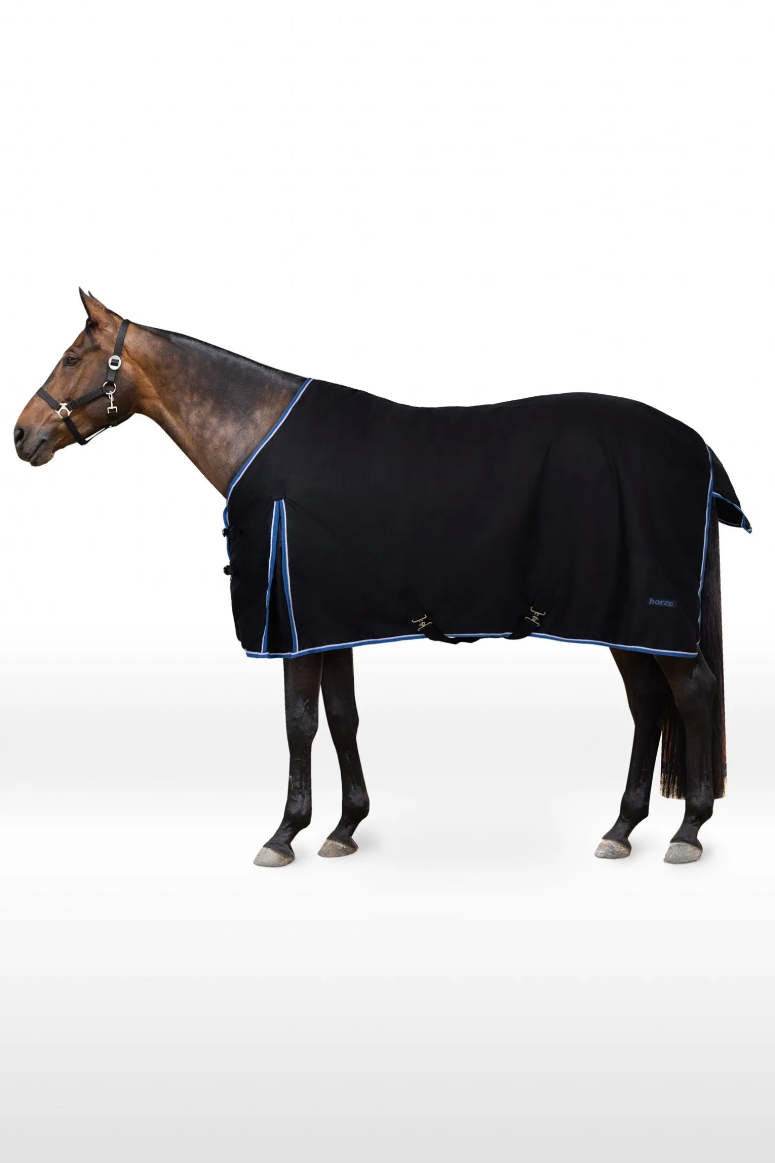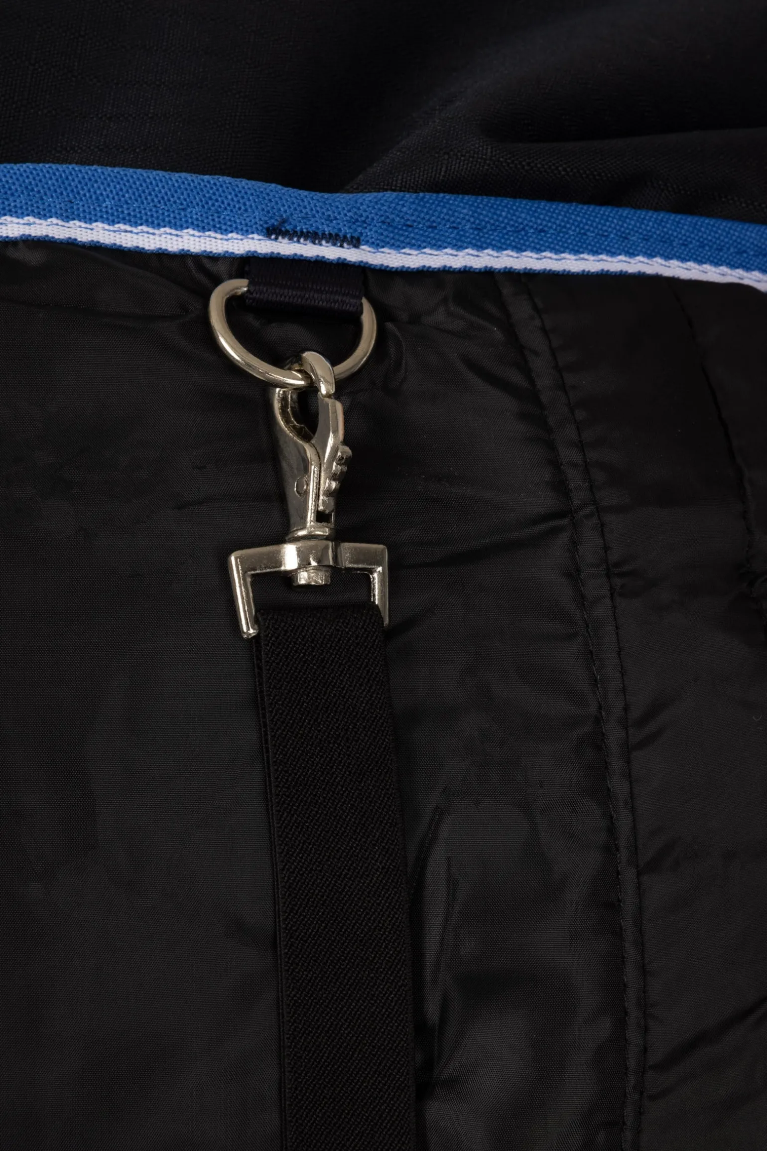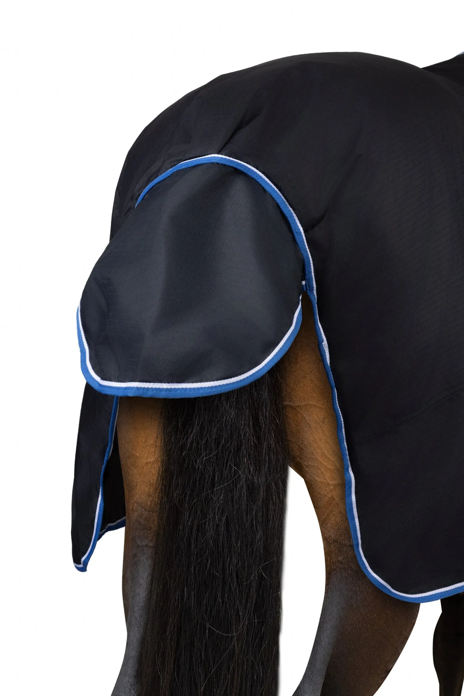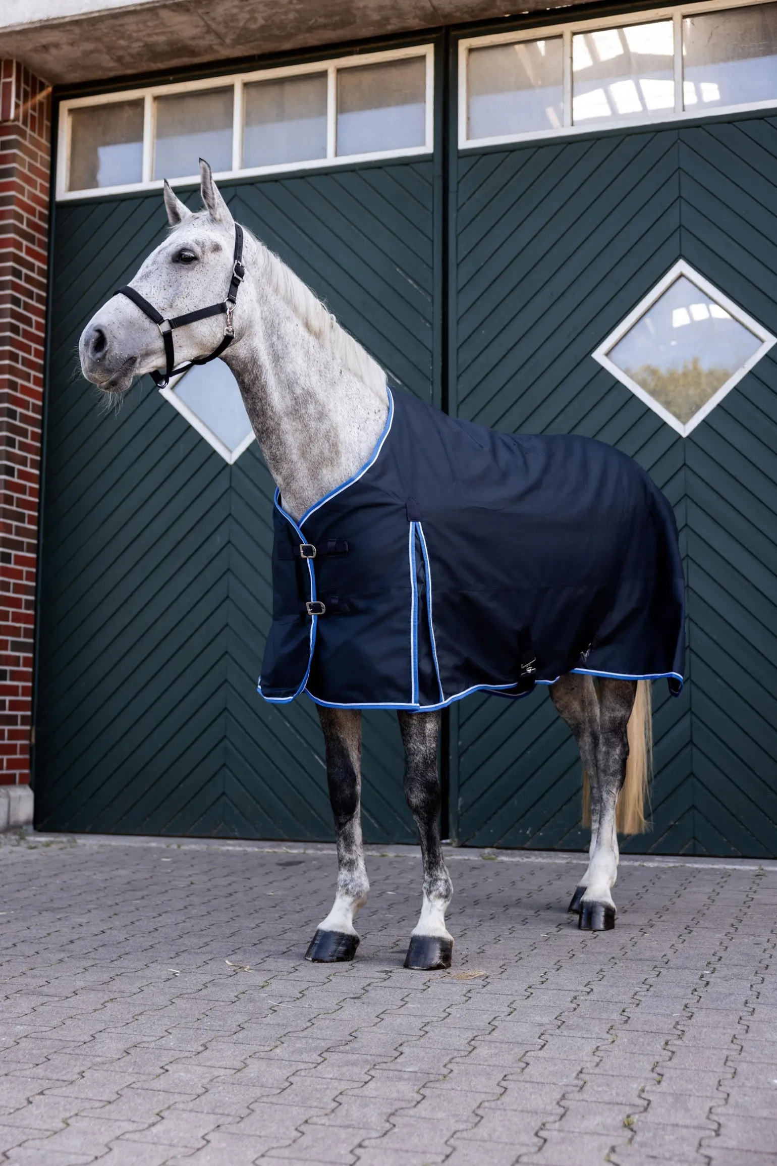 Diese Decke ist aus wasserdichtem, atmungsaktivem Material gefertigt. Der gute Sitz an Hals und Schultern macht sie bequem und die hohen Gehfalten bieten Bewegungsfreiheit, damit sich dein Pferd austoben kann und nicht eingeschränkt wird. Frontverschlüsse, Kreuzgurte und Beinschnüre halten die Decke sicher an ihrem Platz und verhindern Verrutschen.