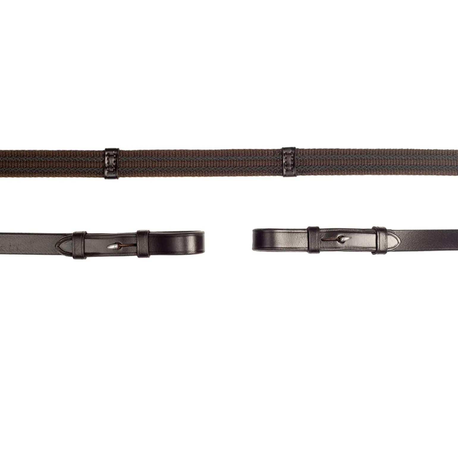 Die Zügel GRIP REINS sind mit Gummi durchzogen. Zur Ausstattung gehören Zaumhaken und Lederstege.