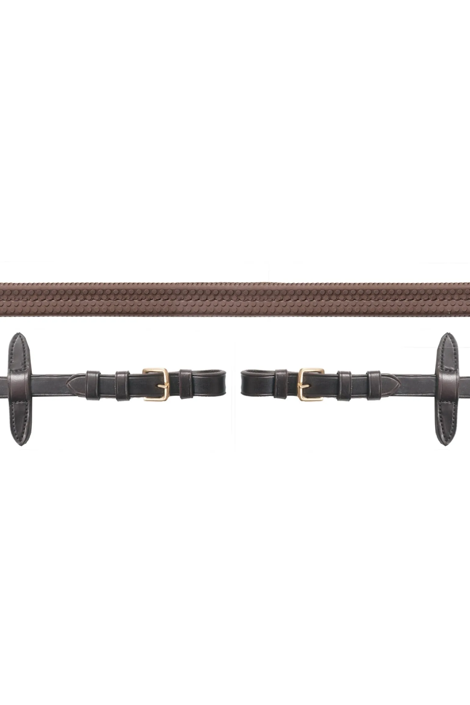 Einfache Gummizügel mit Schnalle und einer mittleren Breite von 17 mm. Die Zügel liegen angenehm in der Hand und werden mit Martingalstoppern geliefert.
