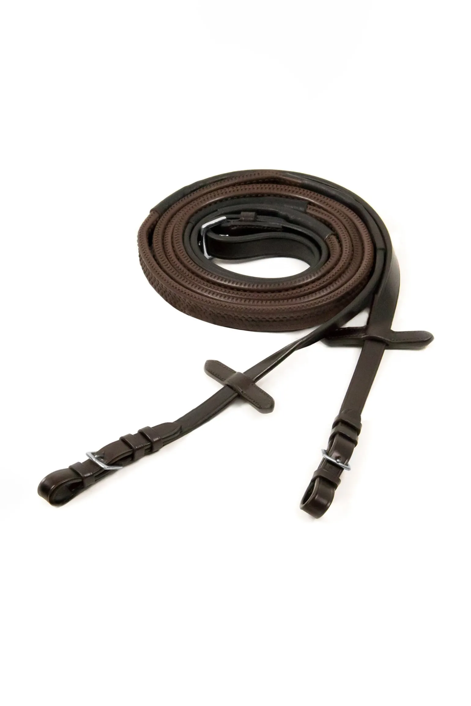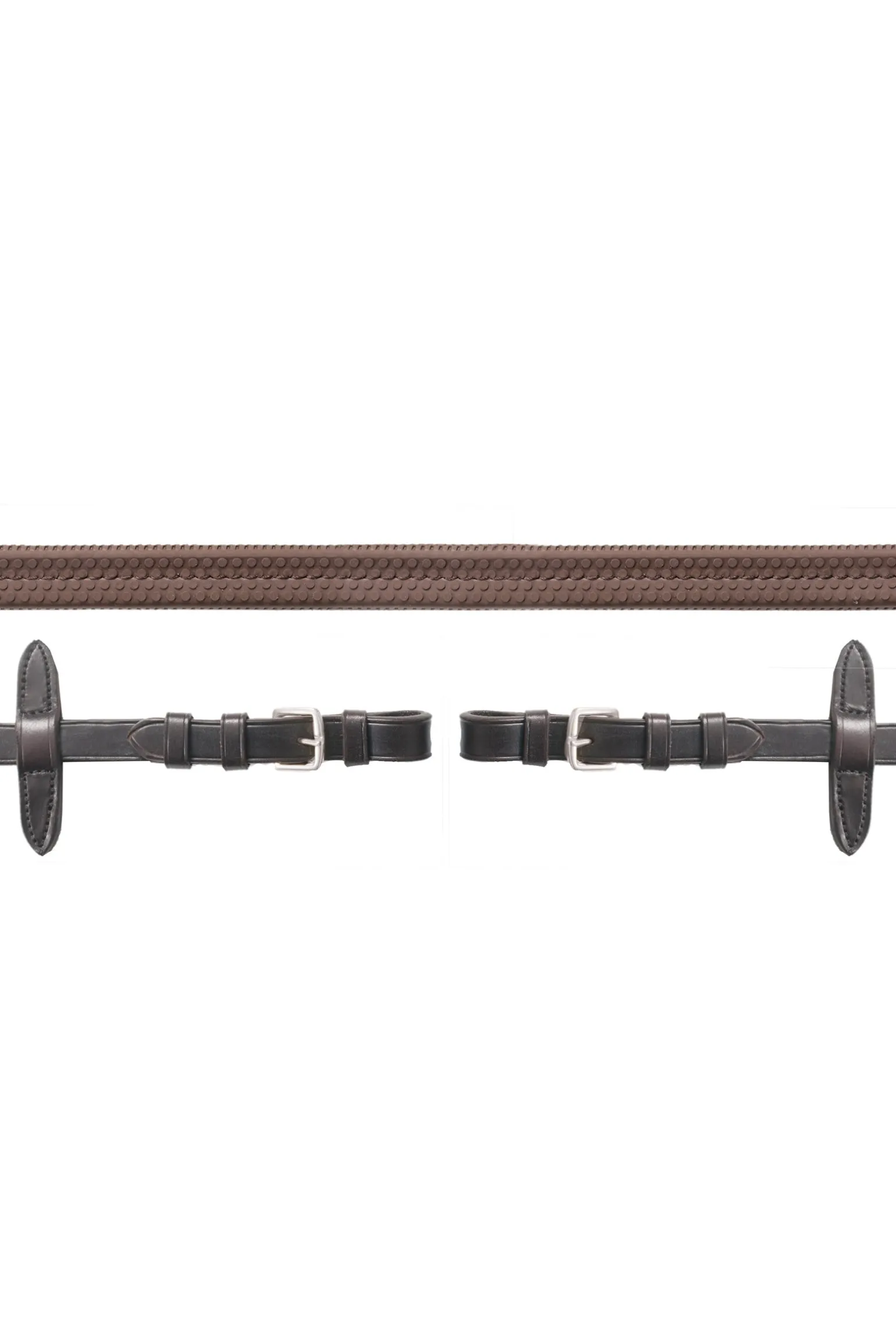 Einfache Gummizügel mit Schnalle und einer mittleren Breite von 17 mm. Die Zügel liegen angenehm in der Hand und werden mit Martingalstoppern geliefert.