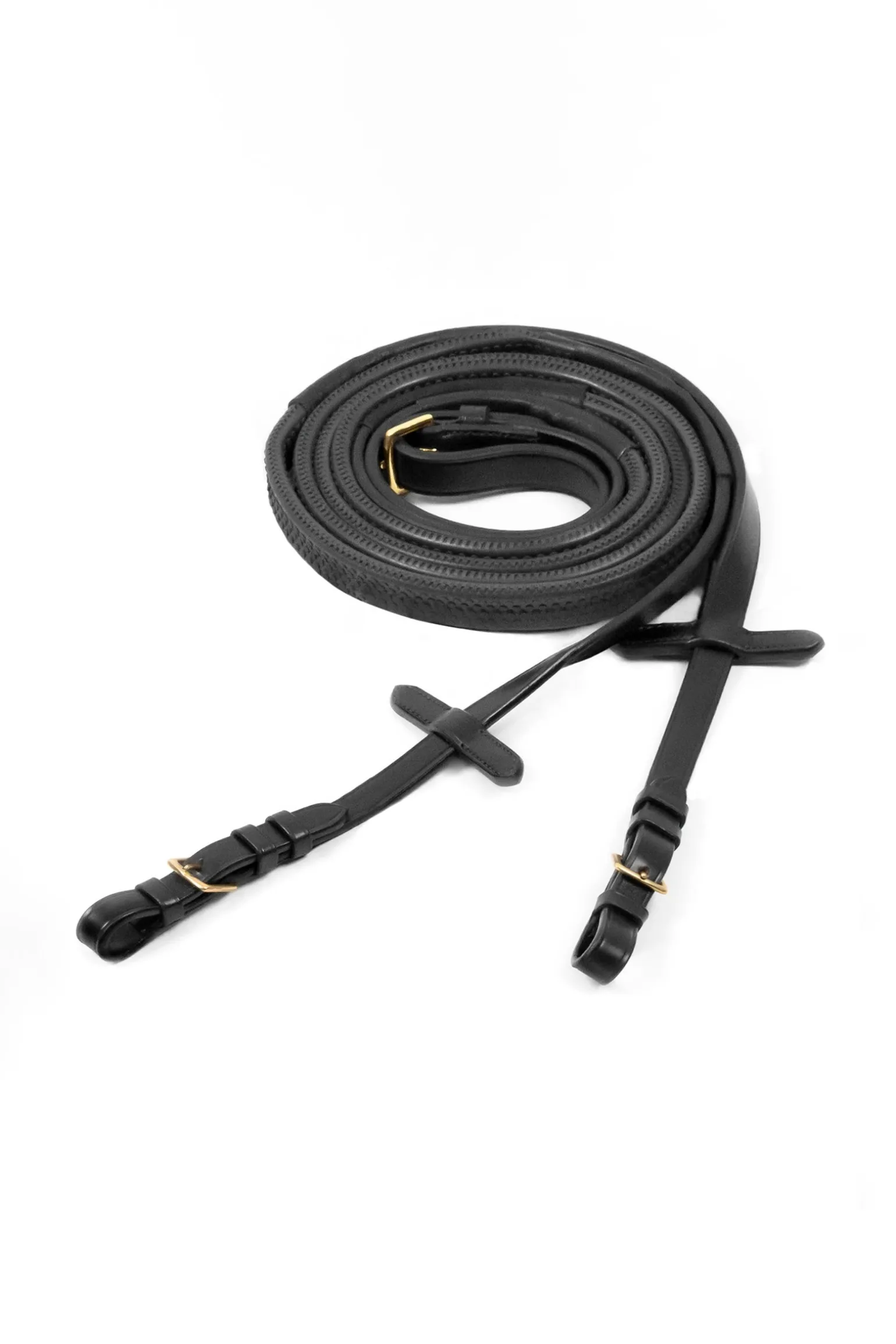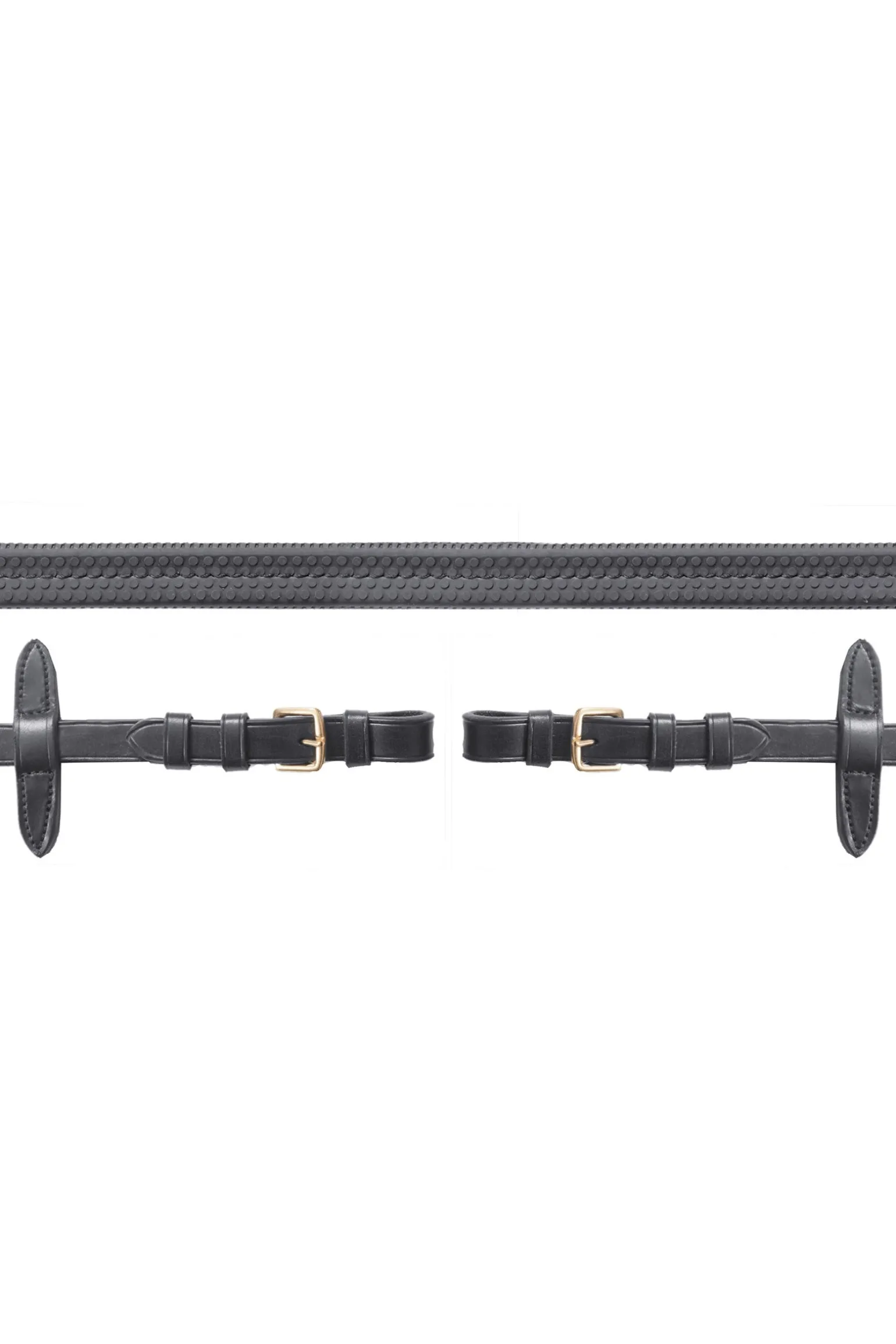 Einfache Gummizügel mit Schnalle und einer mittleren Breite von 17 mm. Die Zügel liegen angenehm in der Hand und werden mit Martingalstoppern geliefert.