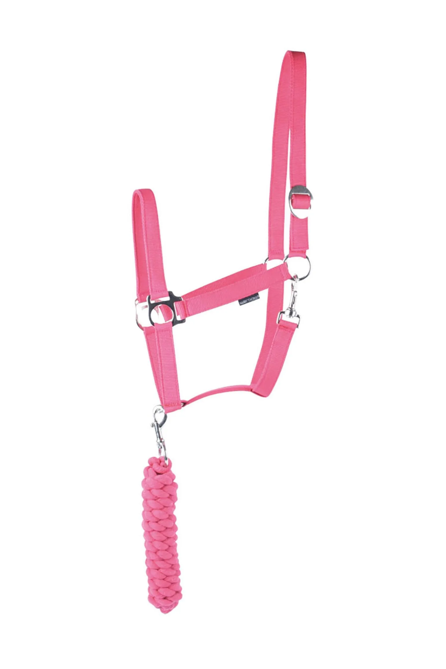 Basis-Halfter mit vernickelten Beschlägen. Das Halfter ist am Kopfstück mittels Schiebeschnalle verstellbar. Länge Führstrick: 180 cm.