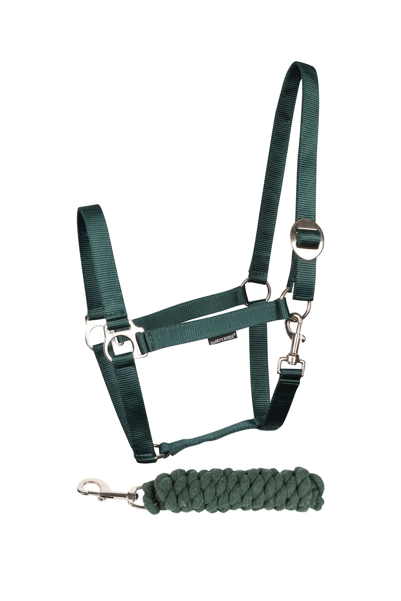 Basis-Halfter mit vernickelten Beschlägen. Das Halfter ist am Kopfstück mittels Schiebeschnalle verstellbar. Länge Führstrick: 180 cm.
