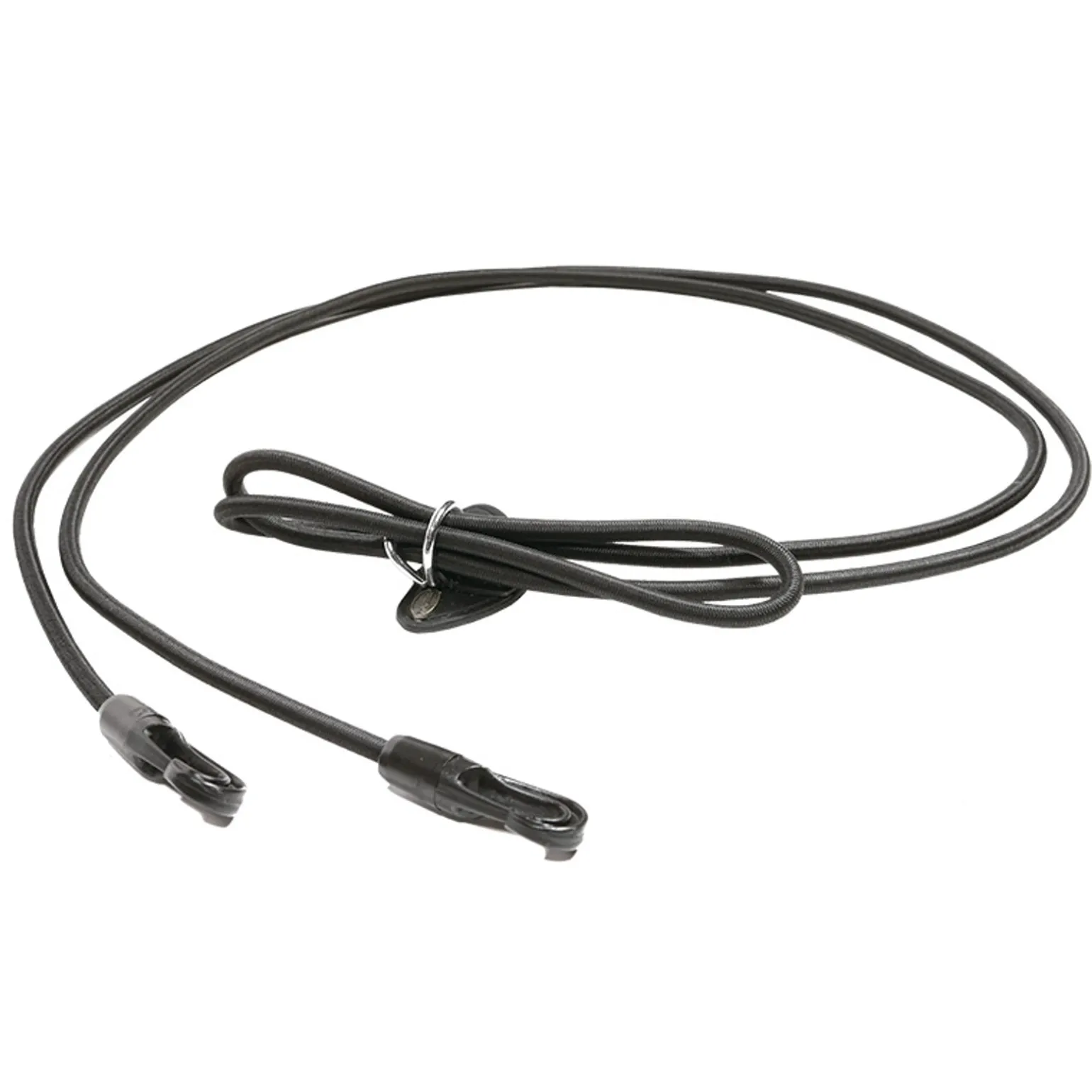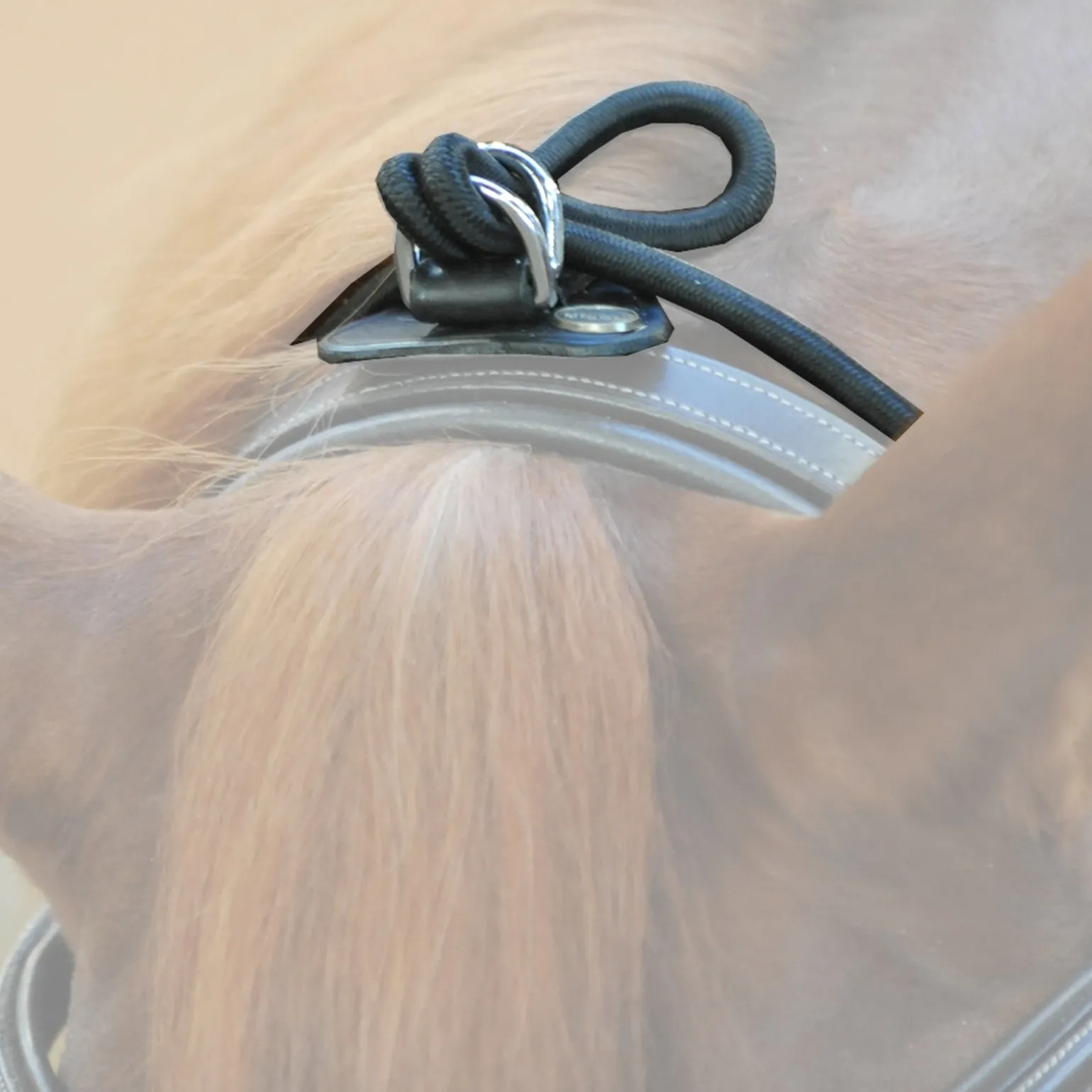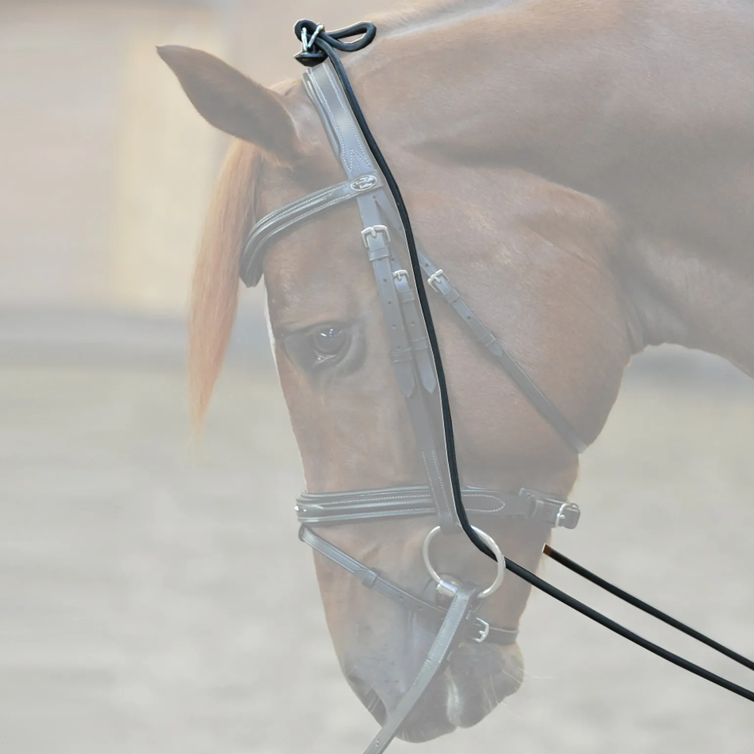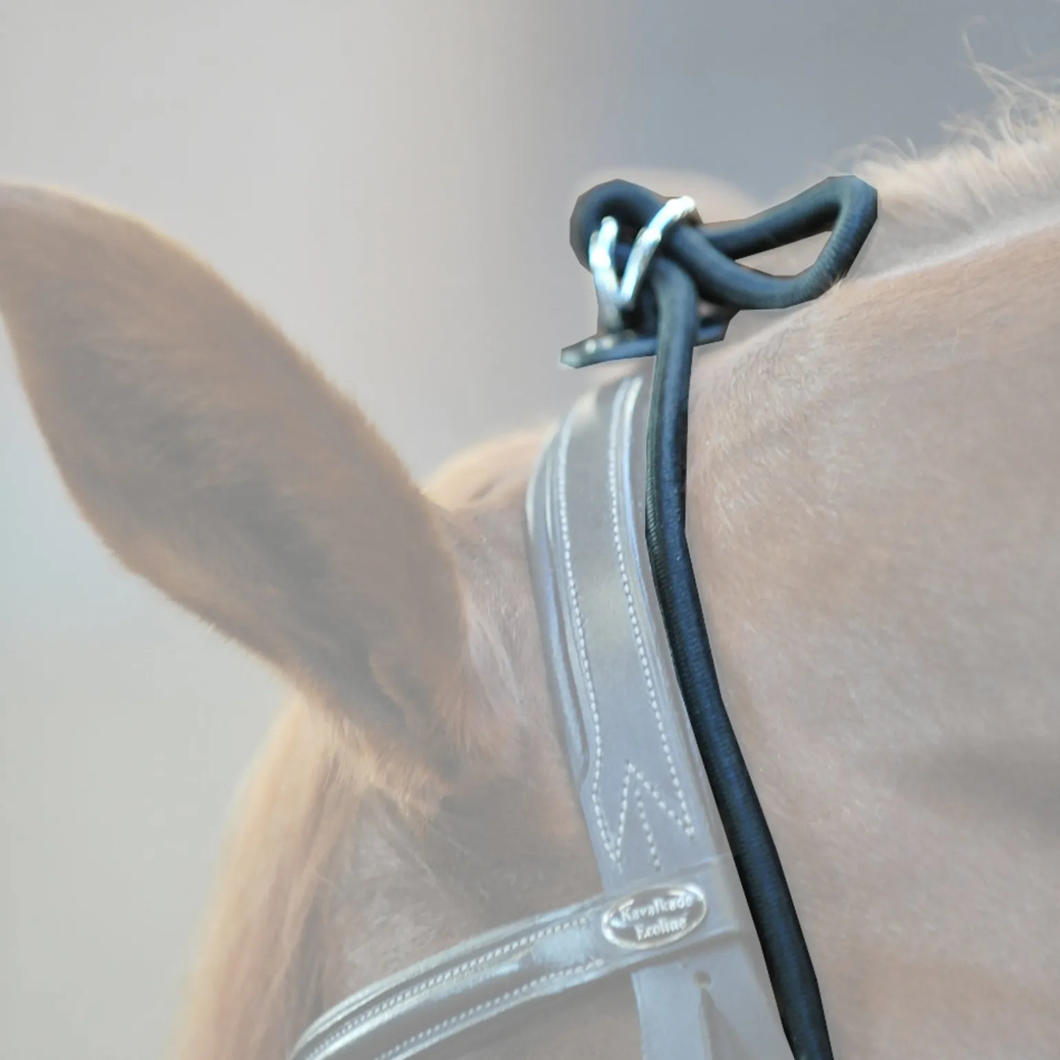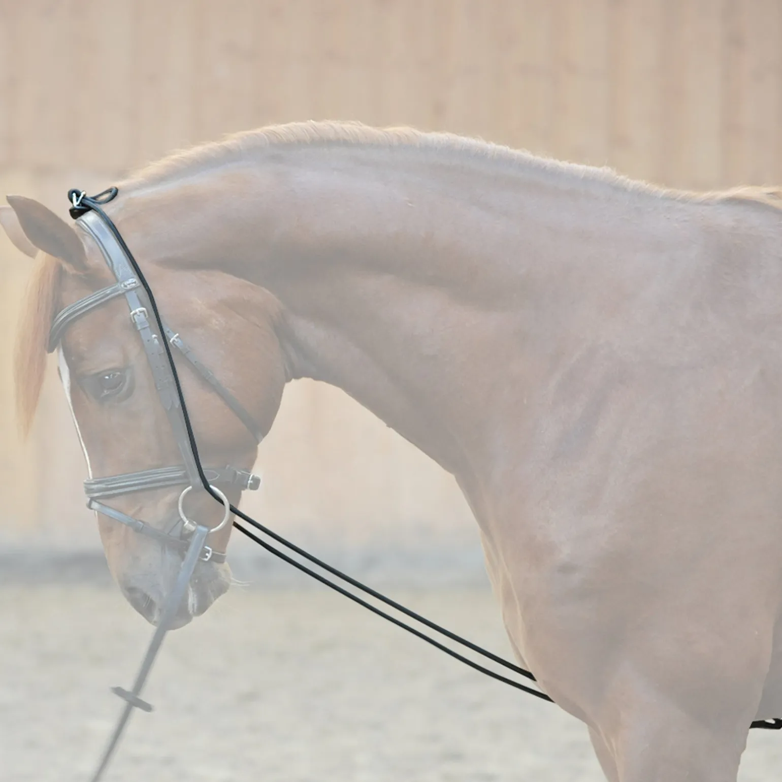 Beim Halsverlängerer in Universalgröße handelt es sich um einen Hilfszügel aus vollelastischem Material, der auf einer Seite am Sattelgurt unter dem Sattelblatt befestigt wird, dann durch die Trensenringe gezogen über das Genick führt, auf der anderen Seite wieder durch den Trensenring zurück zum anderen Sattelgurt verläuft. Statt der Befestigung direkt unterhalb des Sattelblatts ist auch das Durchführen zwischen den Vorderbeinen mit Befestigung am Sattelgurt unter der Brust möglich. Wie der Name andeutet, soll der Halsverlängerer Pferde, die sich der Anlehnung entziehen, zur Streckung nach vorne-abwärts verleiten.Er eignet sich besonders für die Arbeit an der Longe, da viele Pferde nach kurzer Zeit eine angenehme Rückentätigkeit entwickeln und locker „in die Tiefe“ laufen. Aber auch beim Reiten kann er unterstützend wirken und zum Beispiel Hals- oder Genickschwierigkeiten beheben. Der günstige Kavalkade-Halsverlängerer weist eine hervorragende Qualität und eine ideale Passform auf.