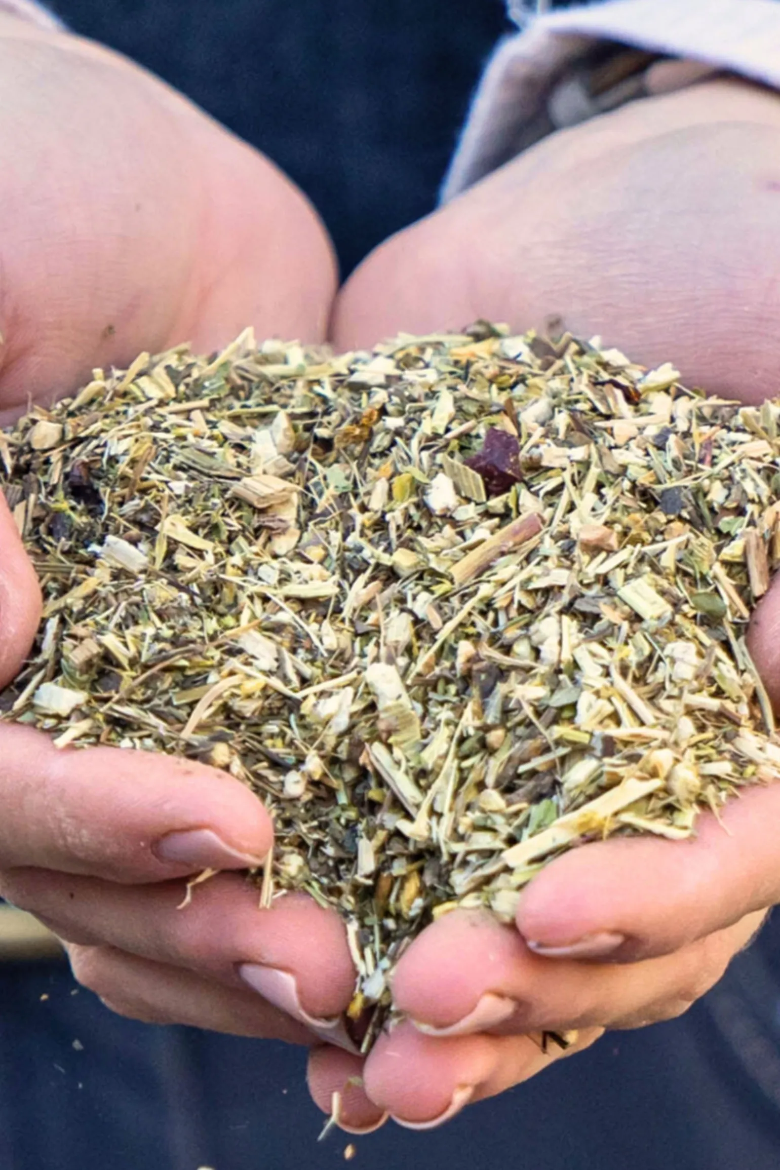 Zusammensetzung: 25 % Sonnenhutkraut, 25 % Goldrutenkraut geschnitten, 20 % Taigawurzel geschnitten, 10 % Hagebuttenschalen geschnitten, 10 % Süßholzwurzel ungeschält geschnitten, 10 % Pfefferminzblätter Bruch. Dopingrelevanz: 48 Stunden Karenzzeit. Lagerhinweis: Futtermittel kühl, trocken und vor direkter Sonneneinstrahlung geschützt lagern. Nach Anbruch zügig verbrauchen.