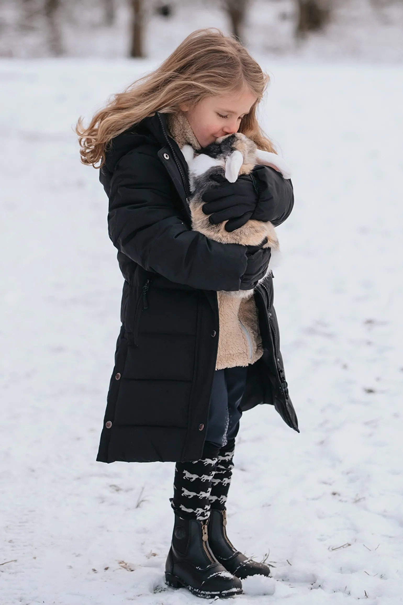 Langer, warmer, gepolsterter Mantel mit hohen Seitenschlitzen. Reflexdetails, Vordertaschen mit Reißverschluss. Schützende, abnehmbare Kapuze mit silberfarbener Fütterung.