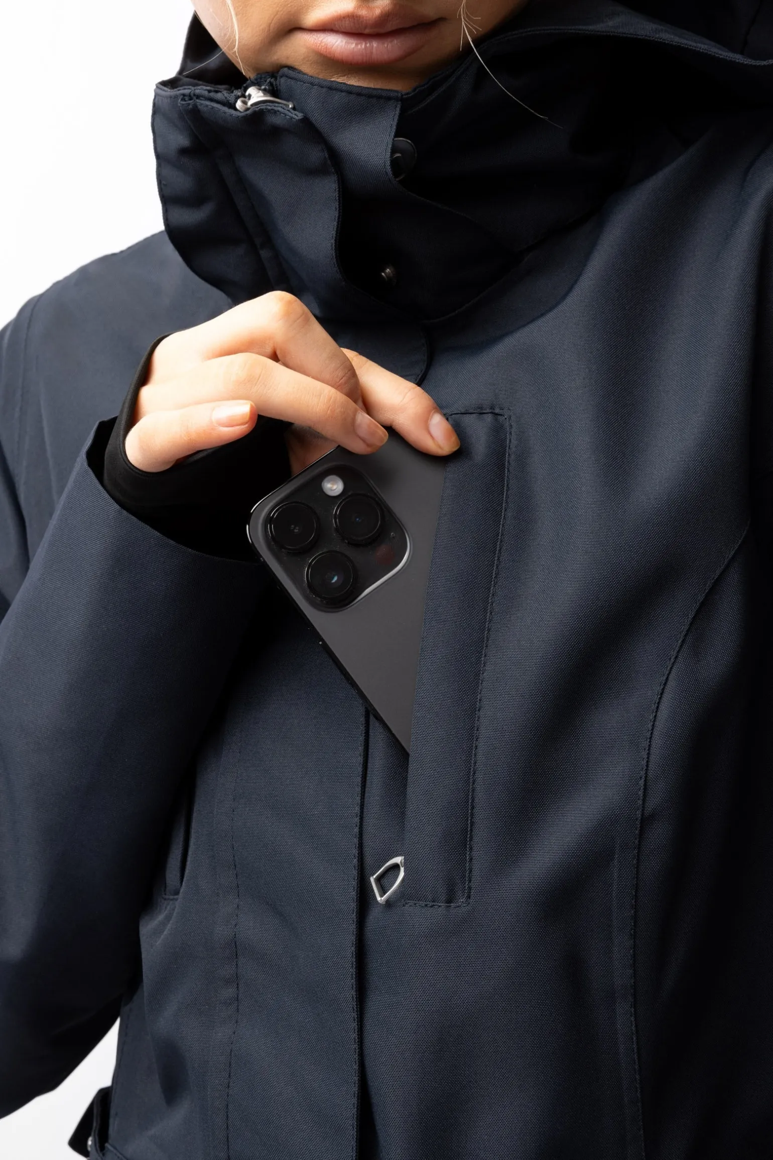 Ein stilvolles Design mit einer anliegenden Taille verleiht dieser Damenjacke einen schönen, individuellen Look. Die Taschen verstauen alles von Pferdeleckerli bis hin zu Schlüsseln und Handy. Das Horze Emblem auf der Schulter und feine Details wie Druckknöpfe und starke Nylonreißverschlüsse machen diese Qualitätsjacke langlebig und funktional sowie wunderschön. Das Material ist atmungsaktiv und wasserdicht und schützt dich vor warmen Sommerschauern. Der hintere Schlitz hilft, den Sattel zu schützen und erlaubt viel Bewegungsfreiheit. Eine abnehmbare Kapuze sorgt für noch mehr Comfort und flexible Anpassung an das Wetter. Die raffinierten Farben passen zu vielen Artikeln der saisonalen Kollektion.