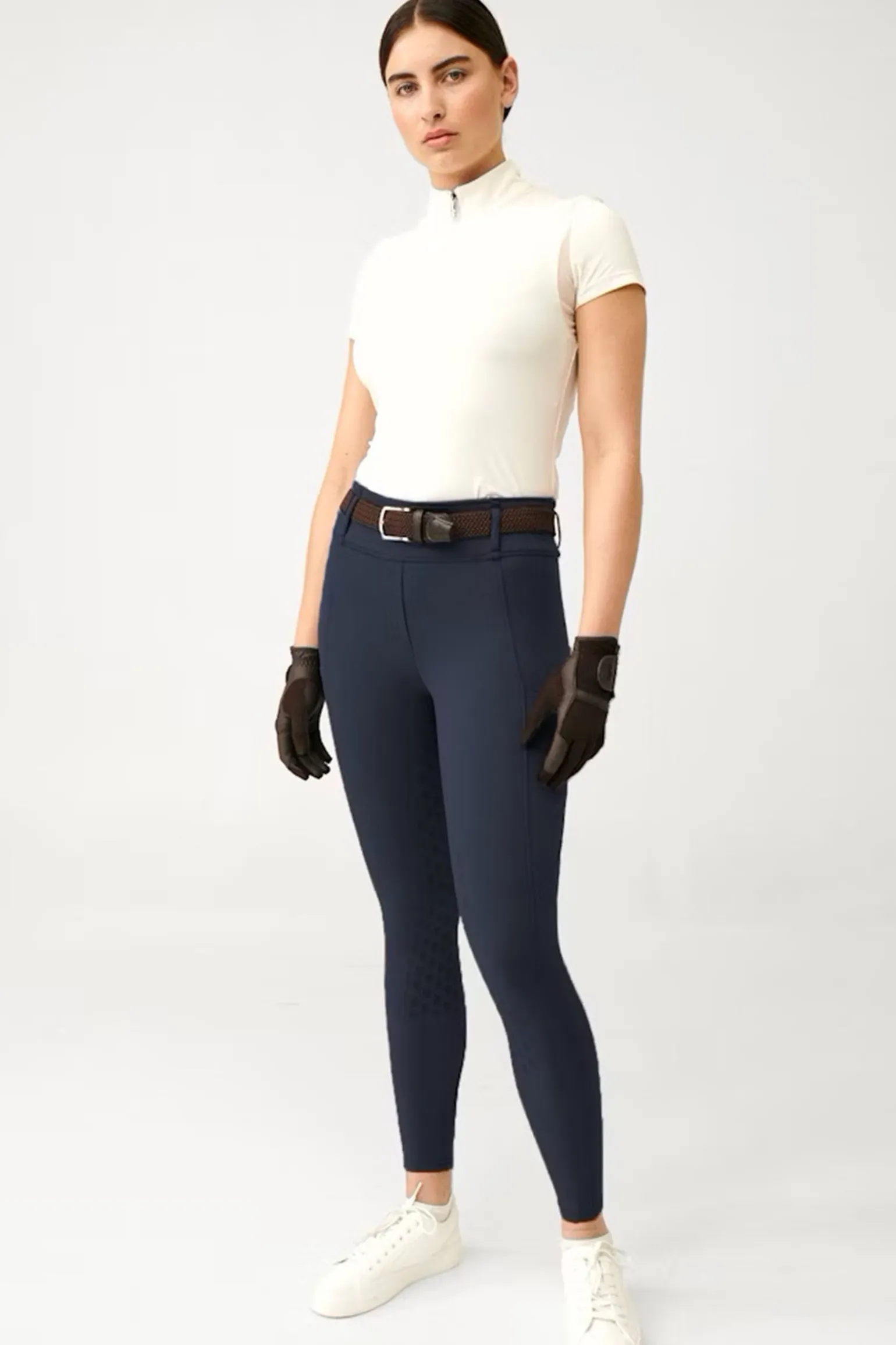 Neue Generation der meistverkauften Reitleggings mit halbem Grip, entworfen mit hohem Bund und einem breiten Shell-Stoff-Bund für perfekte Passform und Komfort. Hergestellt aus einem weichen, leicht glänzenden technischen Material, das überlegene Elastizität und Atmungsaktivität bietet.