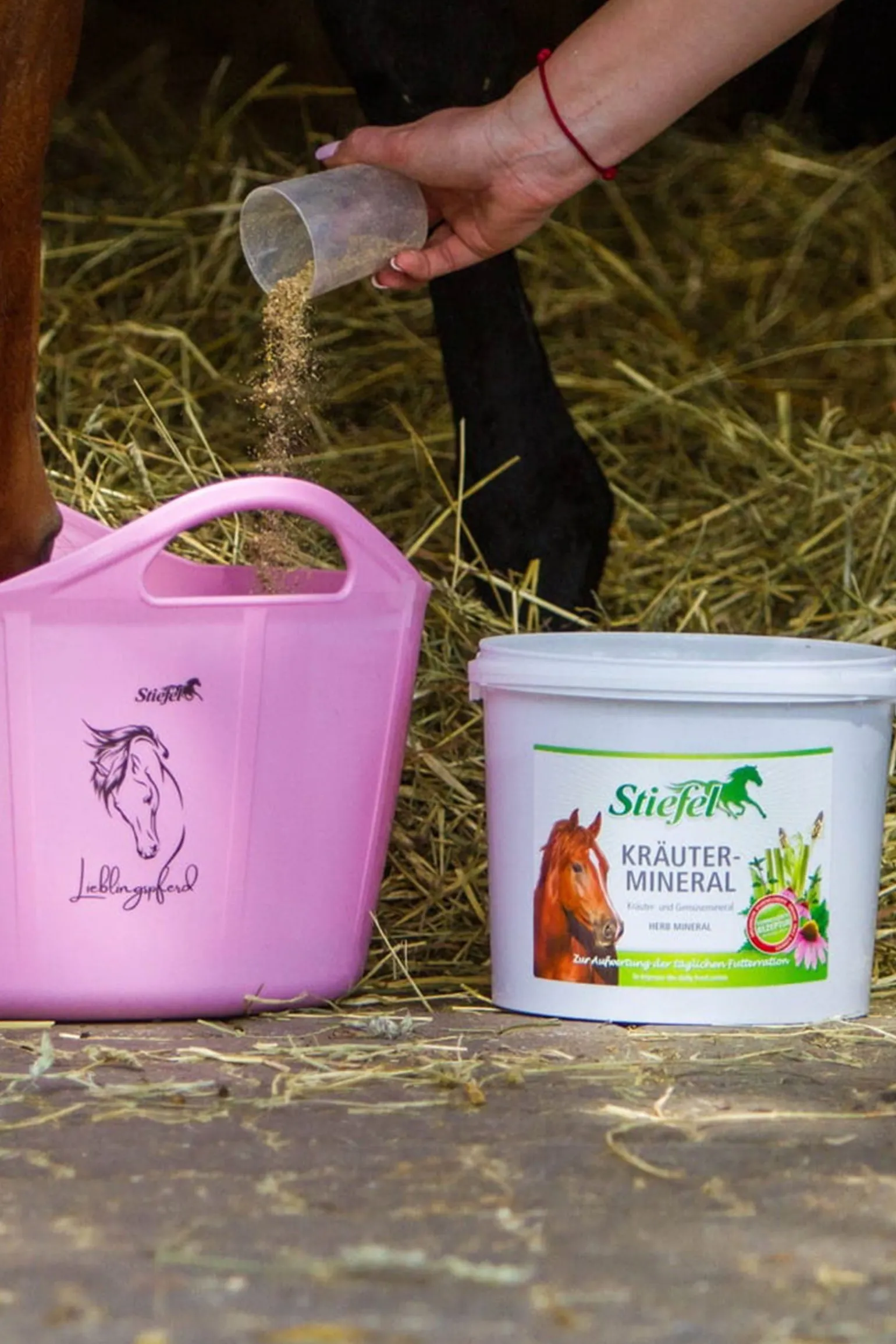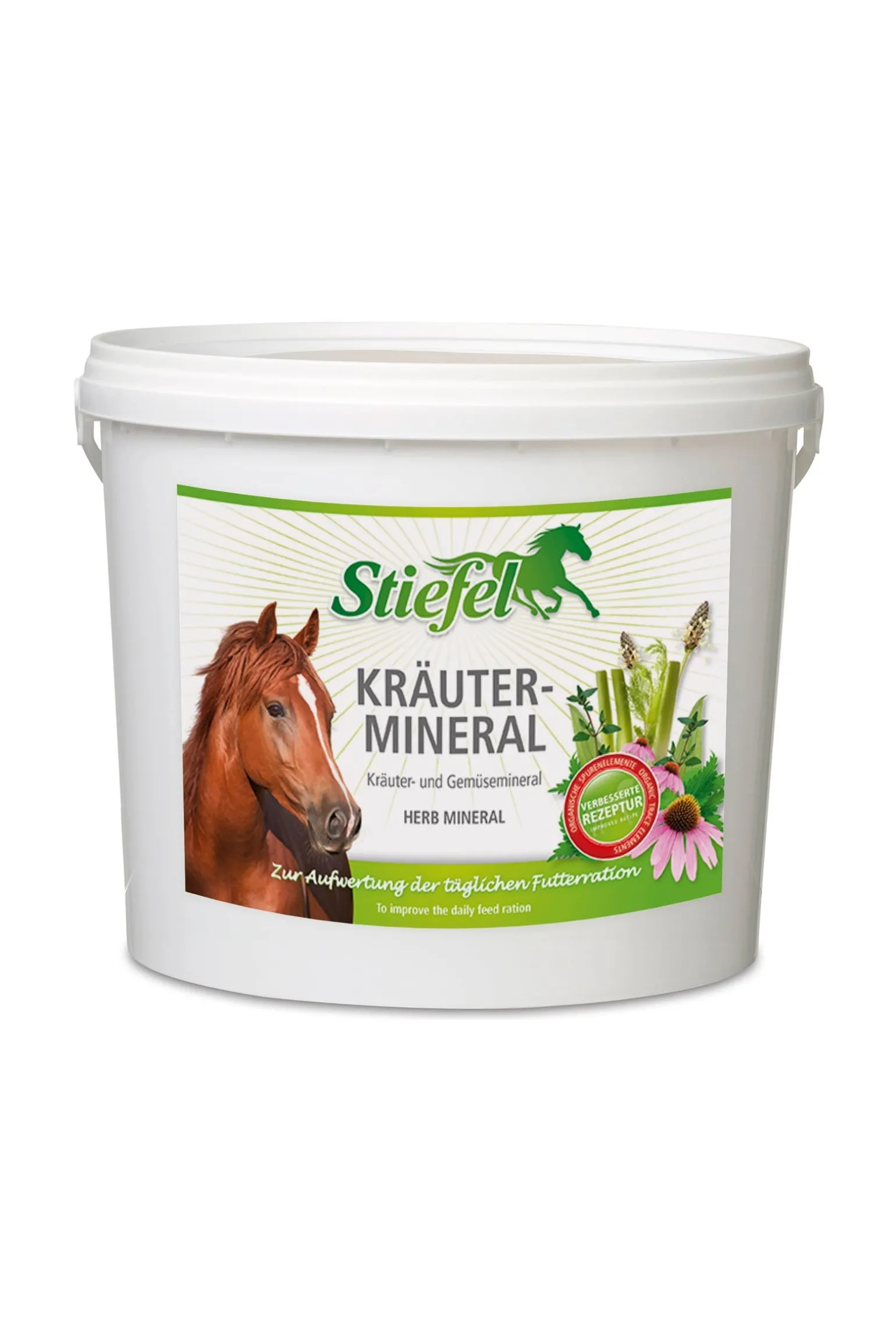 Stiefel Kräuter-Mineral ist ein Mineralfutter auf Kräuterbasis mit Möhrenflocken, Vitaminen, organischen Spurenelementen, das fütterungsbedingte Mangelerscheinungen ausgleichen und zur Verbesserung der Stoffwechselfunktion beitragen kann. Der Organismus wird damit auf natürlicher Basis fit gehalten, denn die enthaltenen organischen Spurenelemente können vom Körper optimal verwertet werden. Fütterungshinweis: Pferde (600 kg KGW) 100 – 150 g / tägl., Kleinpferde 50 – 75 g / tägl. (1 Messbecher 200 ml = ca. 100 g). Fütterungsdauer: Kann ganzjährig gefüttert werden. Dieses Futtermittel darf wegen der gegenüber Alleinfuttermitteln höheren Gehalte an Futtermittelzusatzstoffen nur bis zu 250 g täglich verfüttert werden.