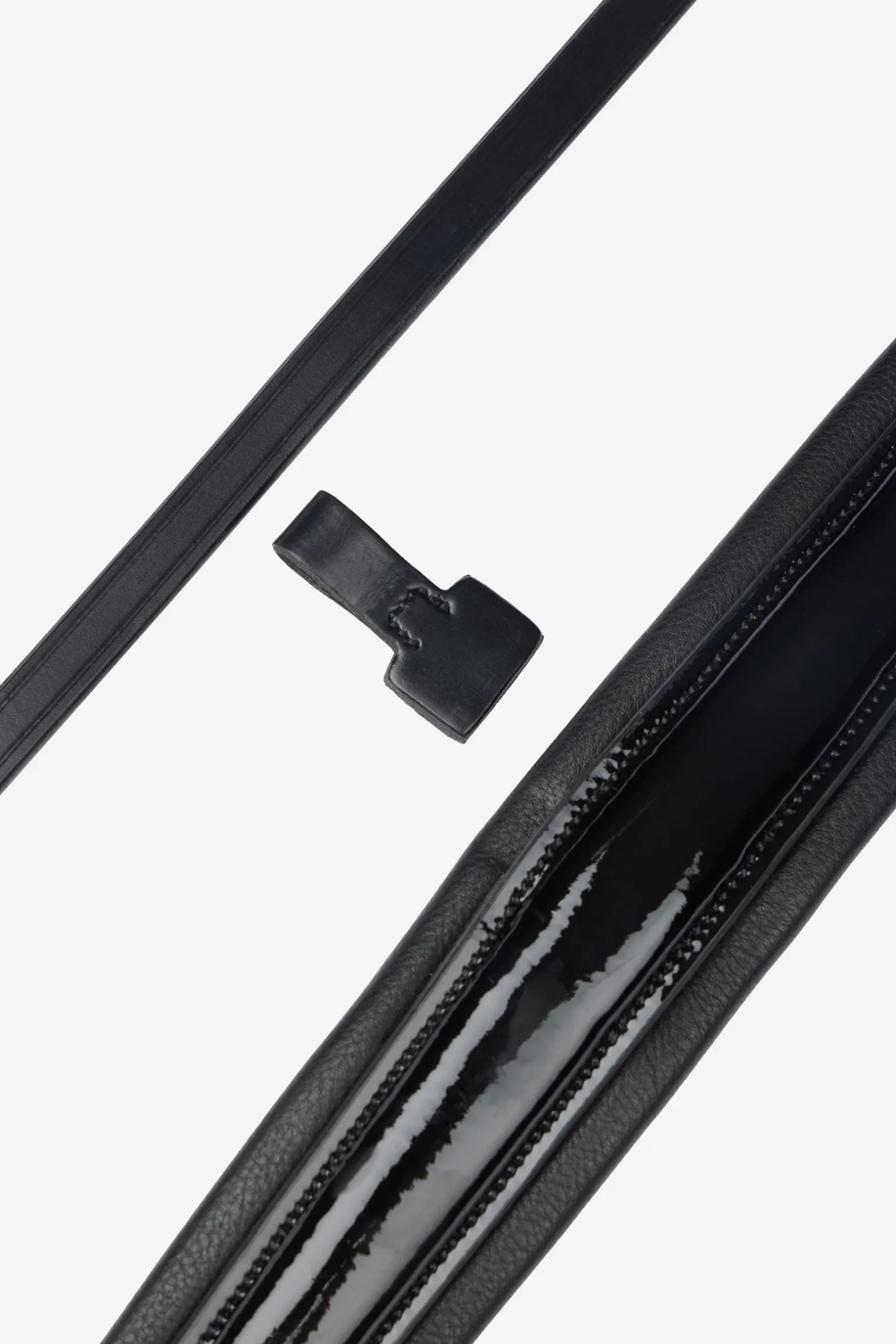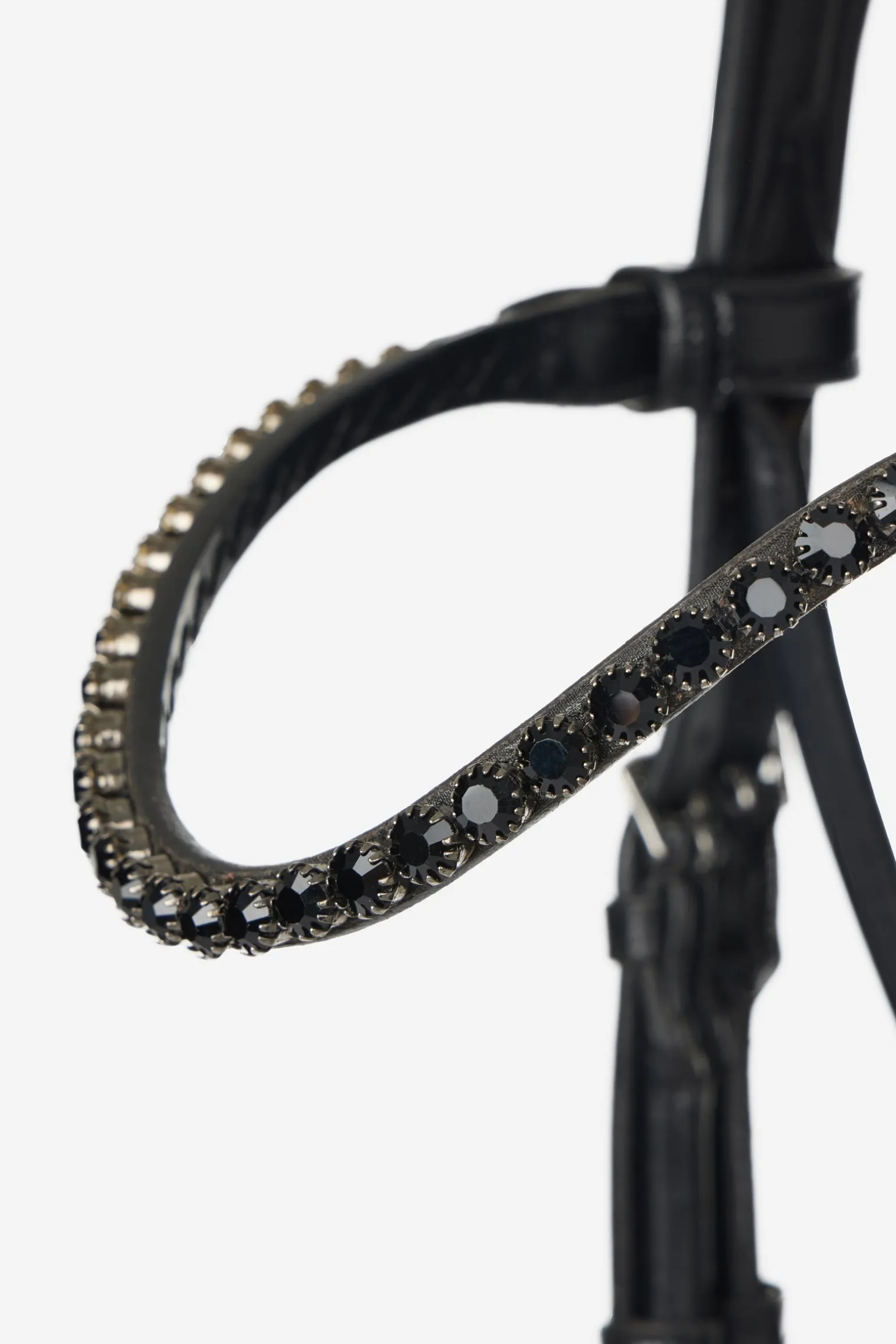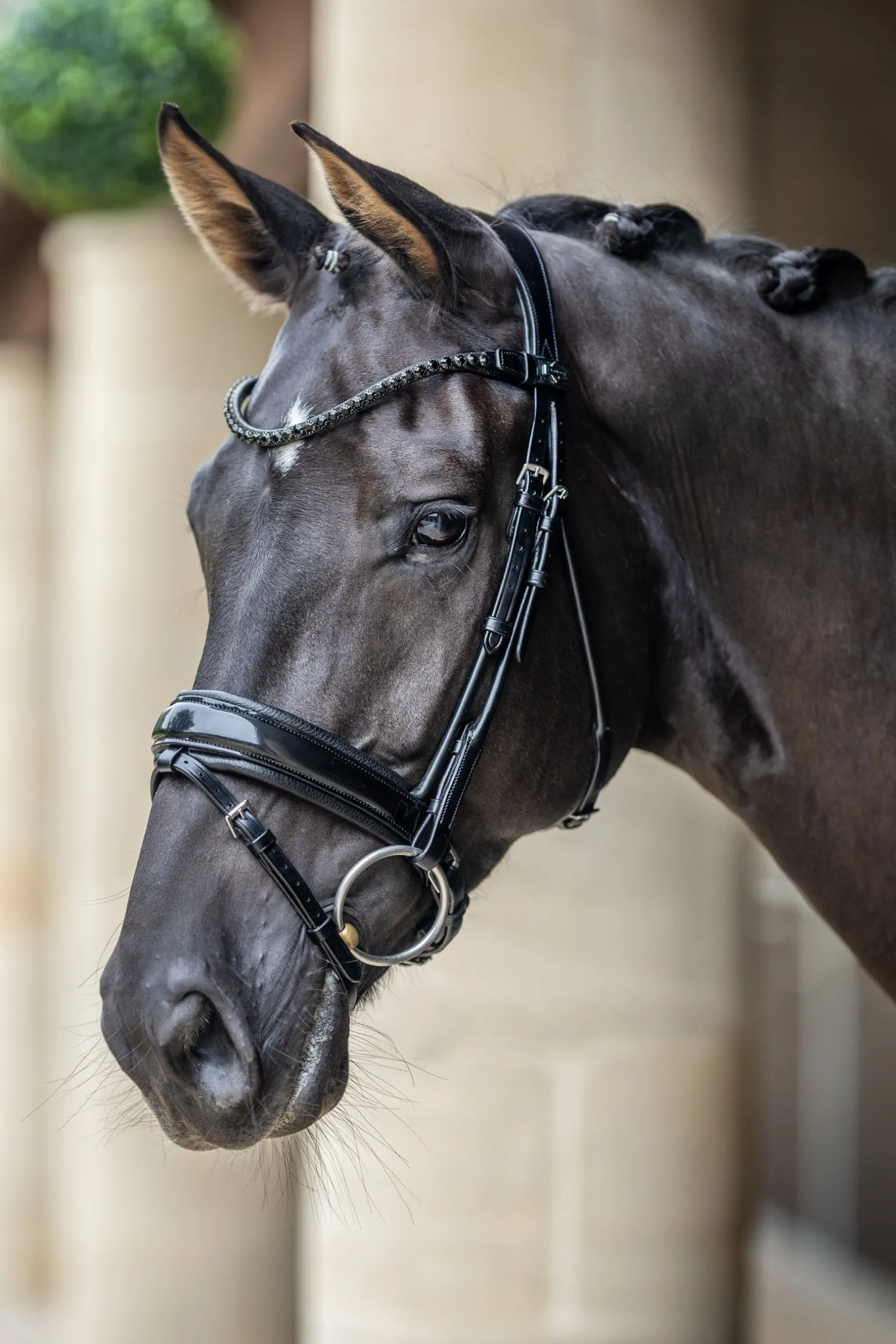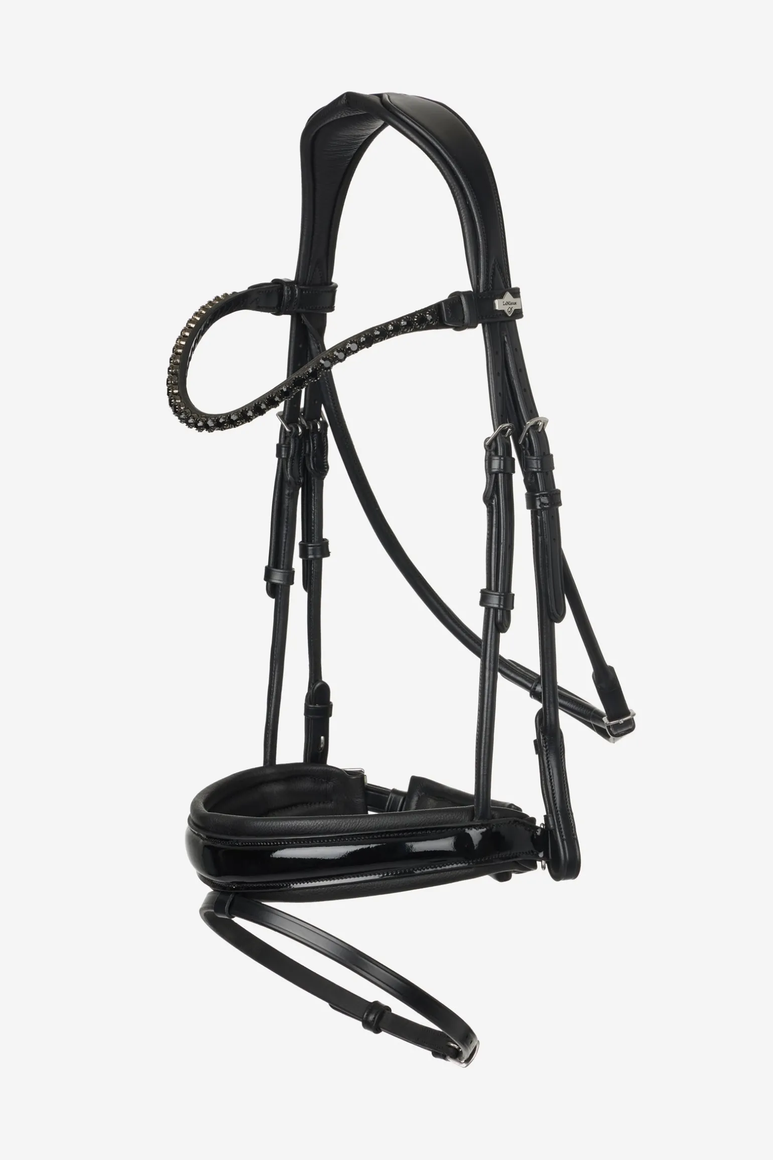 Diese spezielle Dressurkandare wird aus hochwertigem, vorgeöltem italienischem Leder gefertigt und verfügt über rundgenähte Elemente sowie einen abnehmbaren Sperrriemen. Das anatomisch geformte, gepolsterte Genickstück bietet angenehme Freiheit hinter den Ohren und verteilt den Druck gleichmäßig über das Genick. Das abnehmbare Stirnband mit Clincher-Details ist geschwungen, weich gepolstert und mit Kristallen verziert – für eleganten Tragekomfort. Das Reithalfter mit Lackbesatz und Umlenkverschnallung ist besonders gut gepolstert. Rollenschnallen am Kinnriemen und Sperrriemen ermöglichen eine präzise Anpassung – ideal für eine feine Einwirkung. Eine Kandare mit Ausdruck, die deinem Auftritt eine dezente, turniergerechte Eleganz verleiht.